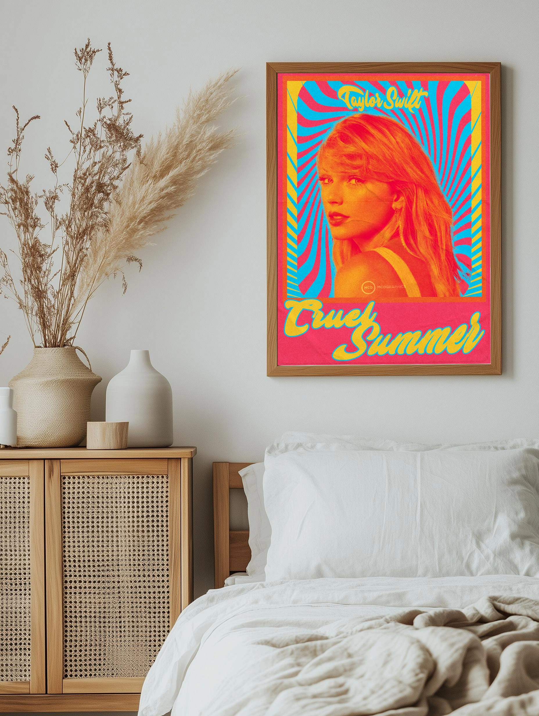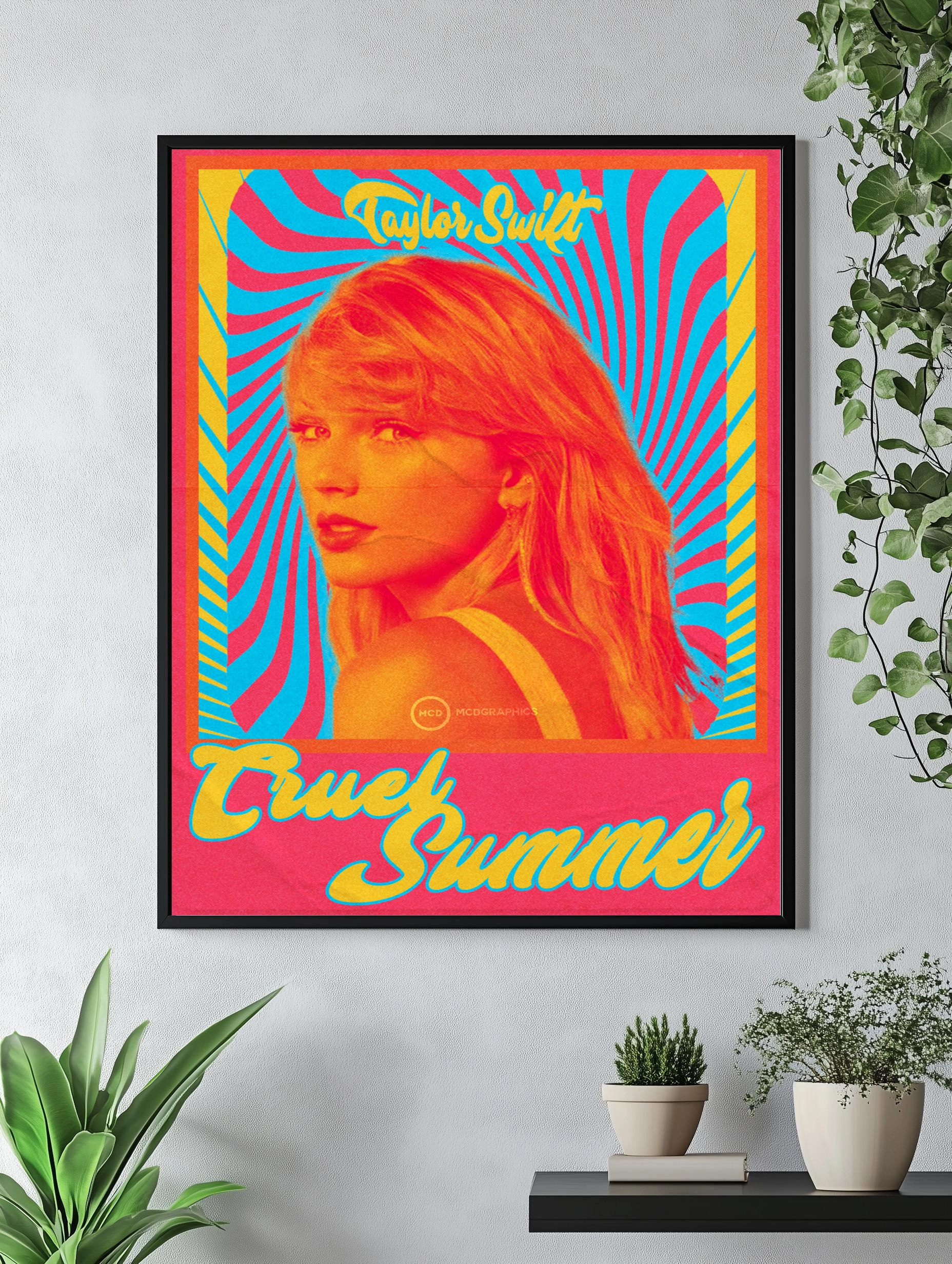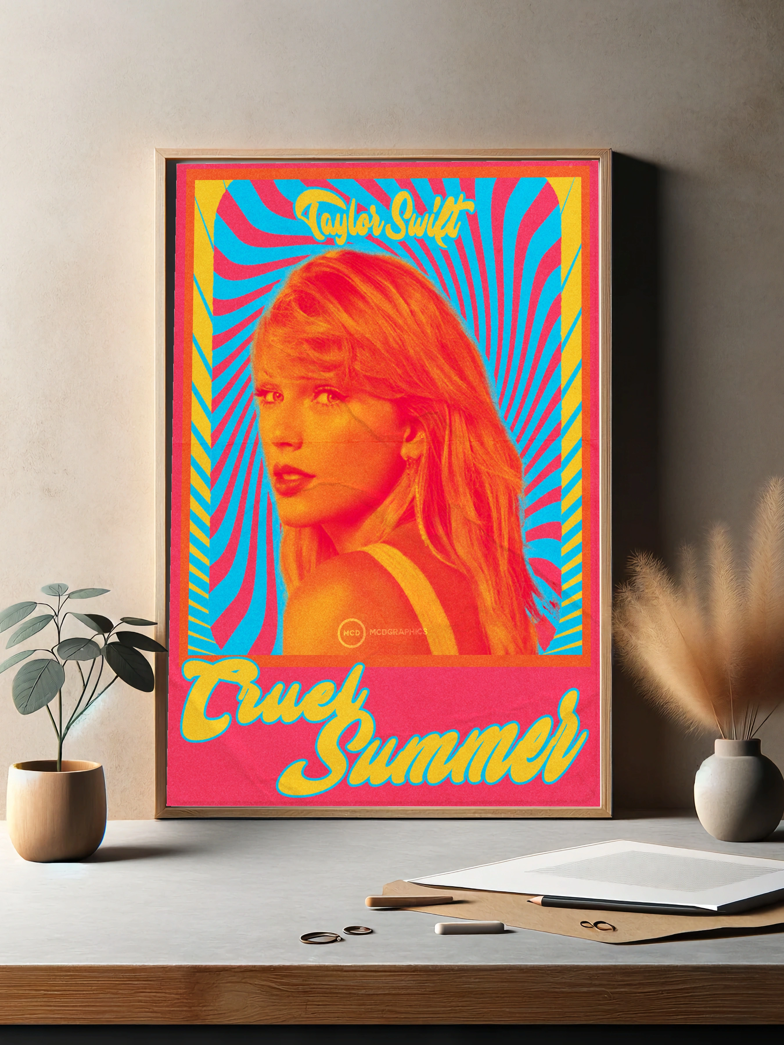 Декоративный плакат с изображением известной певицы Тейлор Свифт в стиле поп-арт с яркой цветовой палитрой. Яркое сочетание красного, желтого и голубого цветов создает динамичный и запоминающийся образ, идеально подходящий для интерьера гостиной или спальни. Настенный декор с современной художественной обработкой и стильным принтом, способный оживить любую комнату.