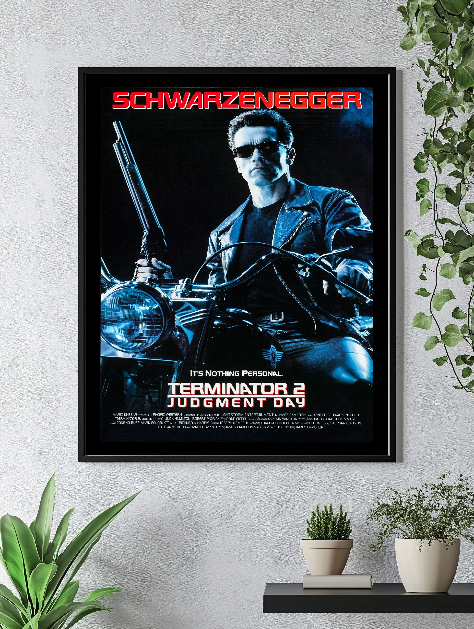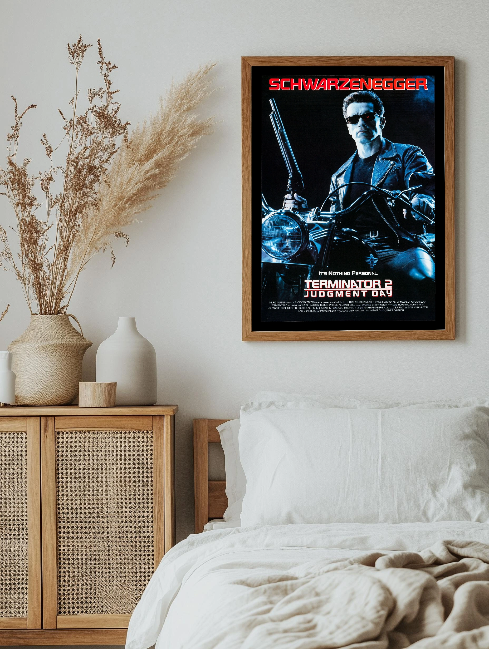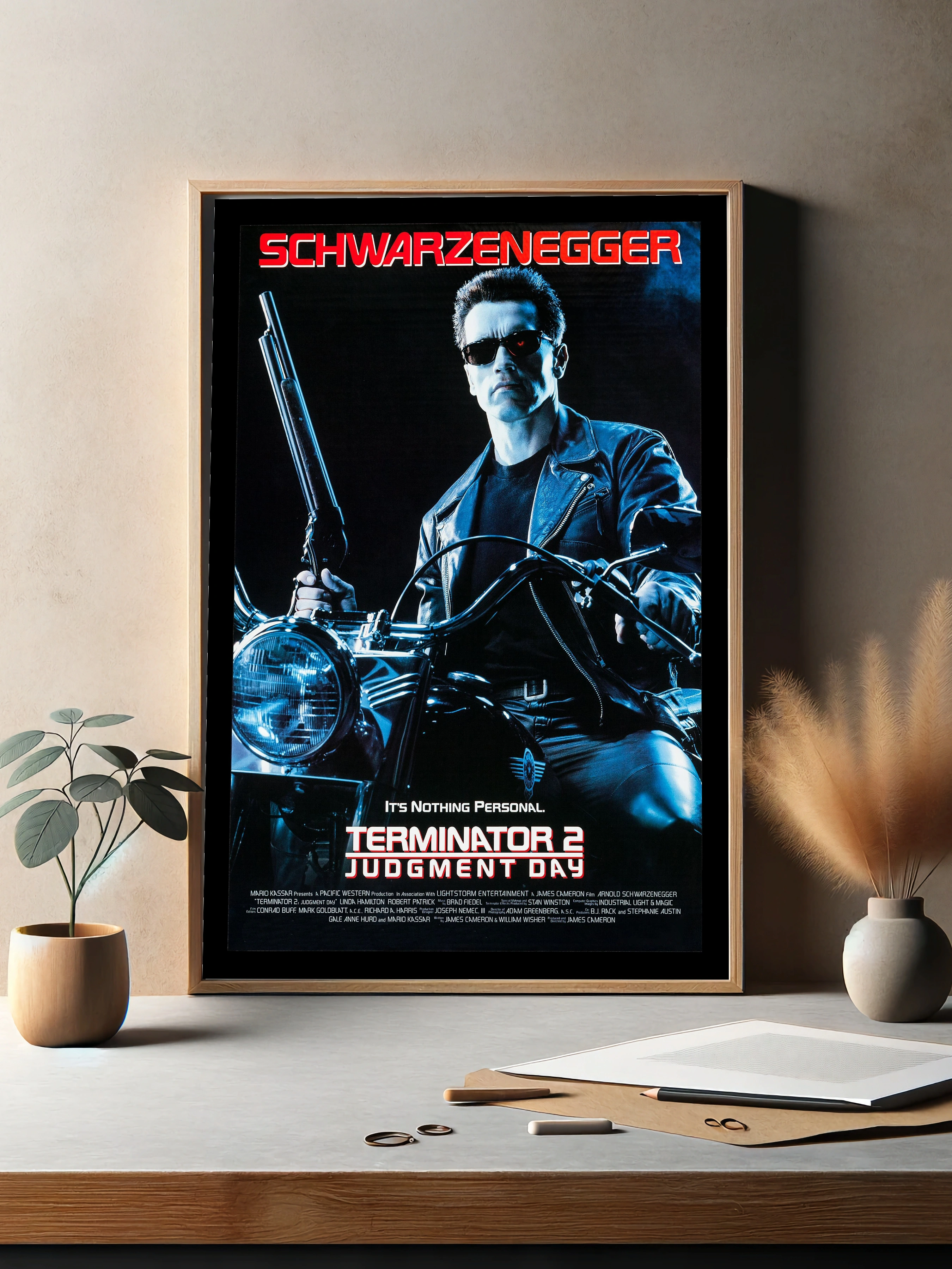 Интерьерная картина с изображением Арнольда Шварценеггера в роли Терминатора из фильма «Терминатор 2: Судный день». Герой в тёмных очках и кожаной куртке сидит на мотоцикле, в руках держит оружие. Атмосфера боевика и научной фантастики подчёркнута контрастным освещением с синими и чёрными оттенками. Стильный декоративный плакат для стен, подходящий для интерьера офиса, гостиной или кино-комнаты.