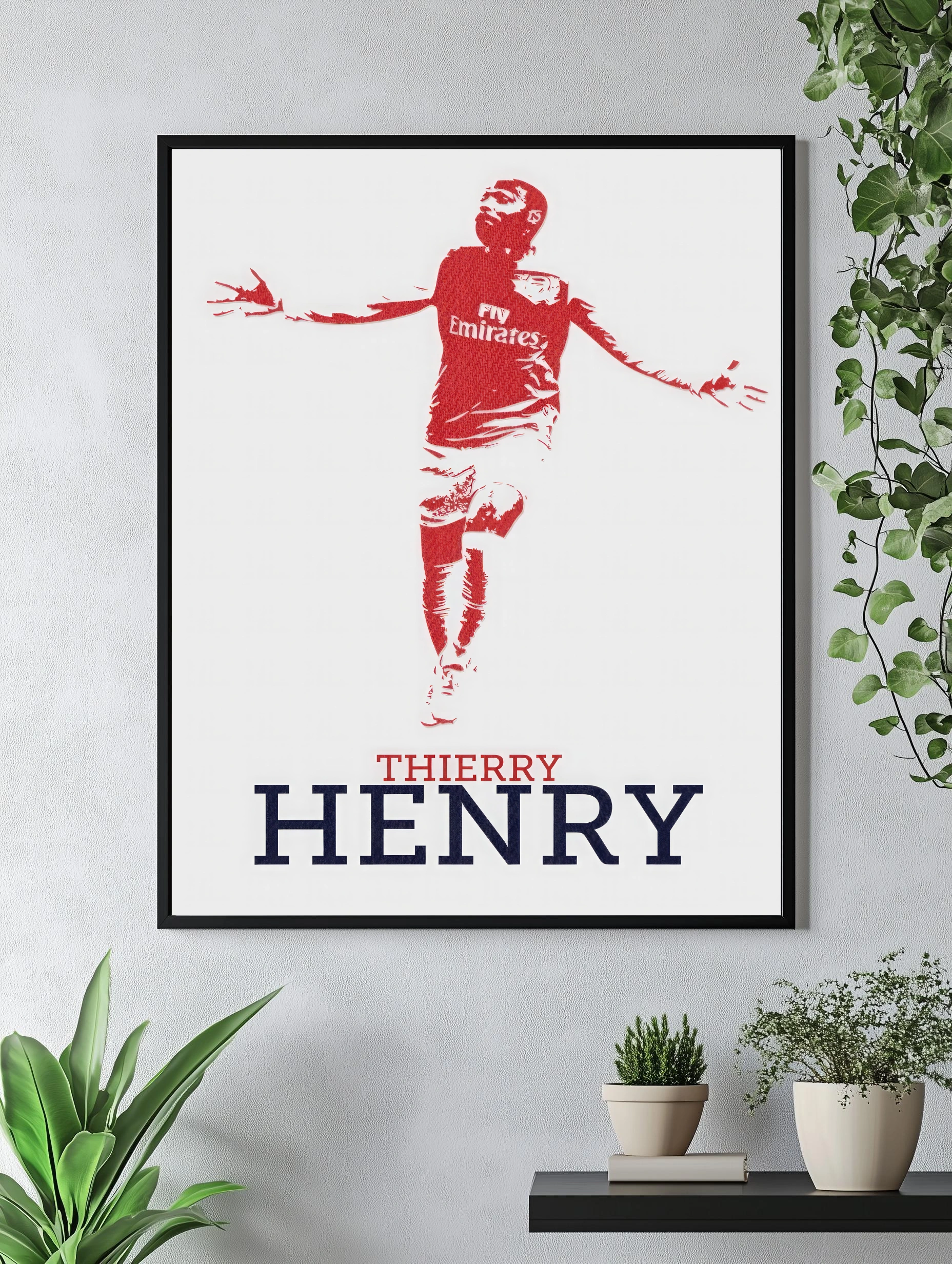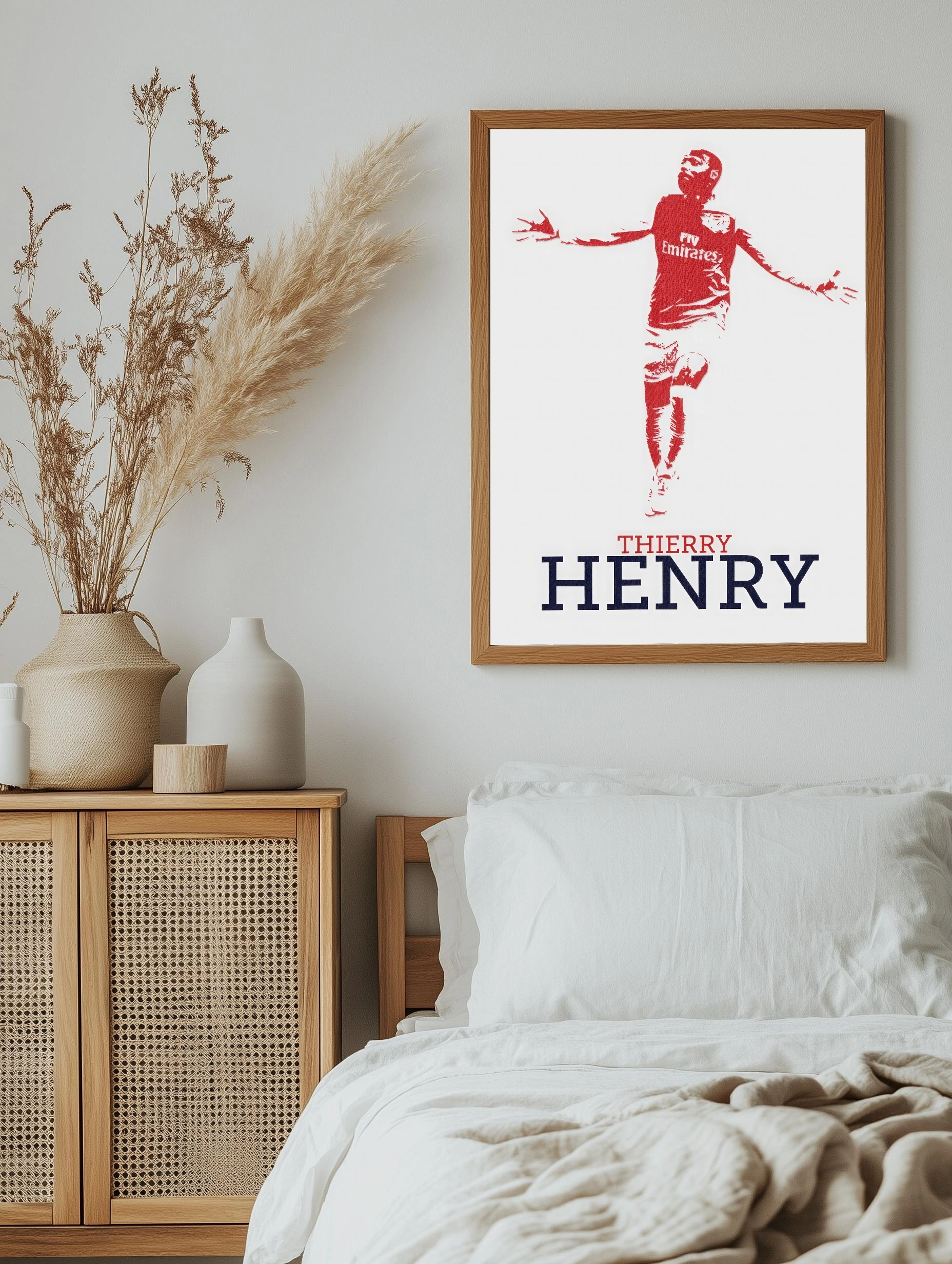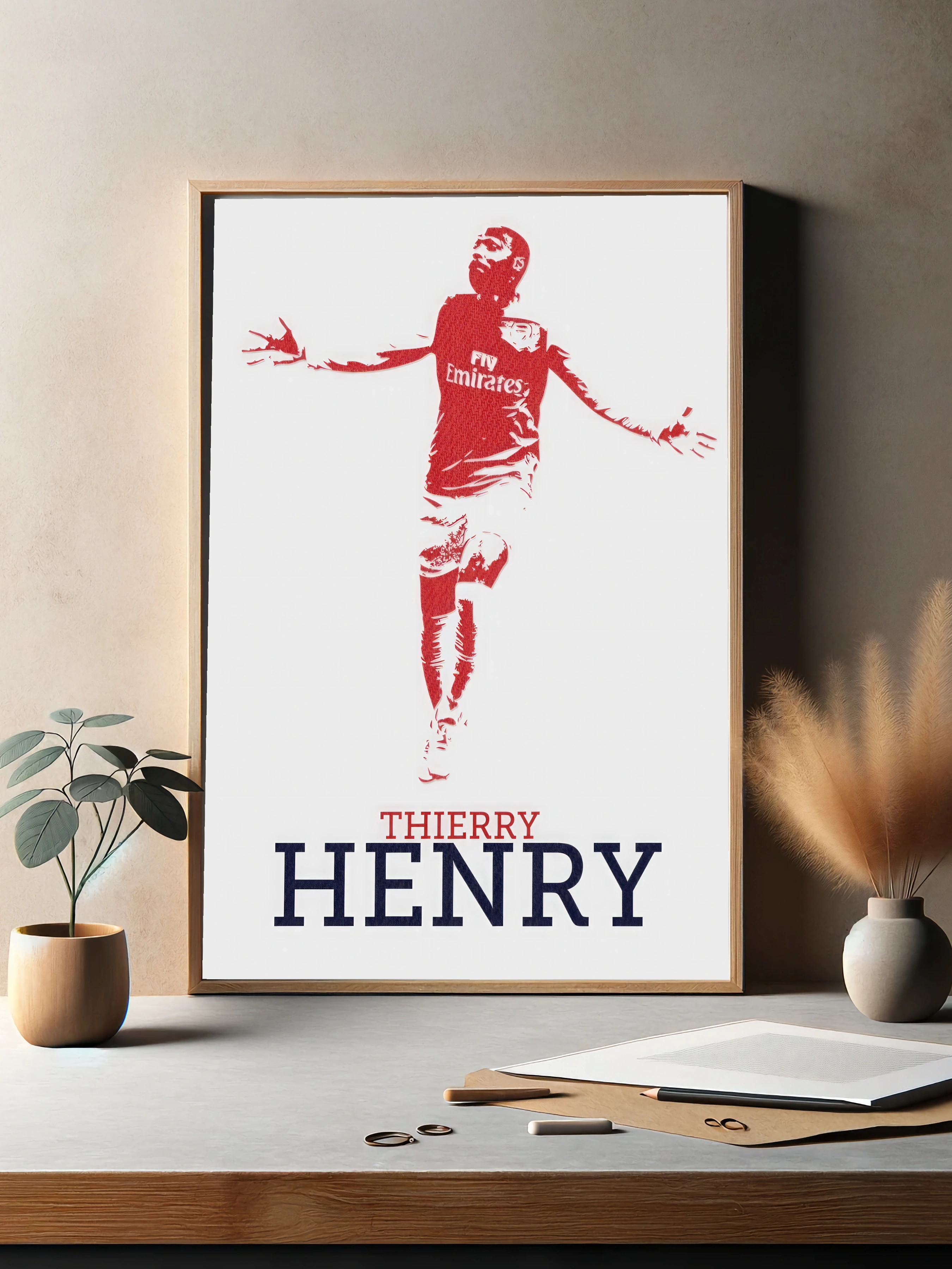 Интерьерный постер с изображением знаменитого футболиста Тьерри Анри в красной форме клуба Арсенал. Минималистичный художественный плакат выполнен в стилизованной манере с акцентом на движение и эмоции игрока, что делает его стильным декором стен. Домашние или офисные уникальные картины для ценителей спорта и футбола.