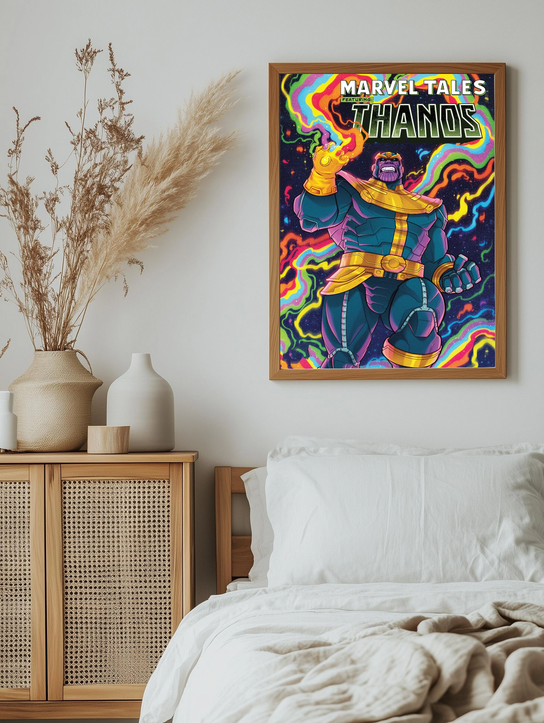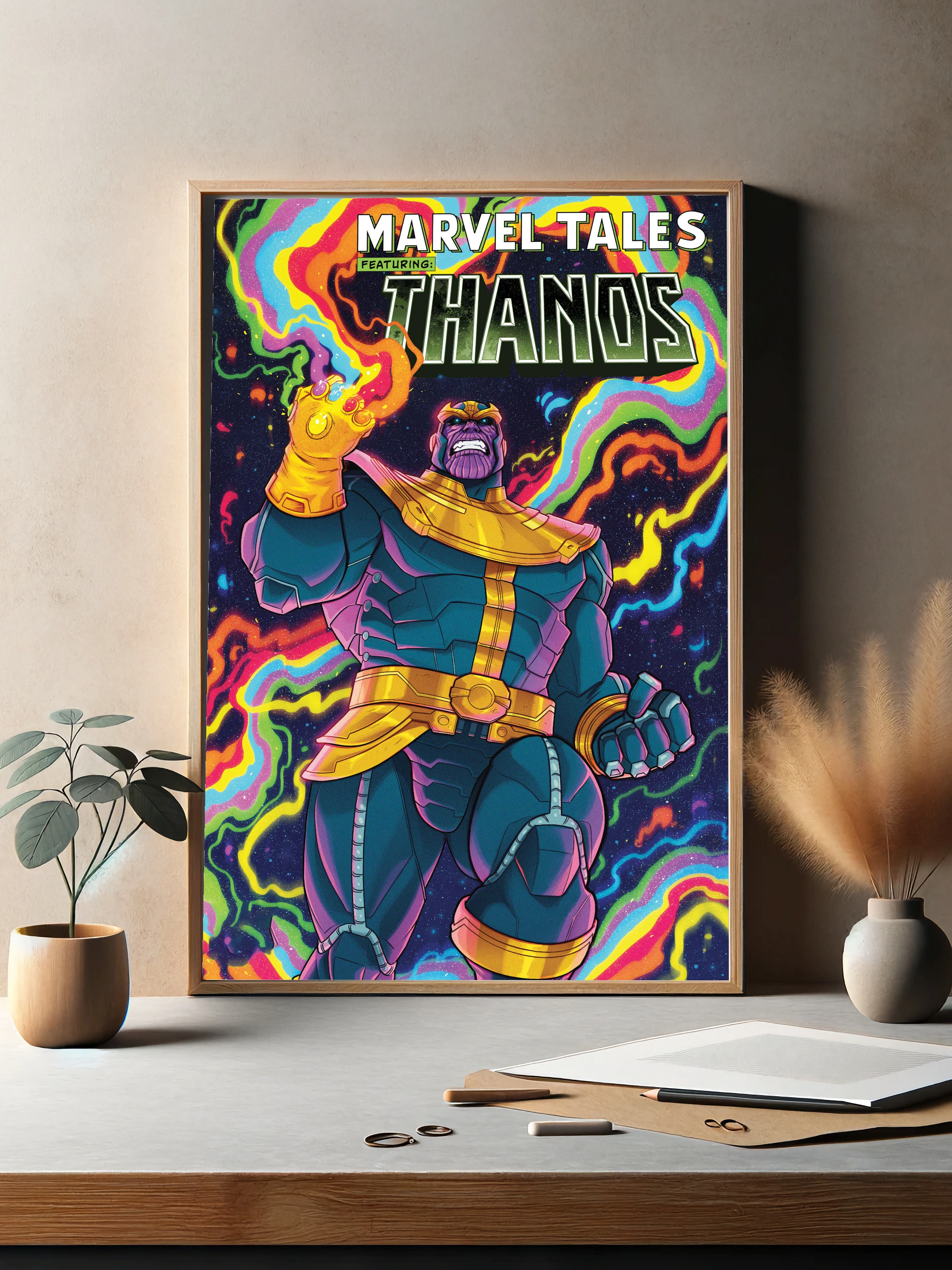 Яркий интерьерный плакат с изображением популярного персонажа Marvel — Таноса (Thanos). Герой в полном доспехе и с Перчаткой Бесконечности на руке представлен на фоне космического пространства, украшенного разноцветными энергетическими волнами. Декоративный плакат для поклонников современного искусства и комиксов Marvel, идеально подходит для гостиной или офиса.