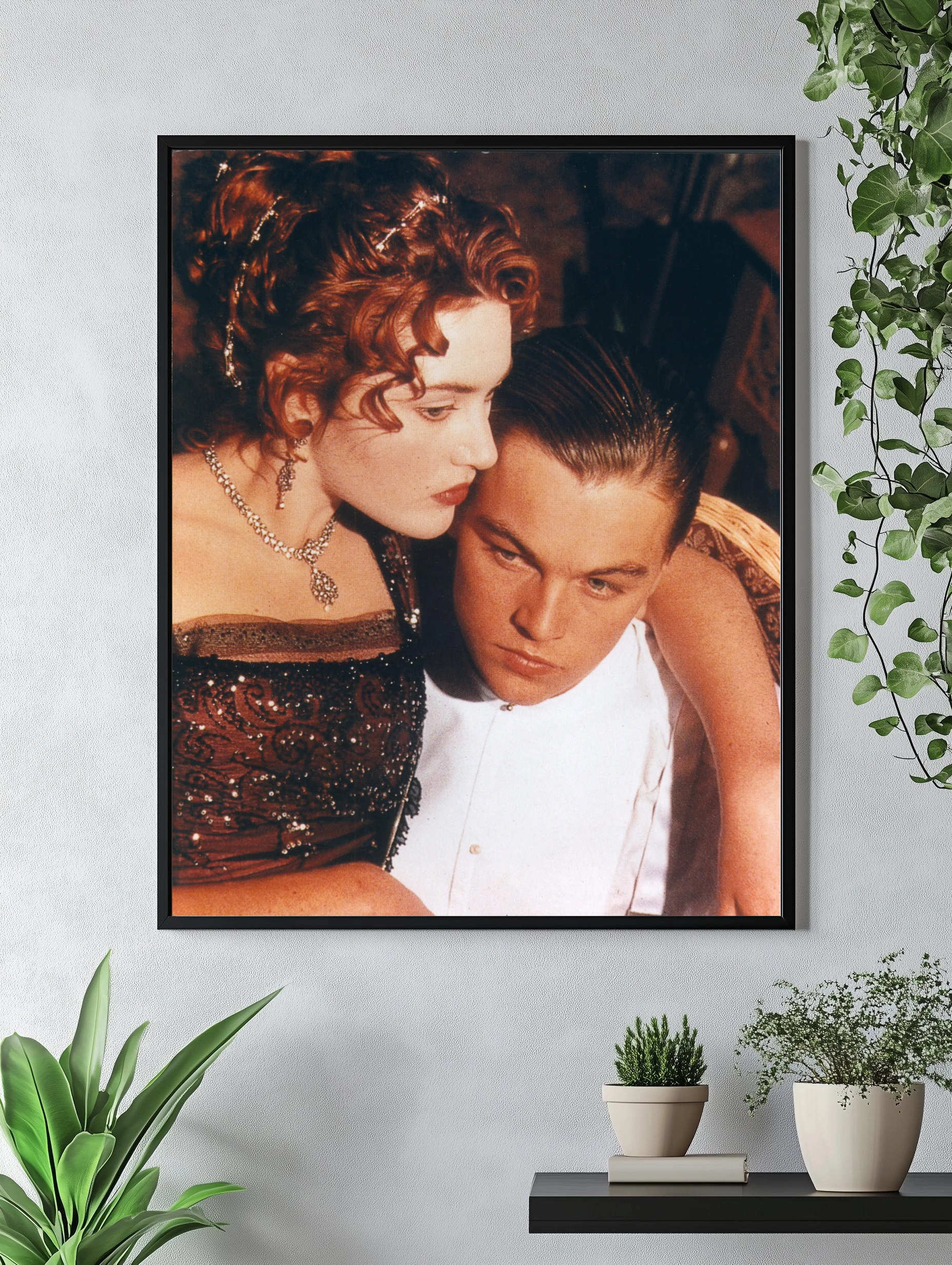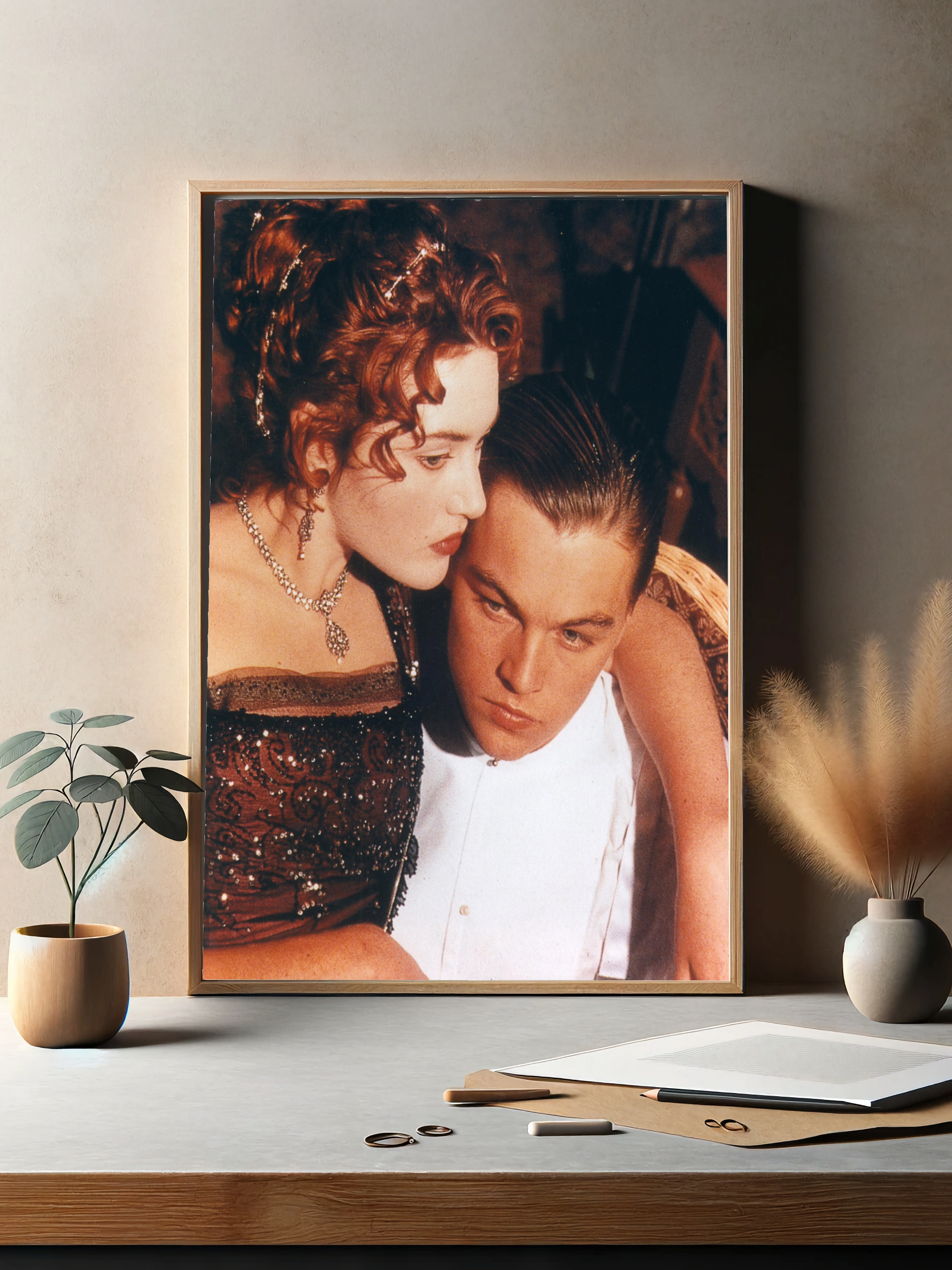 Изображение представляет собой сцену из культового фильма ‘Титаник’, где герои Джек и Роза находятся в помещении корабля, близко друг к другу, передавая глубокие чувства и напряжённое настроение. Кадр наполнен атмосферой драмы и романтики начала XX века. Этот интерьерный художественный плакат прекрасно подойдёт для гостиной или спальни поклонников кино и классического искусства.