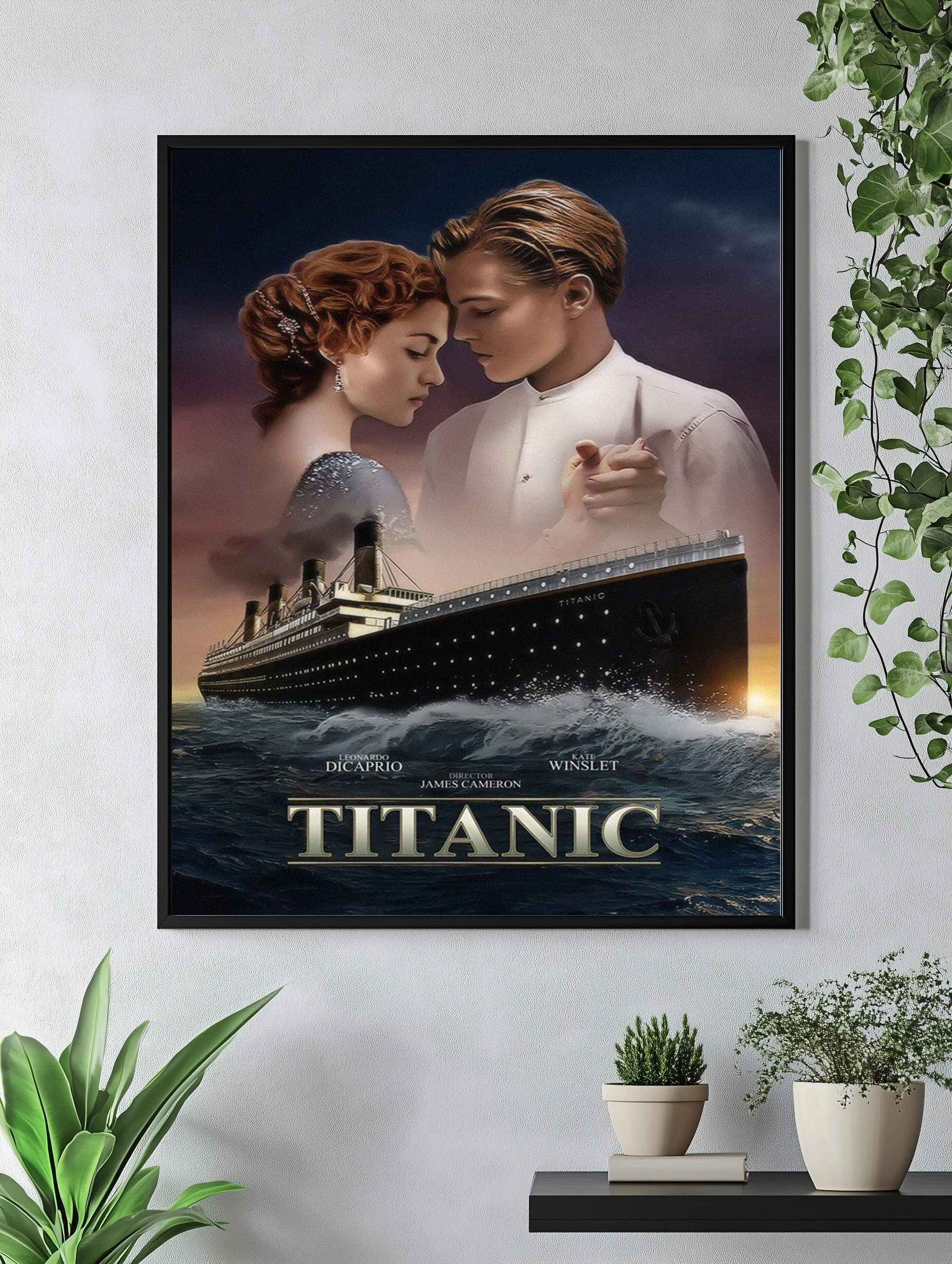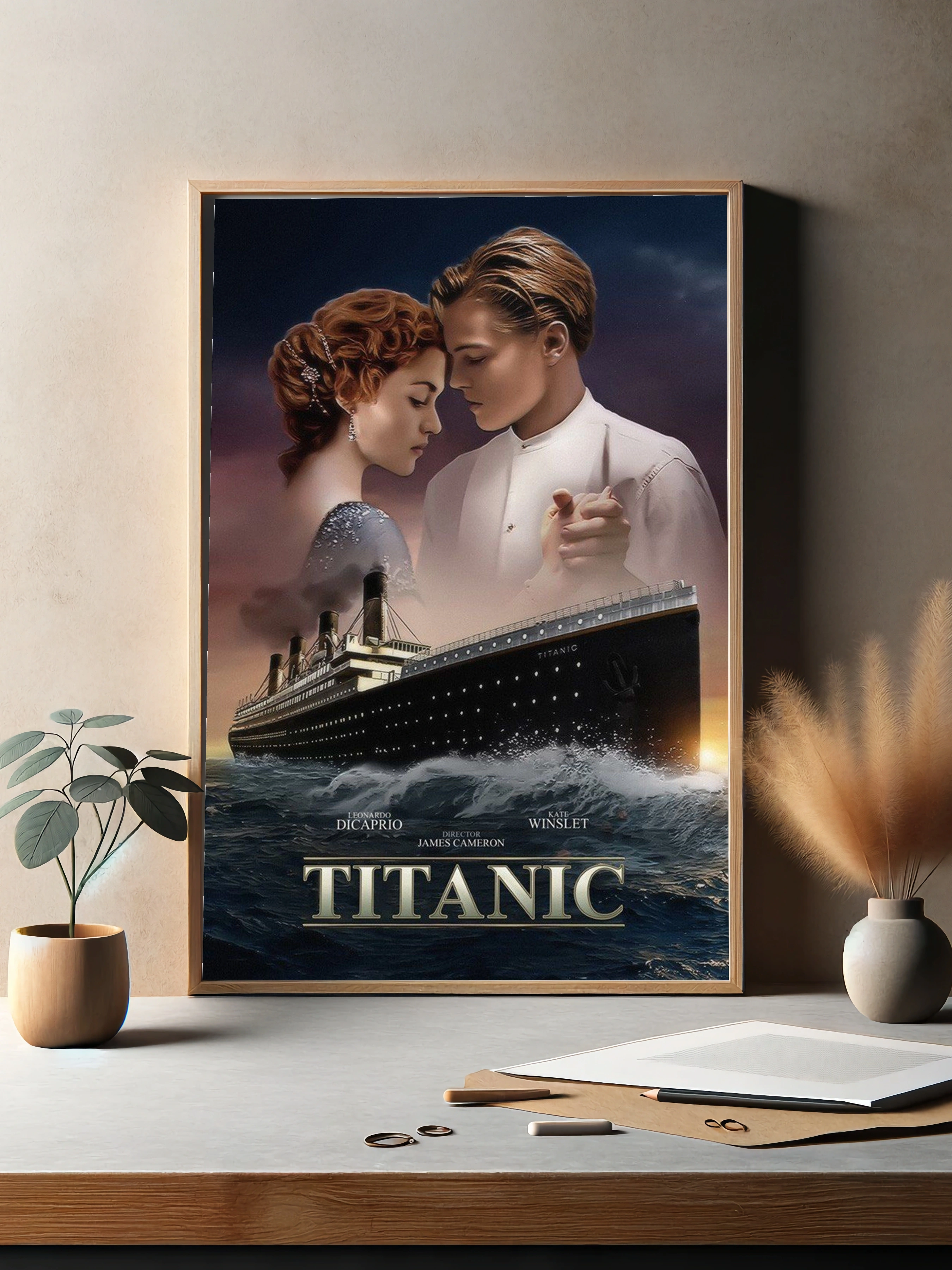 Изображение представляет собой художественный постер к фильму «Титаник» с Леонардо ДиКаприо и Кейт Уинслет в главных ролях. Постер выполнен в романтическом и драматическом стиле с мягкими переходами и тёплыми тонами. На переднем плане — гигантский лайнер, плывущий по волнам, на фоне — два персонажа, нежно держащиеся за руки, создавая атмосферу любви и трагедии. Этот интерьерный плакат станет стильным декором для гостиной или спальни, музыкальным и художественным выражением легендарной истории.