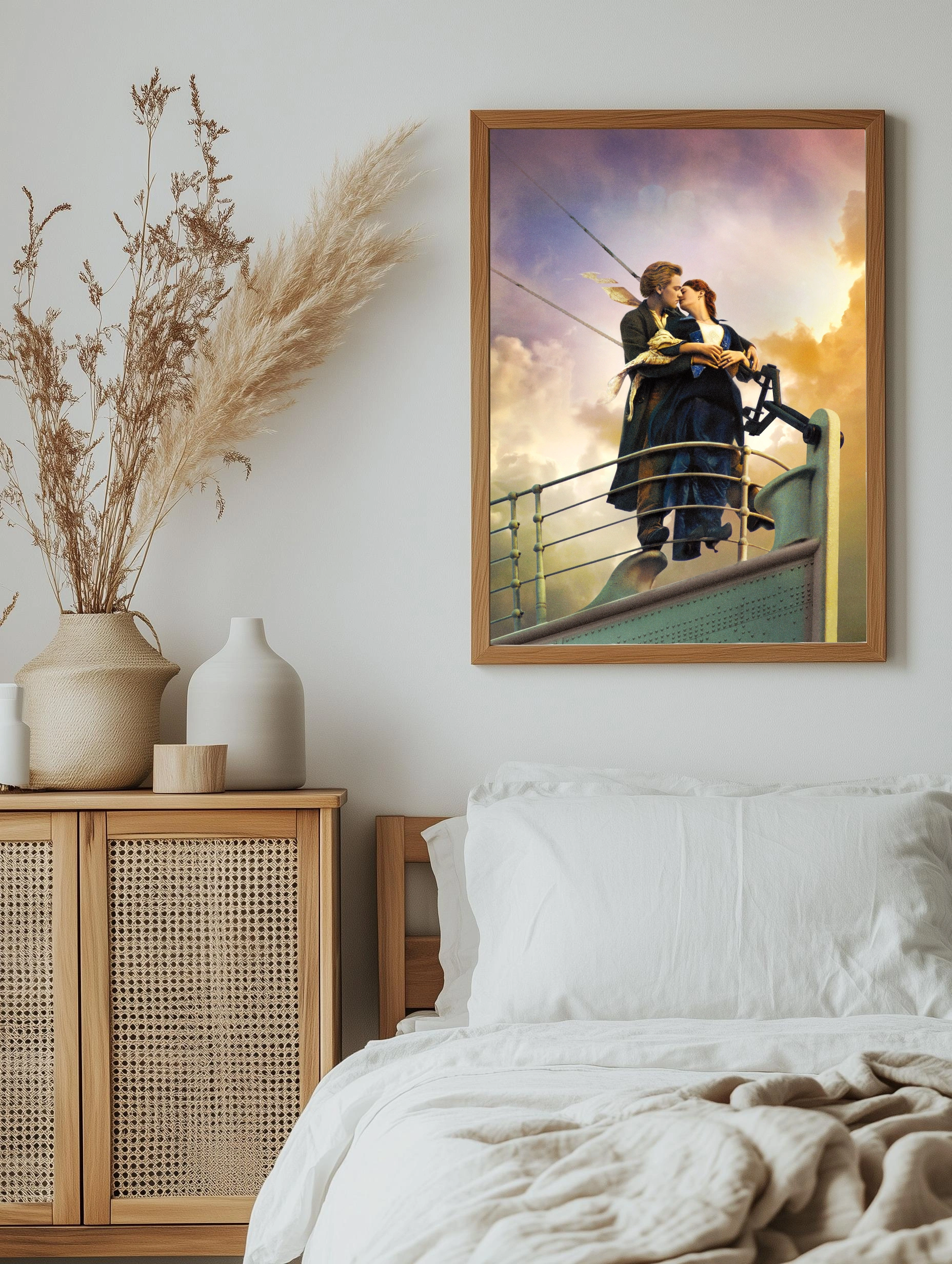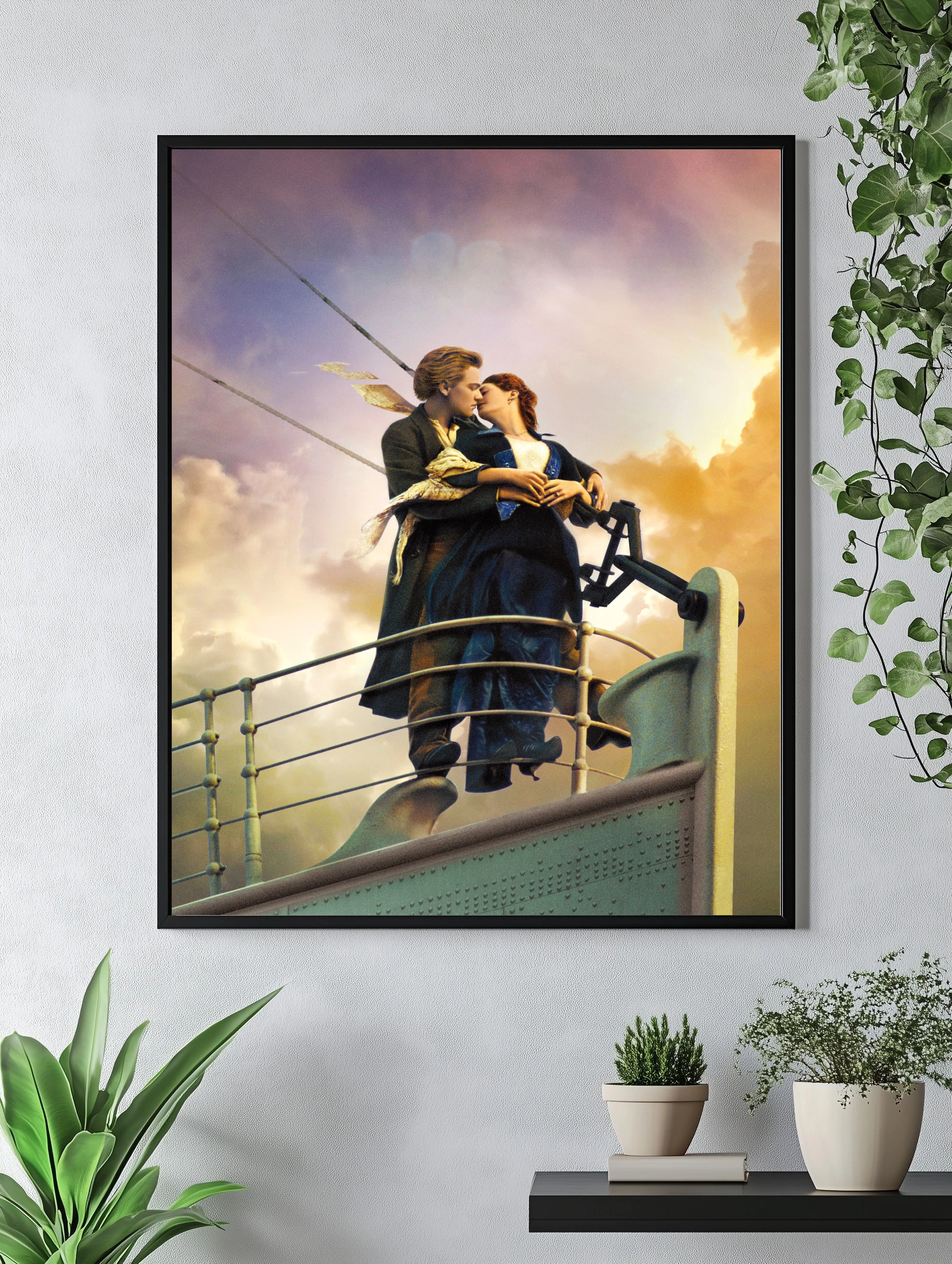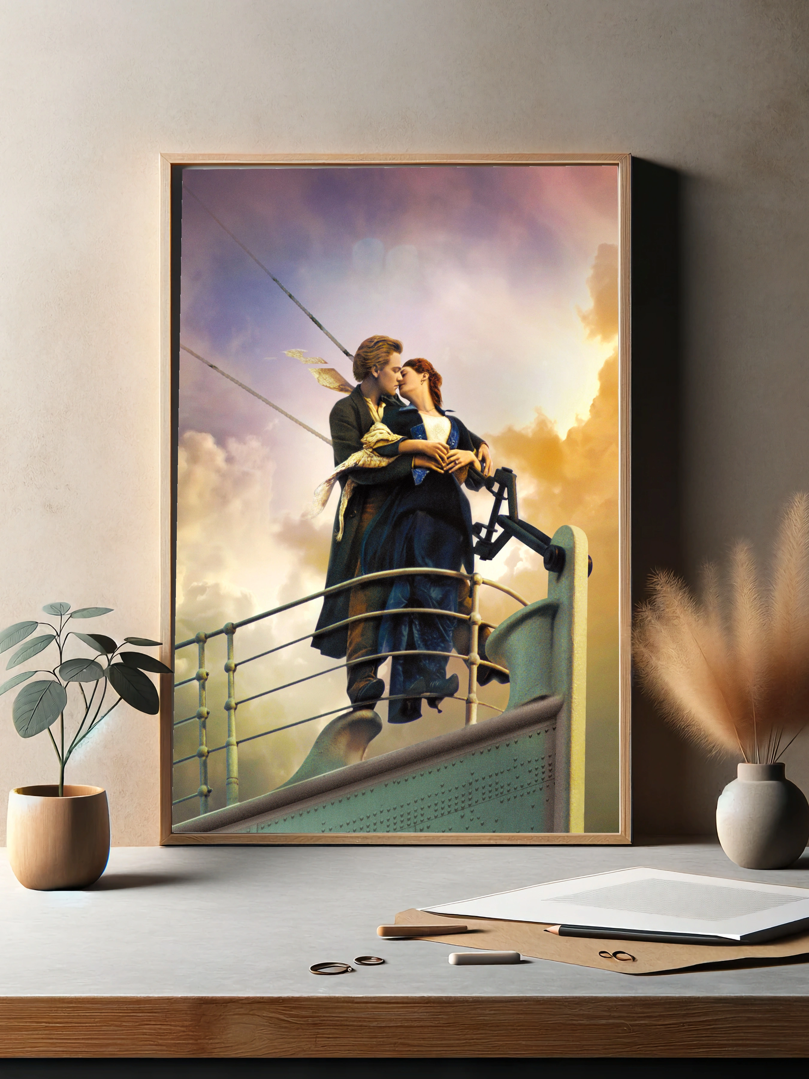 Изображение представляет собой сцену с известного фильма «Титаник», где два главных героя Джек и Роуз стоят на носу корабля, наслаждаясь моментом близости и свободы. Картина насыщена драматизмом и романтикой, выполнена в теплых золотисто-оранжевых и холодных синих тонах. Это интерьерное искусство отлично подойдет для гостиной или спальни, добавляя атмосферу классической любви и приключений, стильный декор стен с уникальной художественной атмосферой.