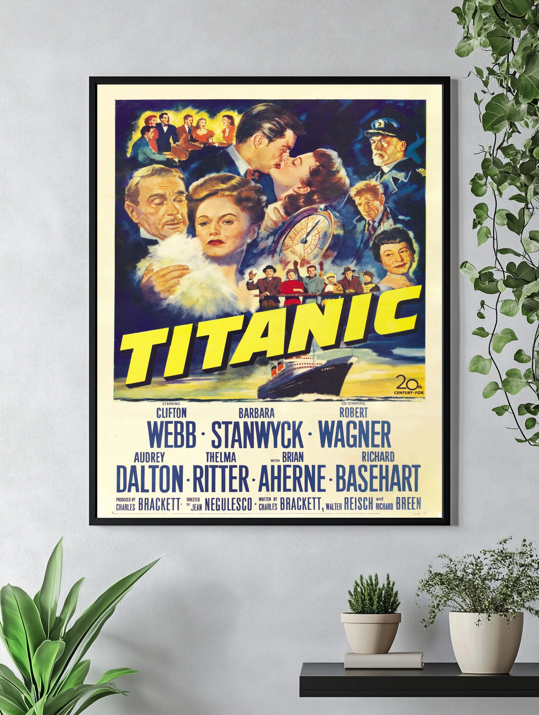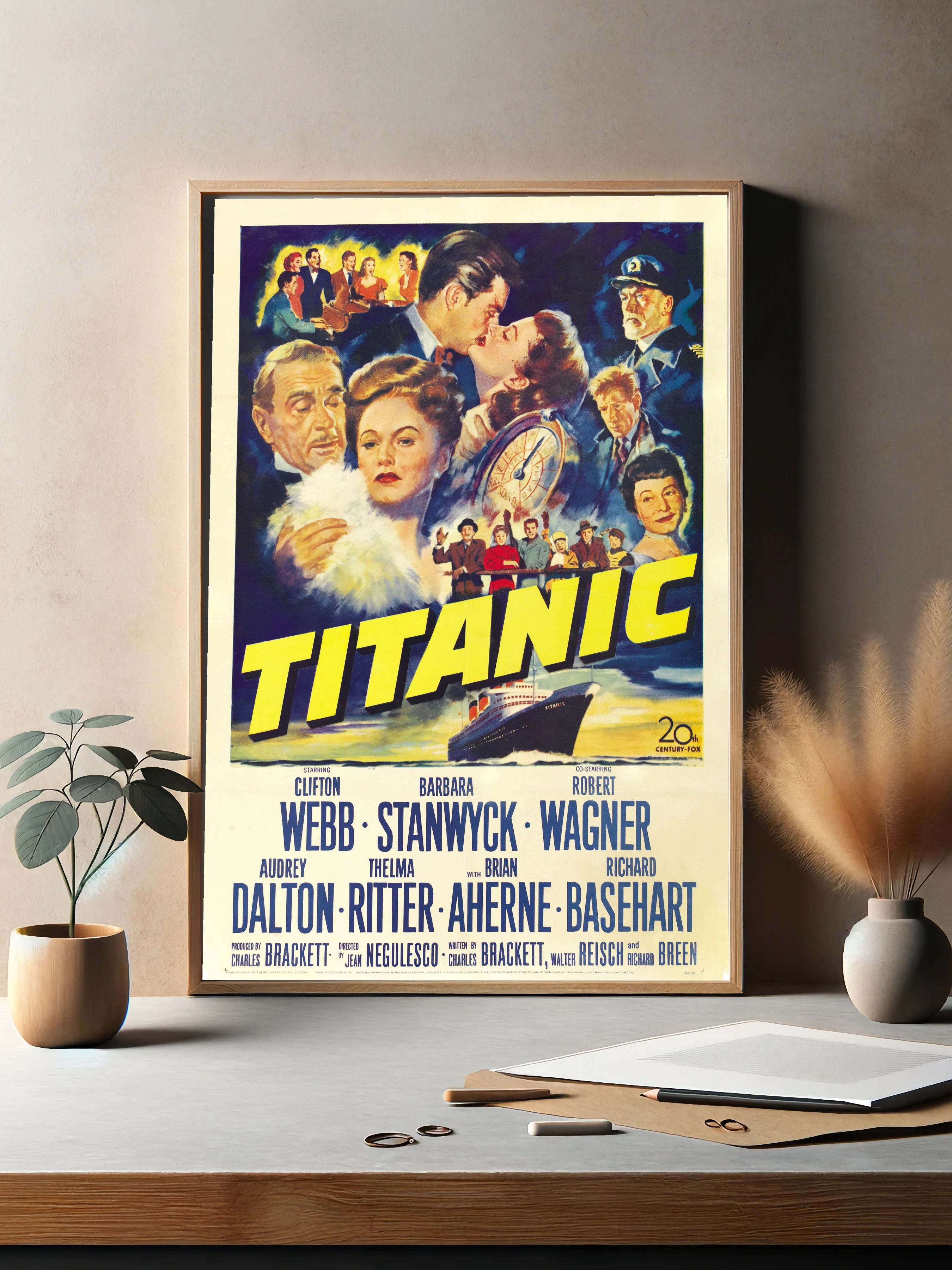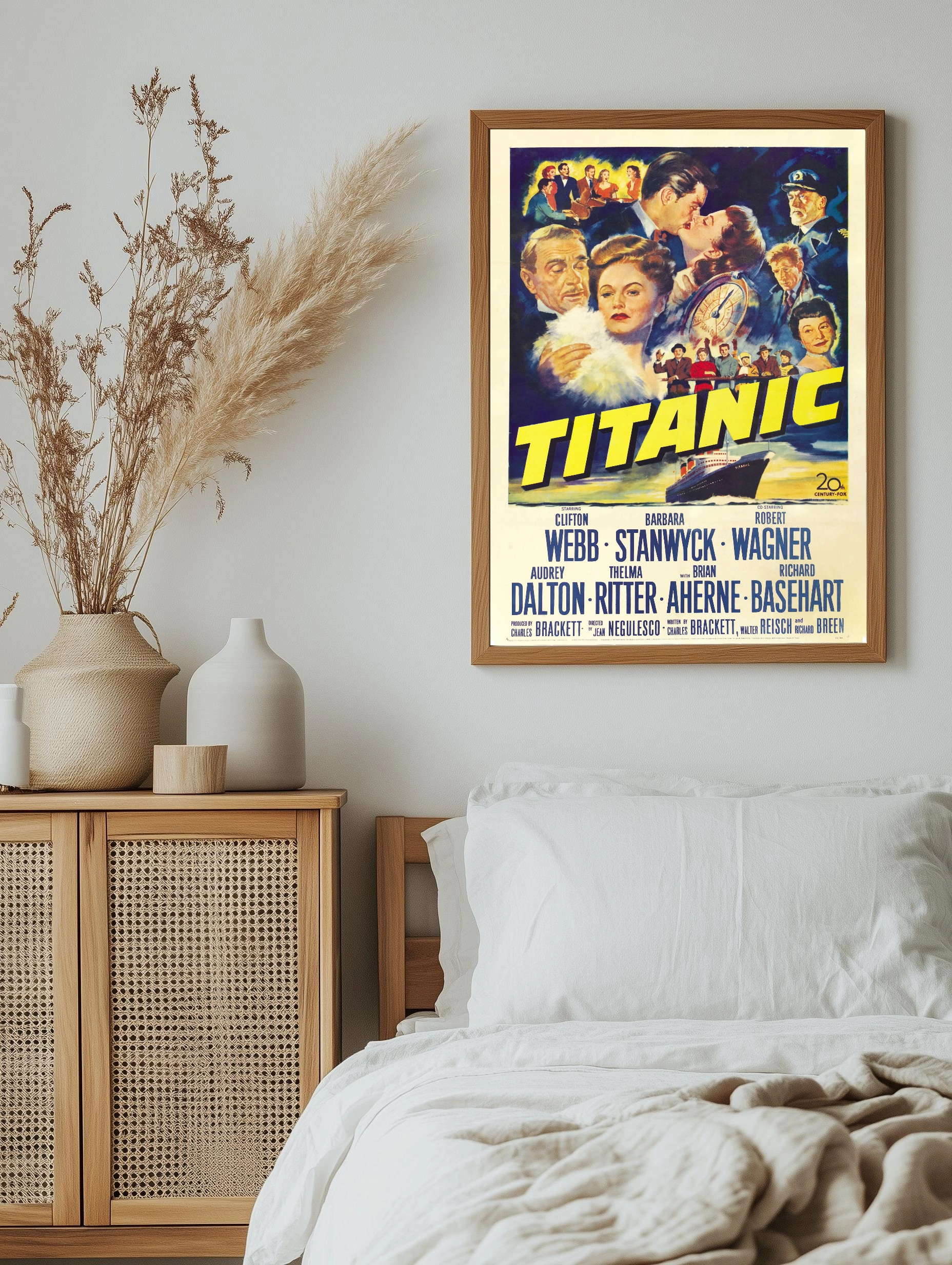 На изображении представлен винтажный художественный плакат фильма «Титаник». Постер выполнен в классическом стиле с ярким желтым заголовком на фоне, изображены ключевые персонажи, влюбленная пара и морское судно Титаник. Идеально подходит для стильного декора стен и создания атмосферы ретро и киноискусства.