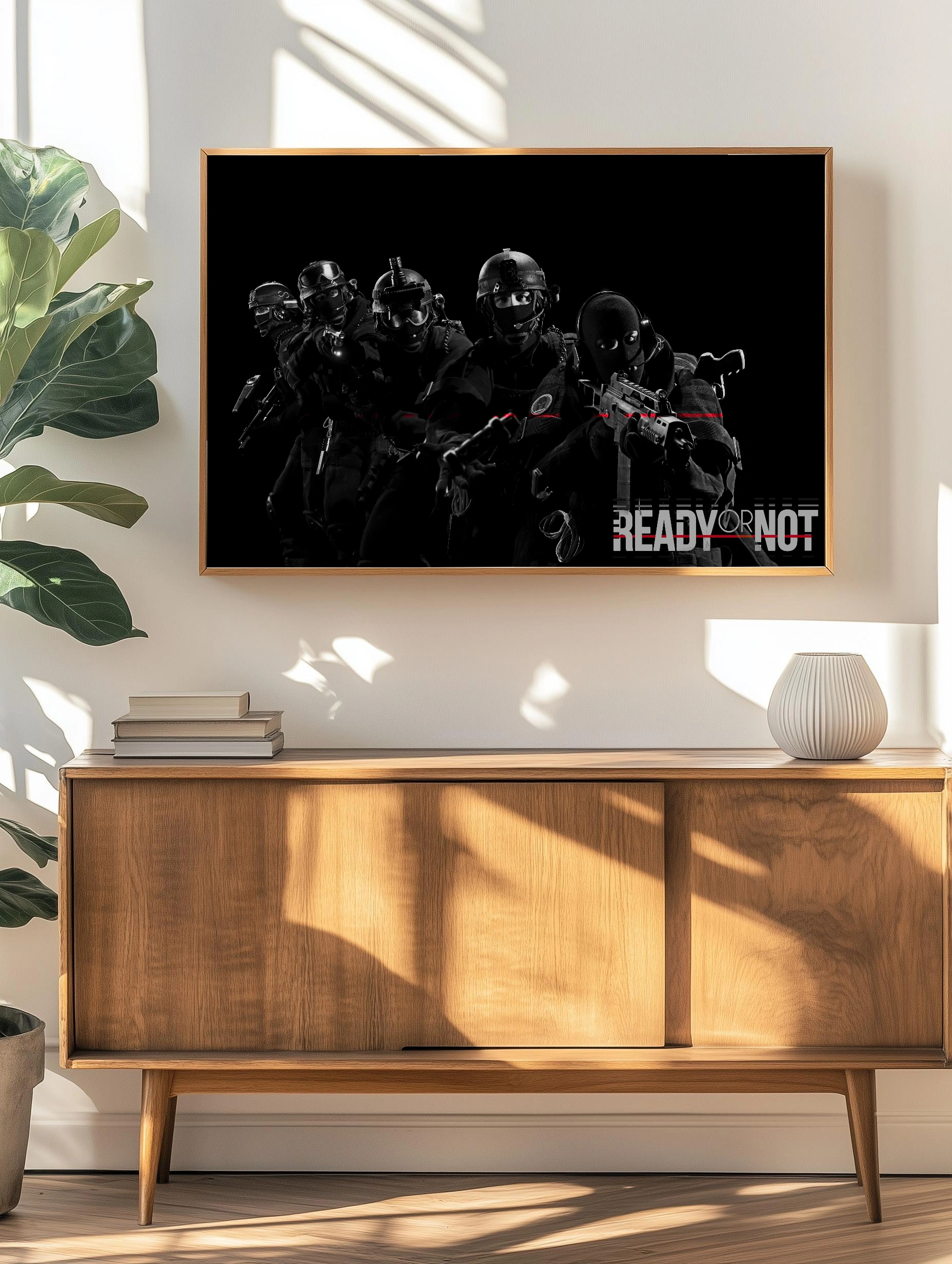 На фото сам постер уже под защитной пленкой рамки, потому чуть замыливает прекрасное качество печати . И в рамке есть небольшая "волна" холста. Исправлю позже))