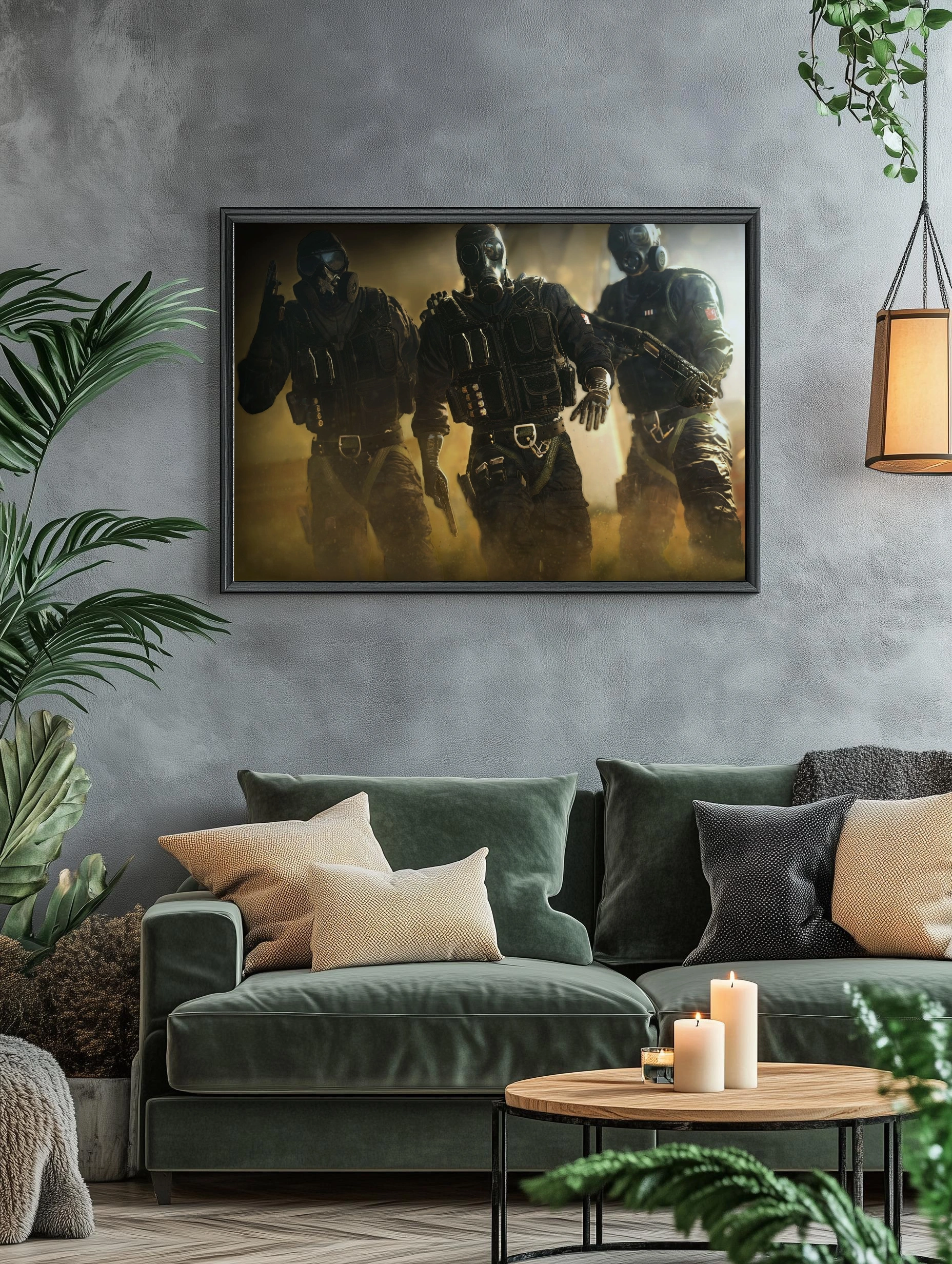 Изображение показывает трёх солдат в тактическом обмундировании и противогазах, каждый держит оружие. Атмосфера напряжённая, фон туманно-дымный с оттенками жёлтого и коричневого, создаёт ощущение боевой готовности и опасности. Это интерьерное искусство подчёркивает стиль военного сражения и тактических операций, отлично подойдёт для декора офиса или игровой комнаты.
