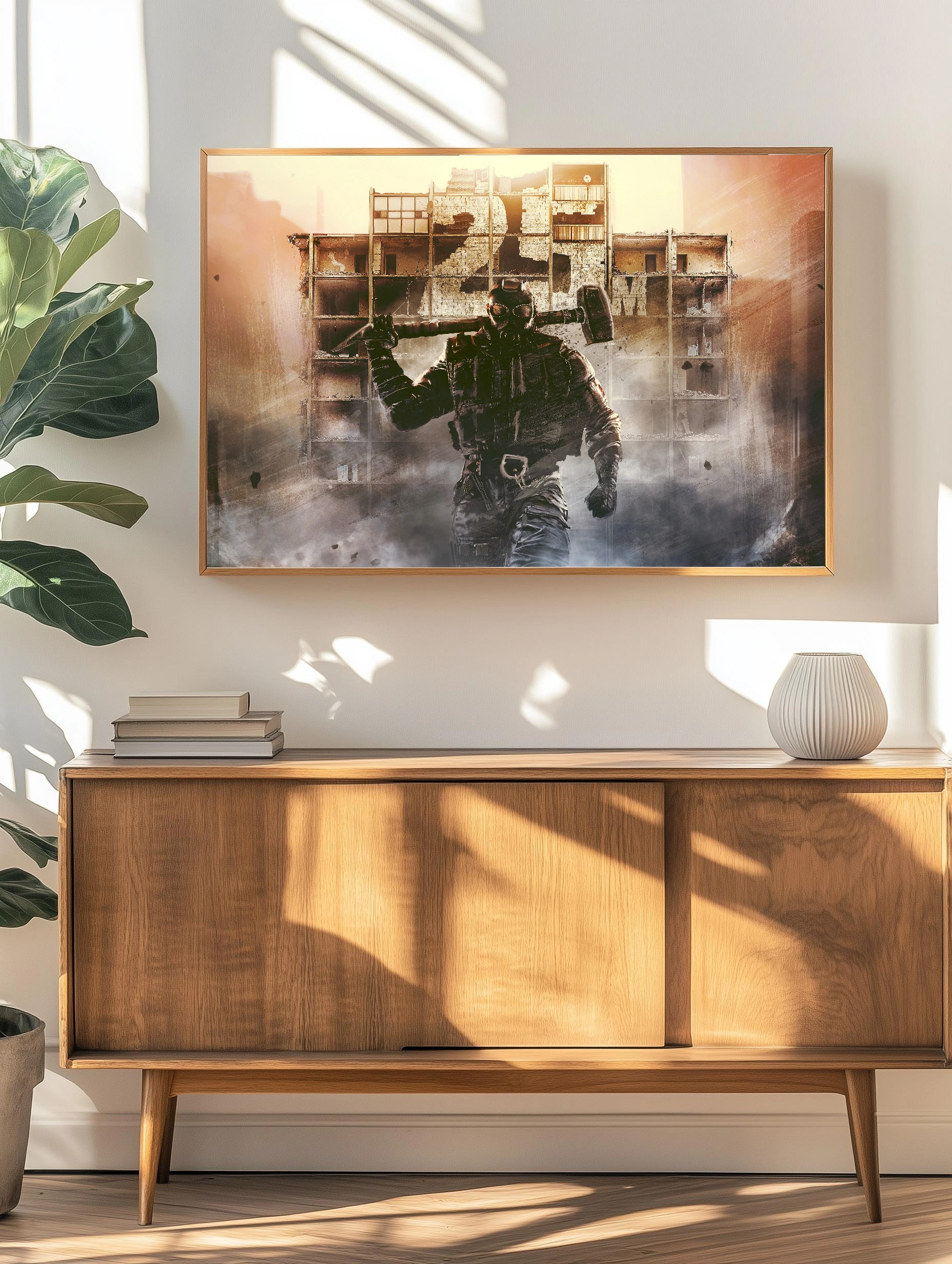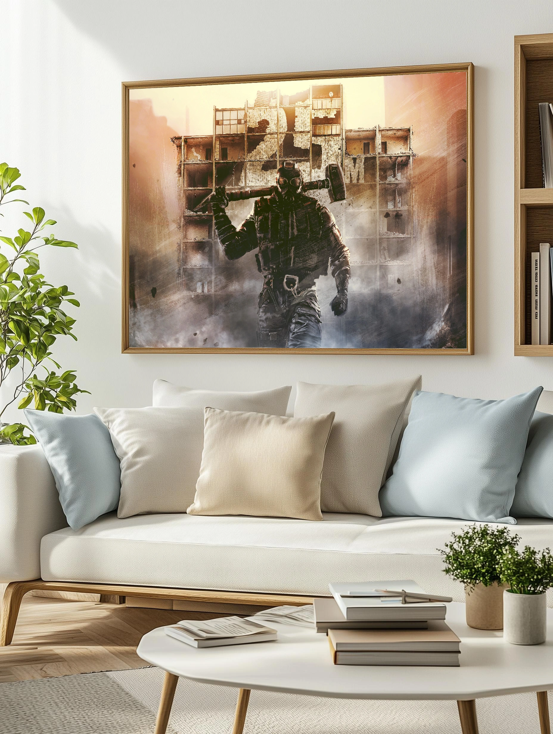 Изображение представляет собой атмосферный интерьерный арт с темным воином в маске и броне, который держит молот, на фоне разрушенного здания с большими окнами. Цветовая гамма варьируется от темно-коричневых до светло-бежевых тонов, создавая настроение постапокалипсиса и напряженности. Этот художественный плакат подойдет для современного декора, идеального для гостиной или кабинета.