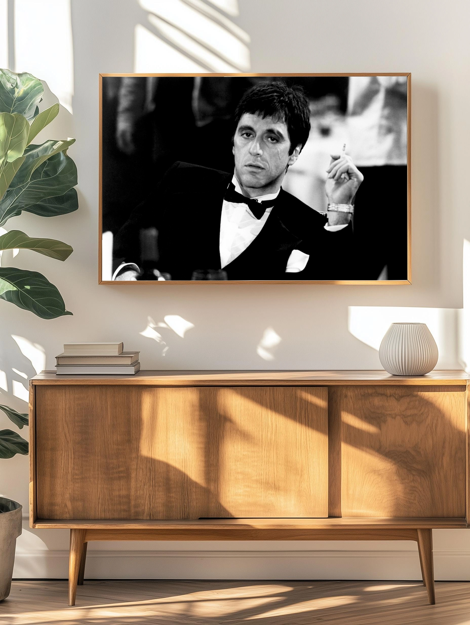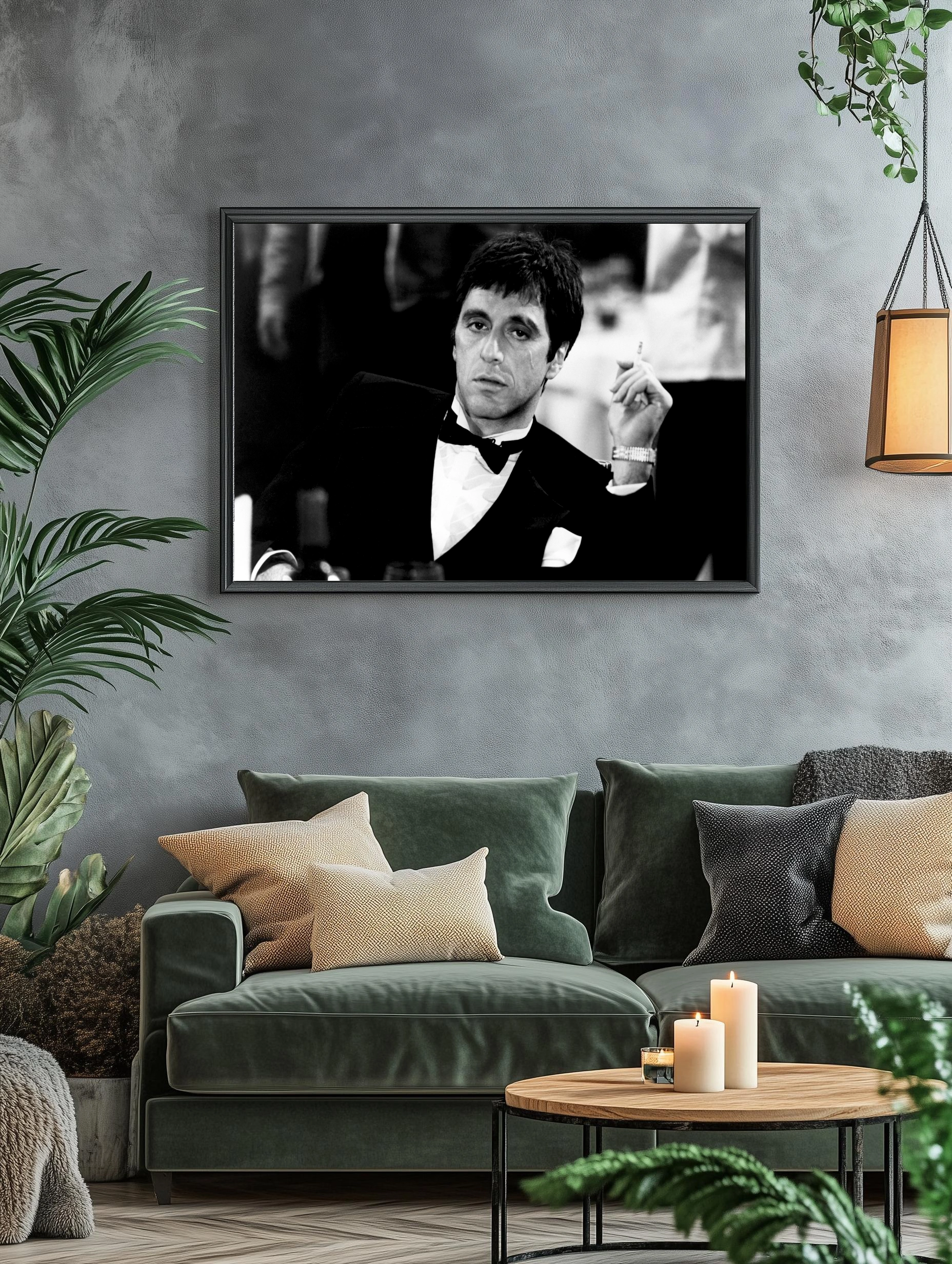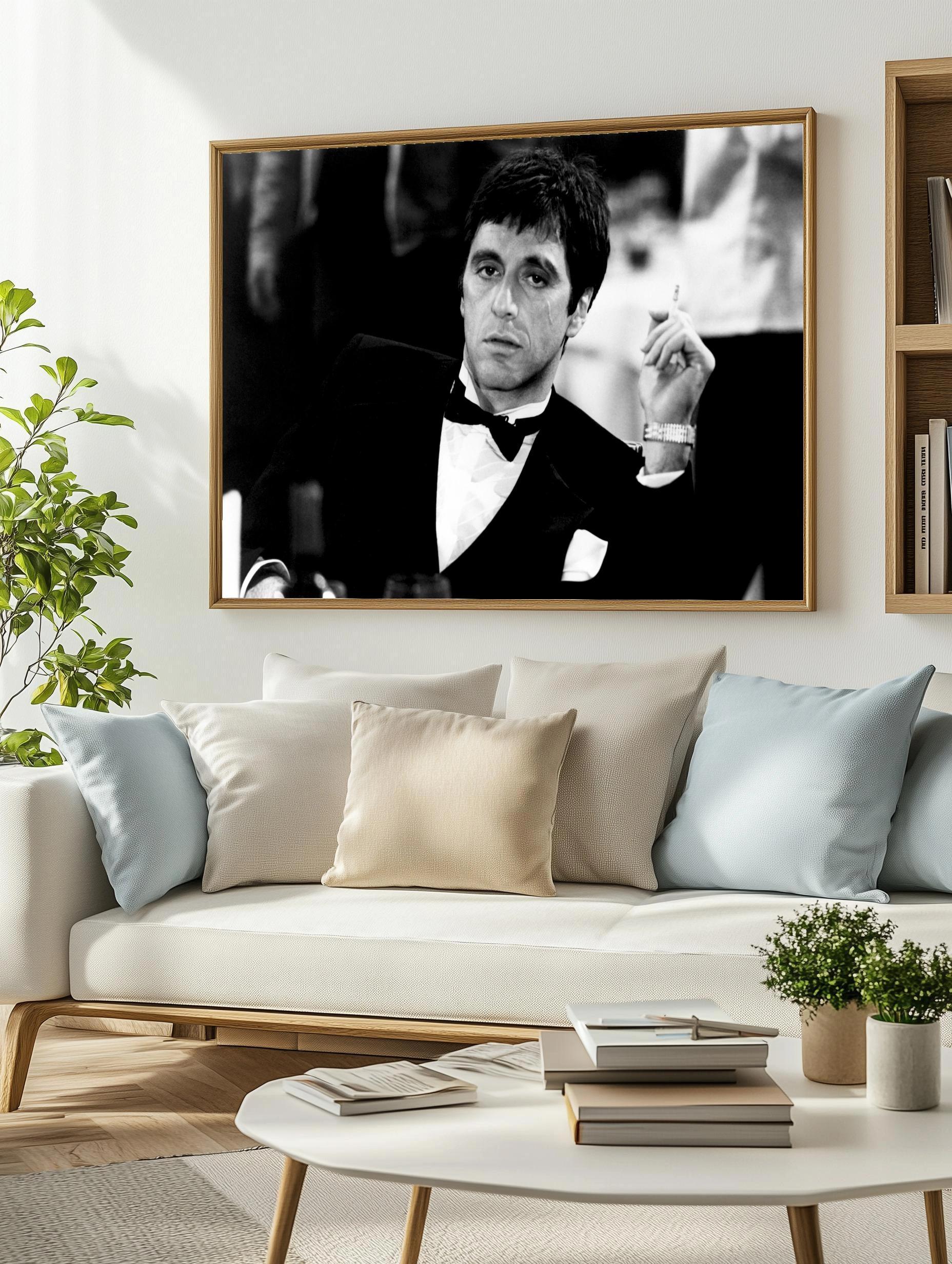 На изображении представлен Аль Пачино в роли Тони Монтаны — культового персонажа криминального кино. Фото выполнено в черно-белой гамме, передавая атмосферу классического гангстерского фильма и элегантности 80-х. Этот интерьерный арт идеально подходит для любителей кино и современного искусства для стен.