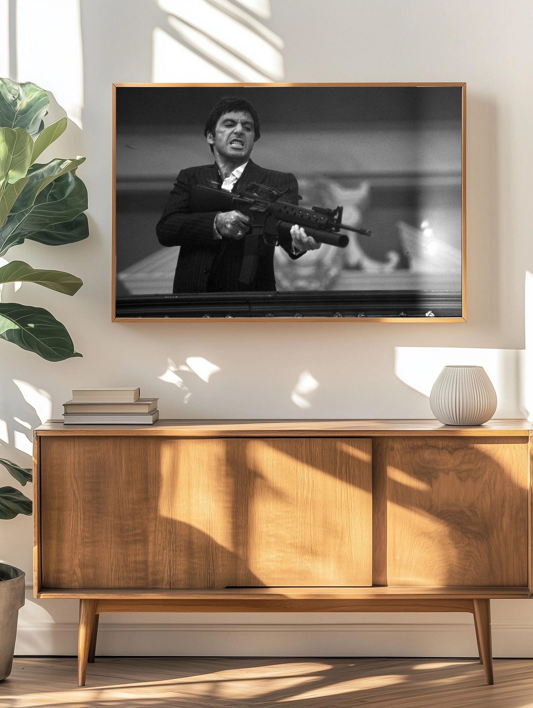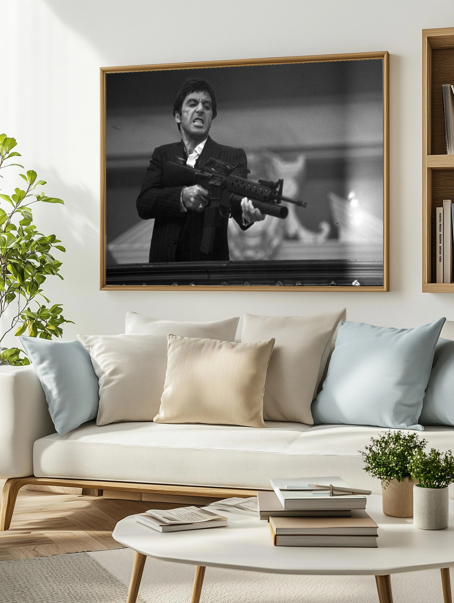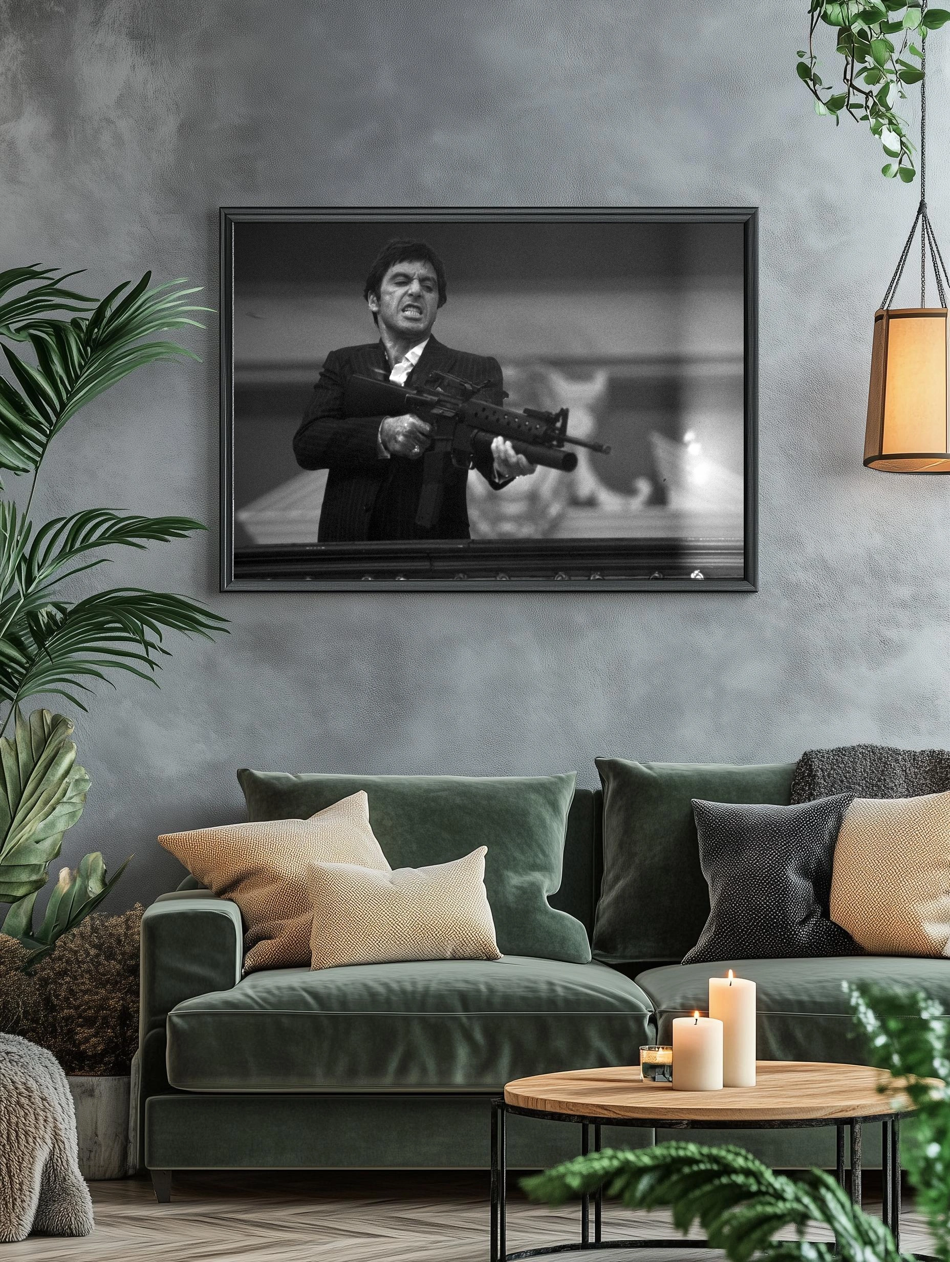 Чёрно-белое изображение с культовой сценой из фильма «Лицо со шрамом» с Тони Монтаны в напряжённой позе с оружием. Этот интерьерный фотопостер передаёт драматизм и энергетику классического криминального кино, идеально подходя для стильного декора стен и любителей киноискусства.