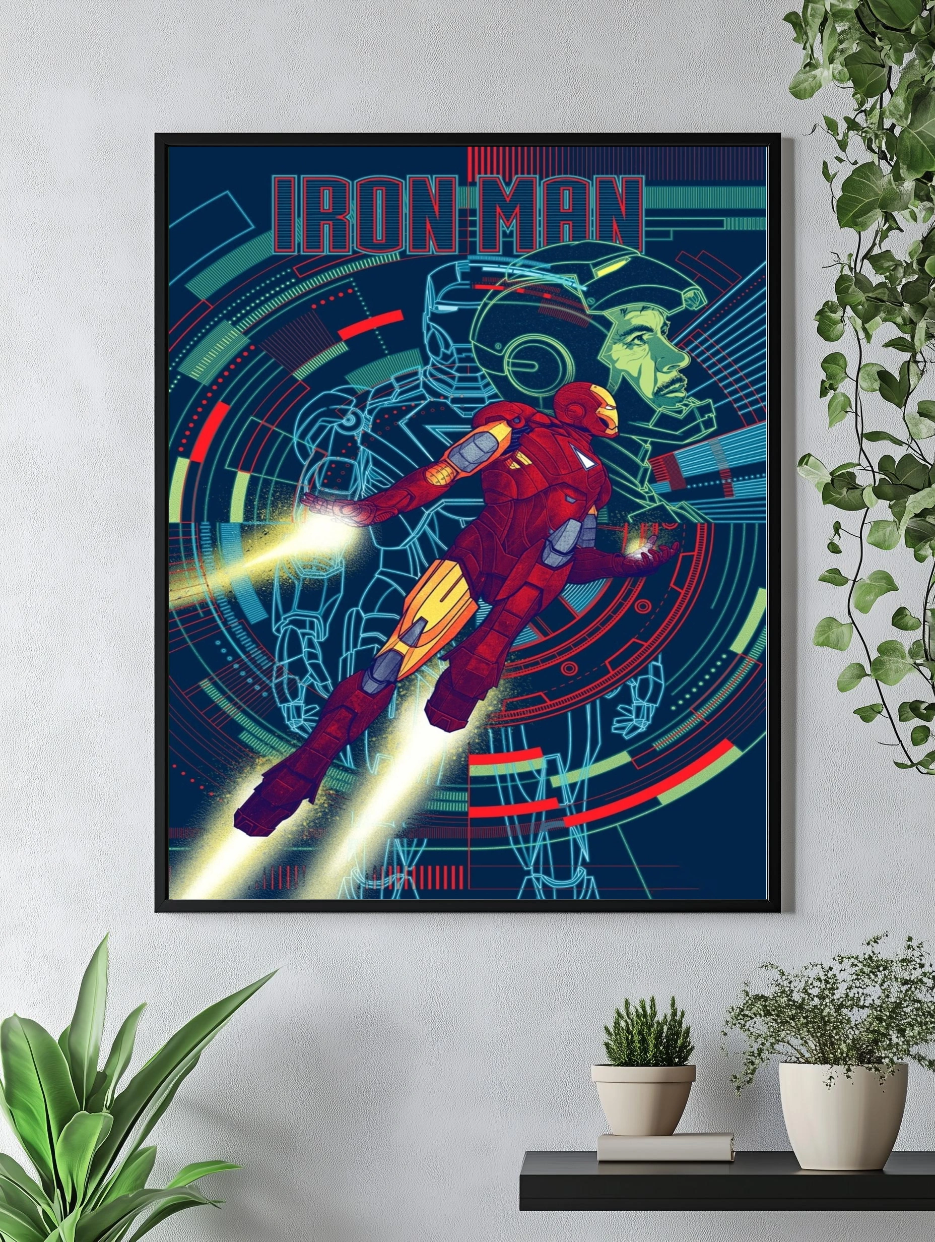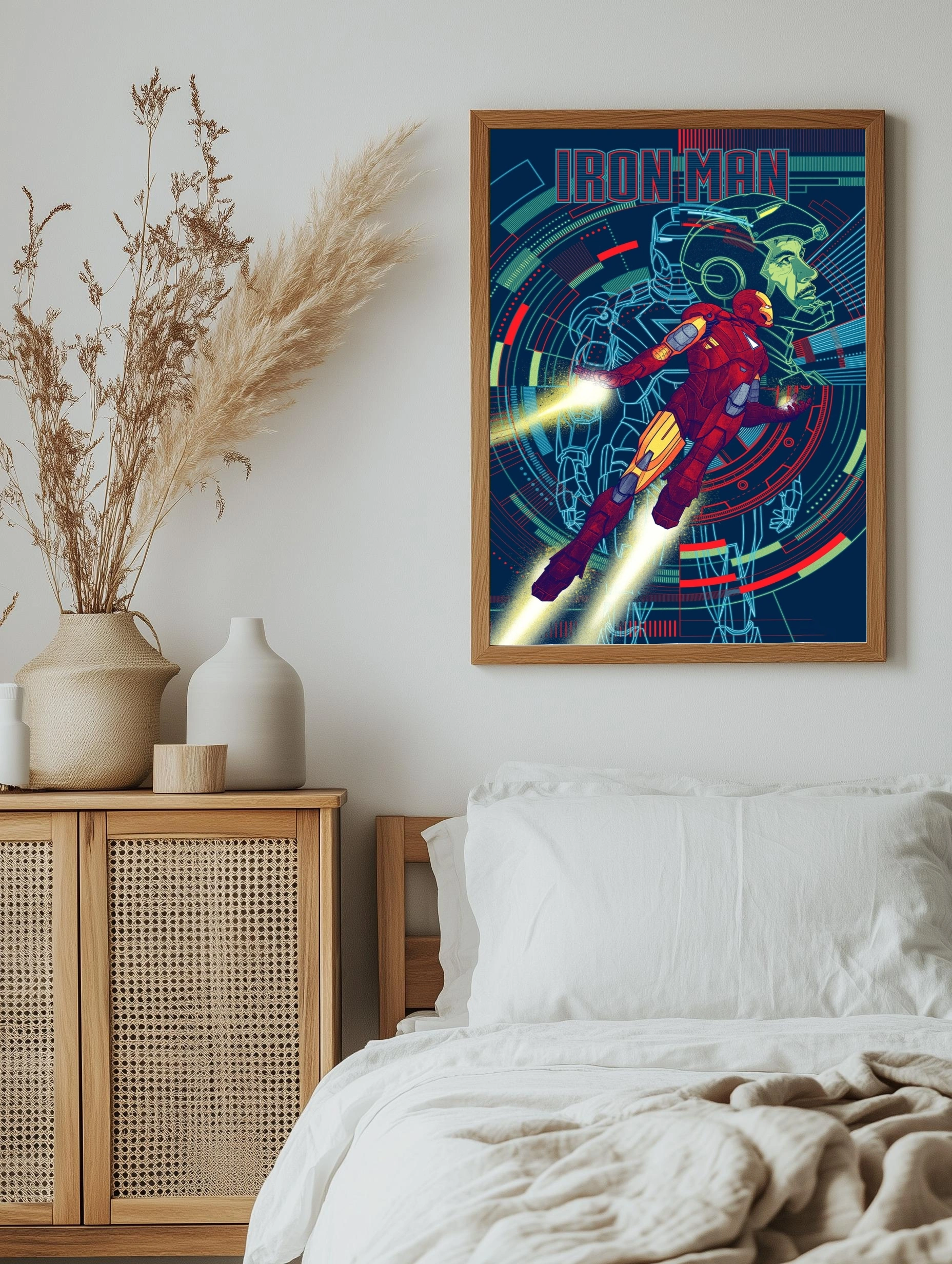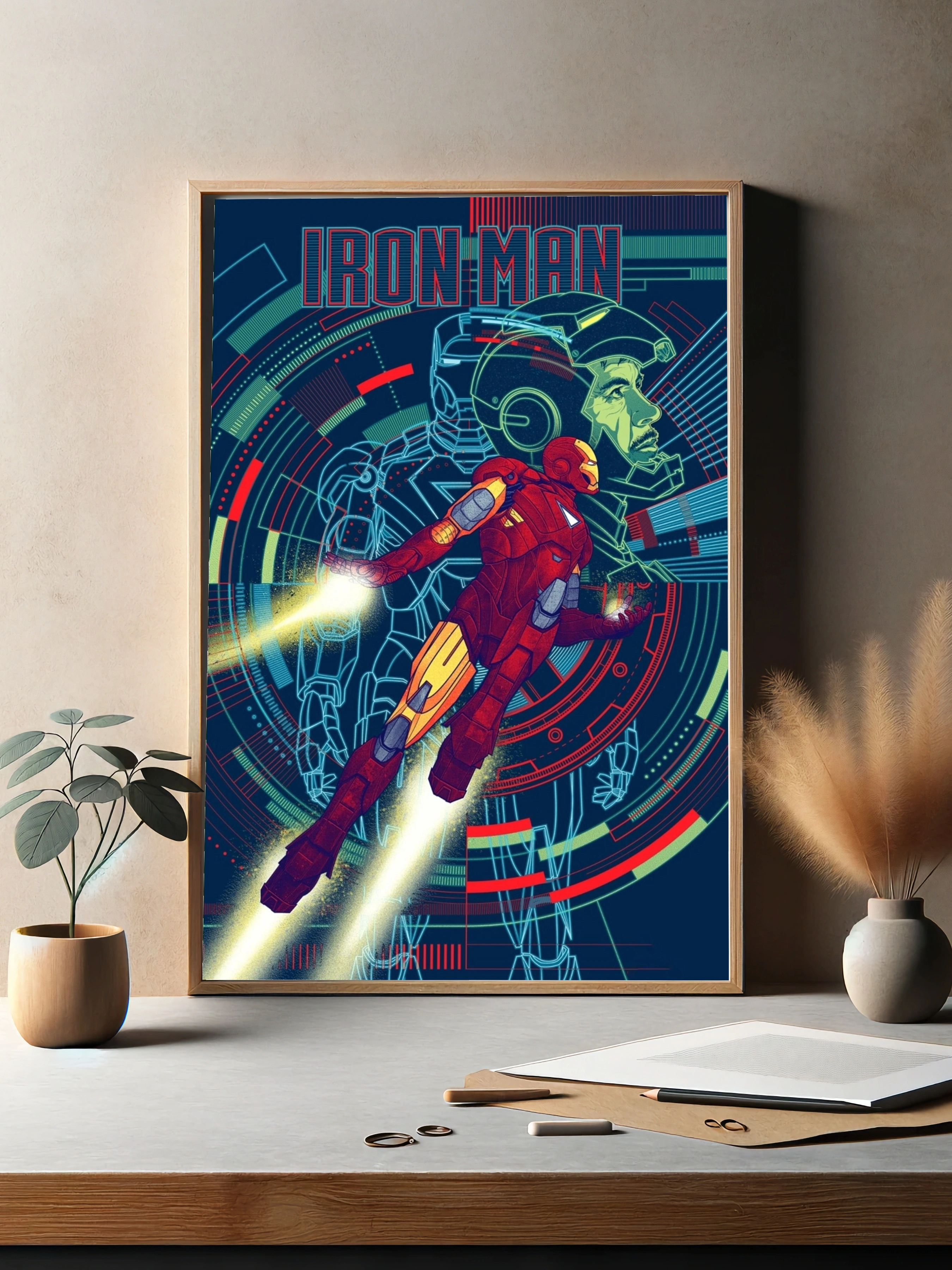 Яркое изображение Железного человека, где технологичный костюм демонстрируется в полёте с эффектами света и графическими элементами на фоне. Постер в стиле современного искусства для стен, идеально подходит для интерьера гостиной или офиса. Стильный настенный декор с героем Marvel, сочетающий динамику и футуризм.
