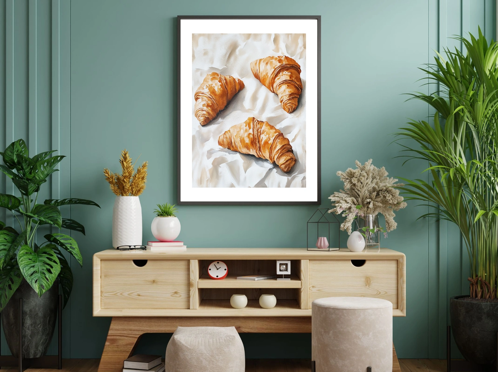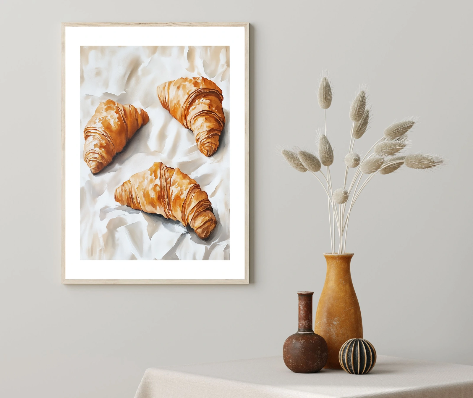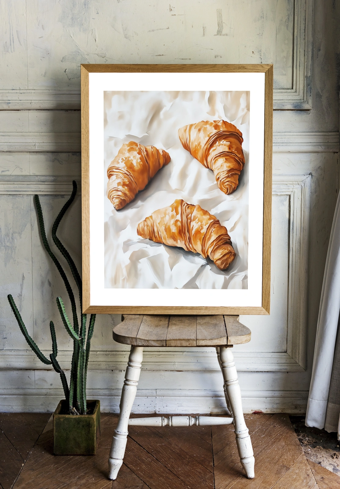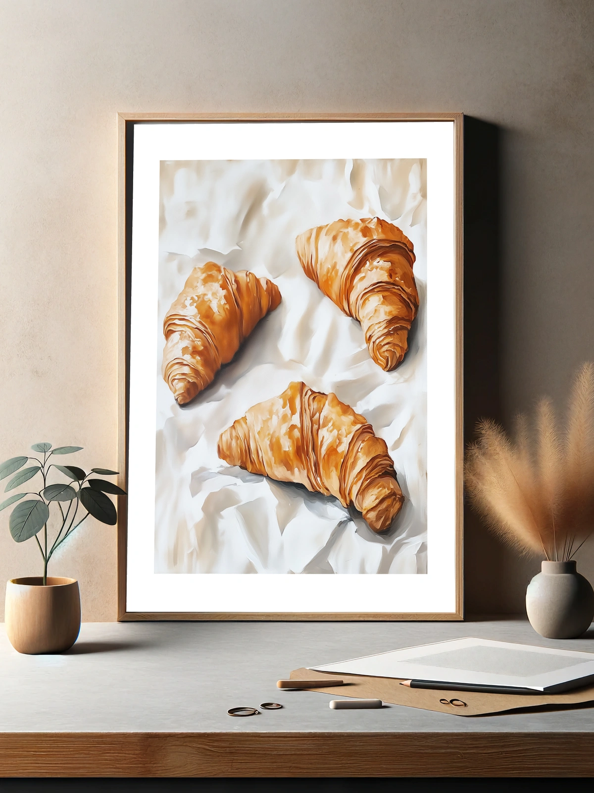 На изображении изображены три аппетитных круассана, лежащих на светлой материи, создающей ощущение воздушности и лёгкости. Круассаны имеют золотисто-коричневую корочку, которая выглядит очень аппетитно и хрустяще. Такое изображение прекрасно передаёт атмосферу утренней французской пекарни, создавая уют и домашнюю обстановку. Светлая ткань подчеркивает насыщенность цвета выпечки и добавляет всему изображению свежий и лёгкий вид. Это изображение идеально подойдет для украшения кухни или столовой, добавляя нотку французского шика и тепла. Стиль, подходящий для такой картины, — ‘Современный’, благодаря своему минимализму и эстетичности. Основной цвет изображения — золотистый, вторичный цвет — белый, что делает картину подходящей для современных интерьеров. Это изображение несёт в себе элемент спокойствия и нежности, что ассоциируется с началом нового дня и свежим завтраком.