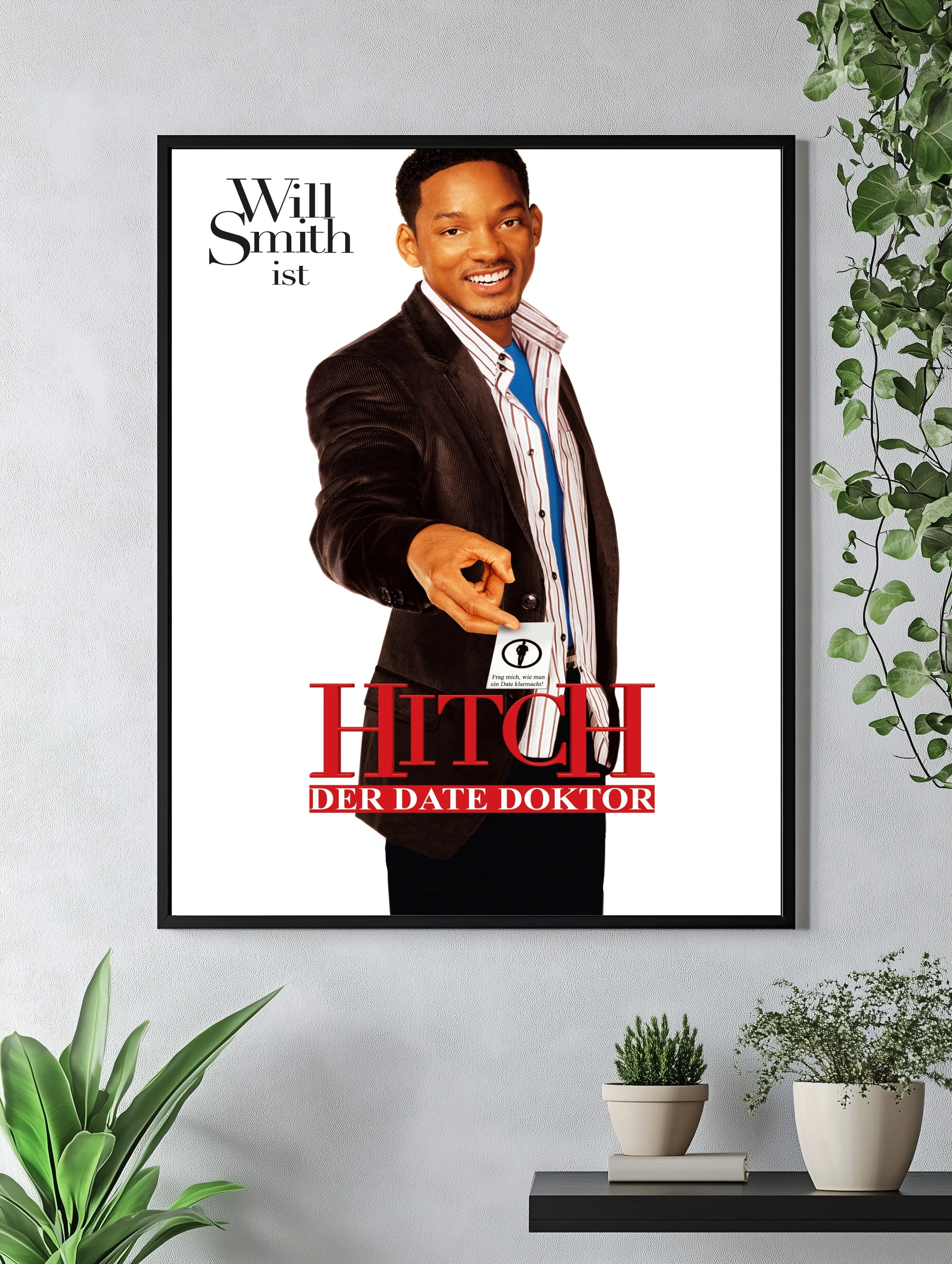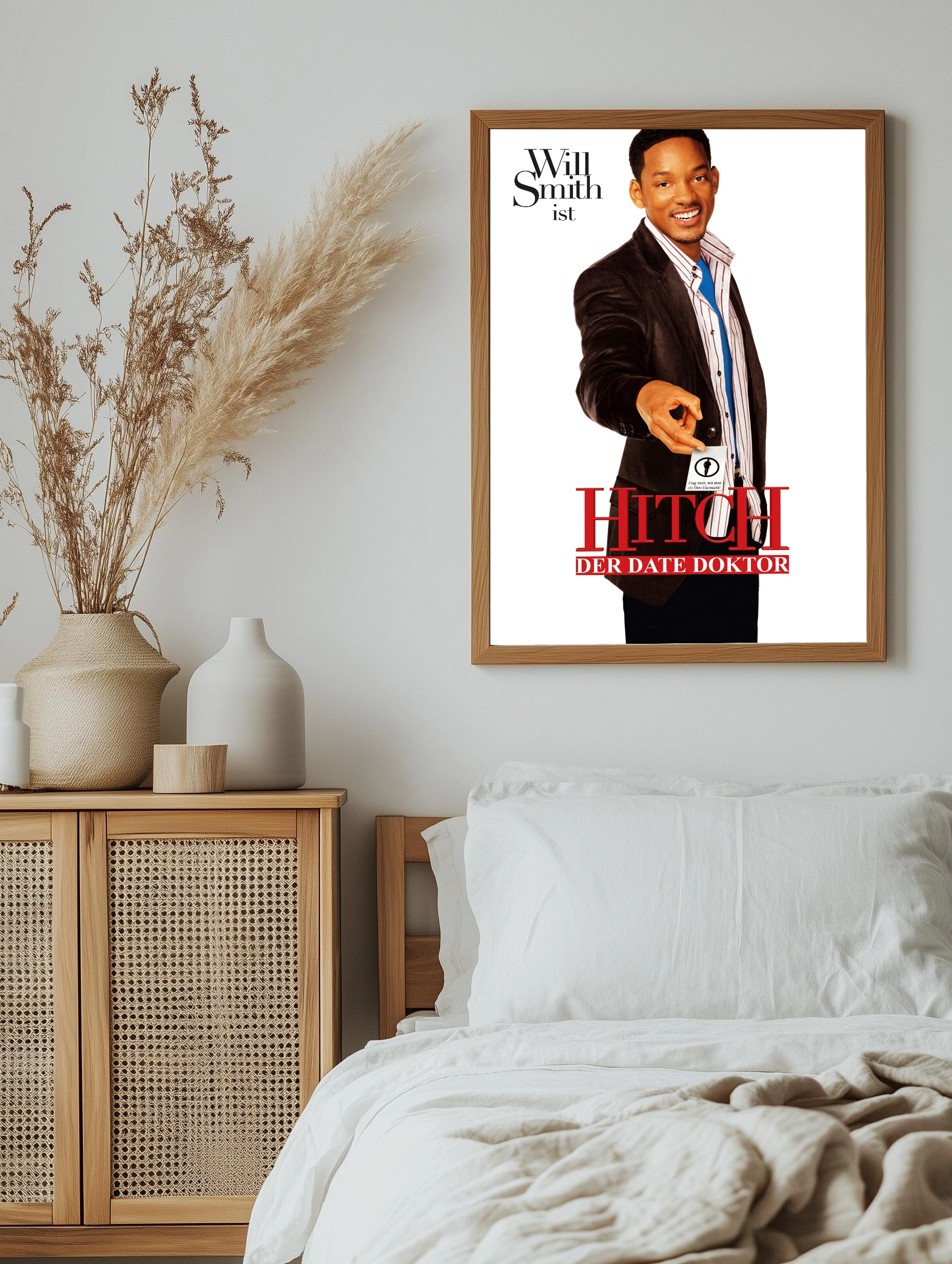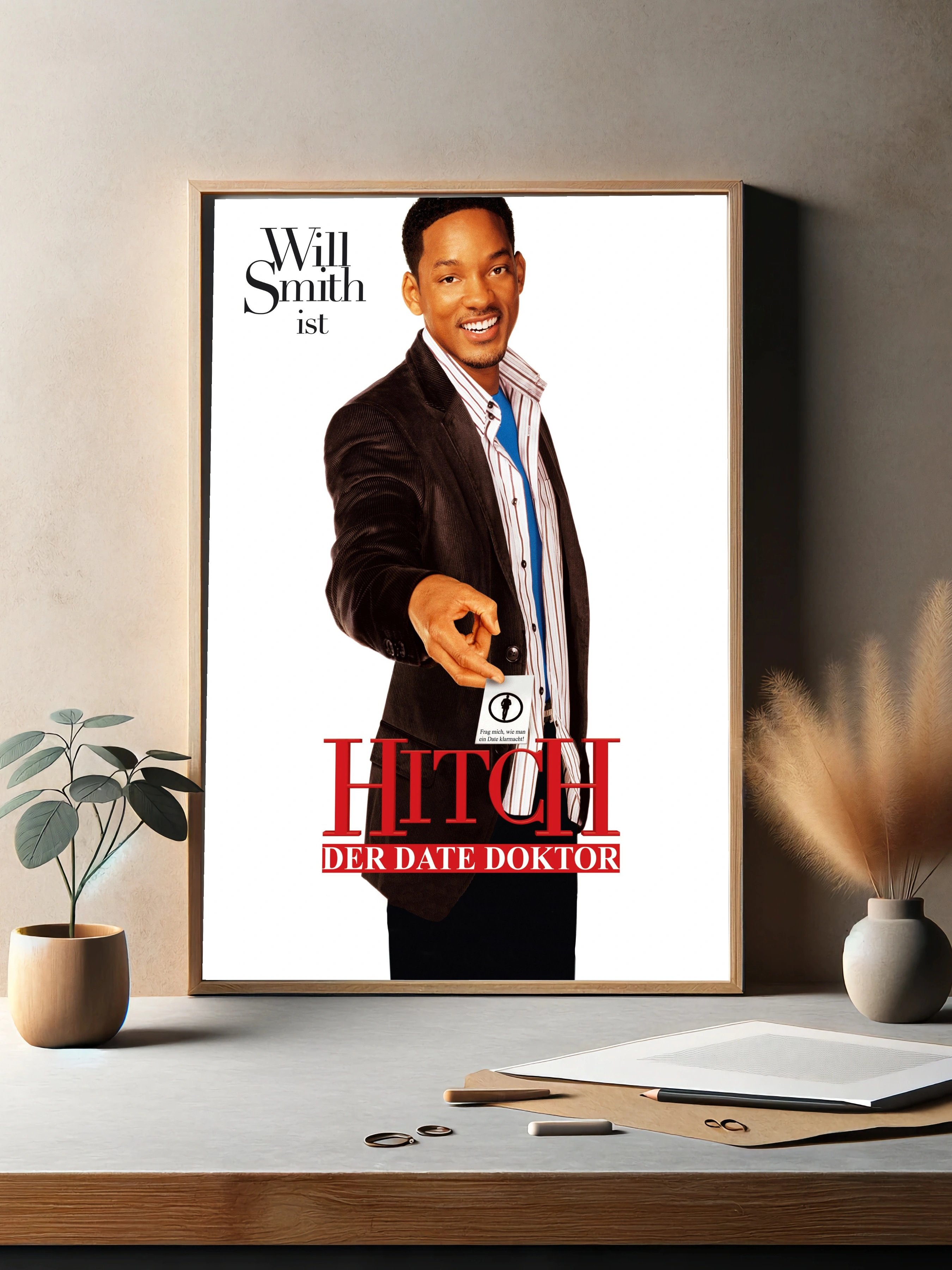 Яркий и стильный интерьерный постер с изображением актера Уилла Смита из фильма «Метод Хитча». Чистый белый фон усиливает акцент на доброжелательной улыбке и харизматичной позе героя, держащего визитку. Отличный выбор для современного искусства для стен в офисе или гостиной.