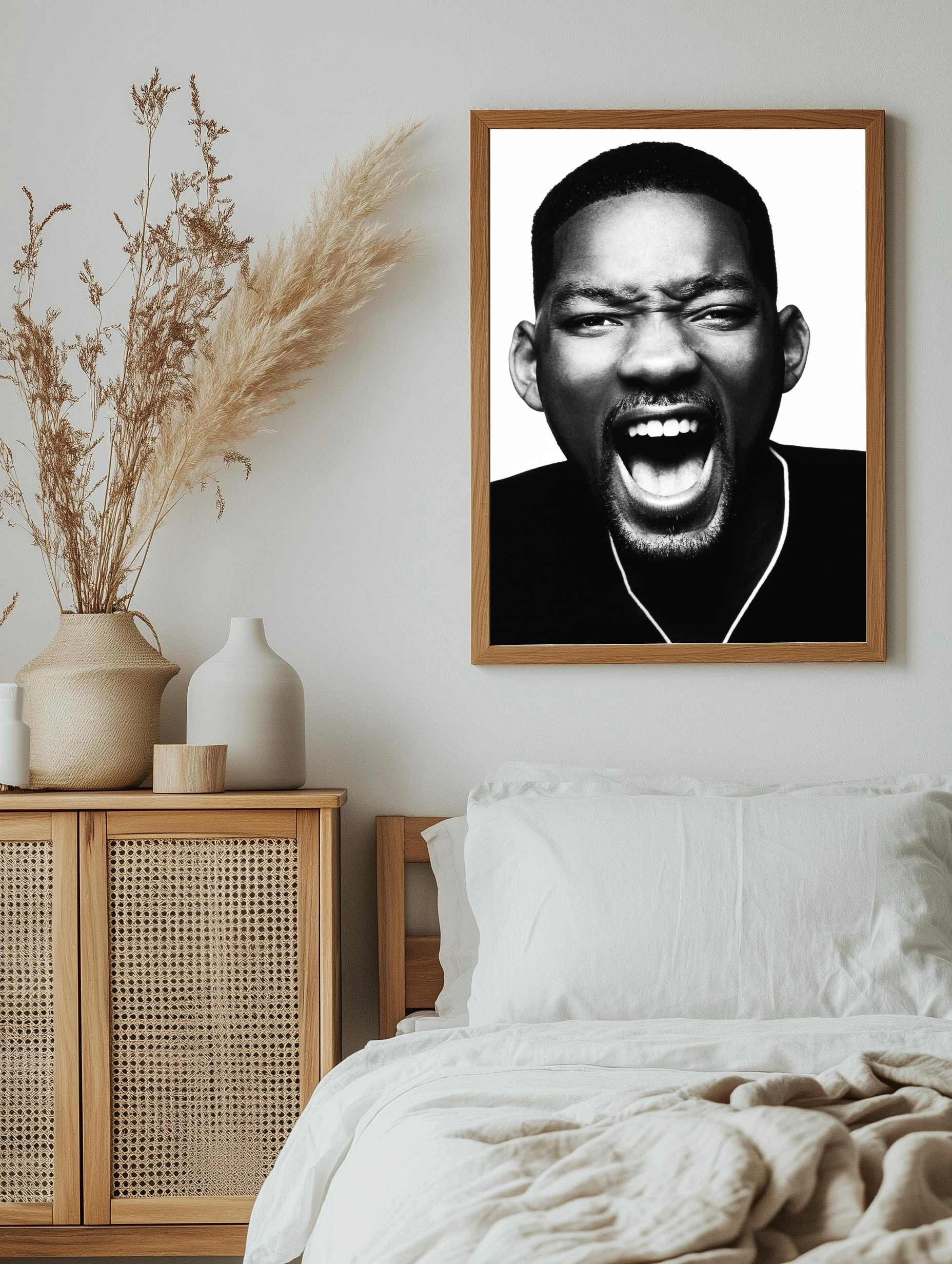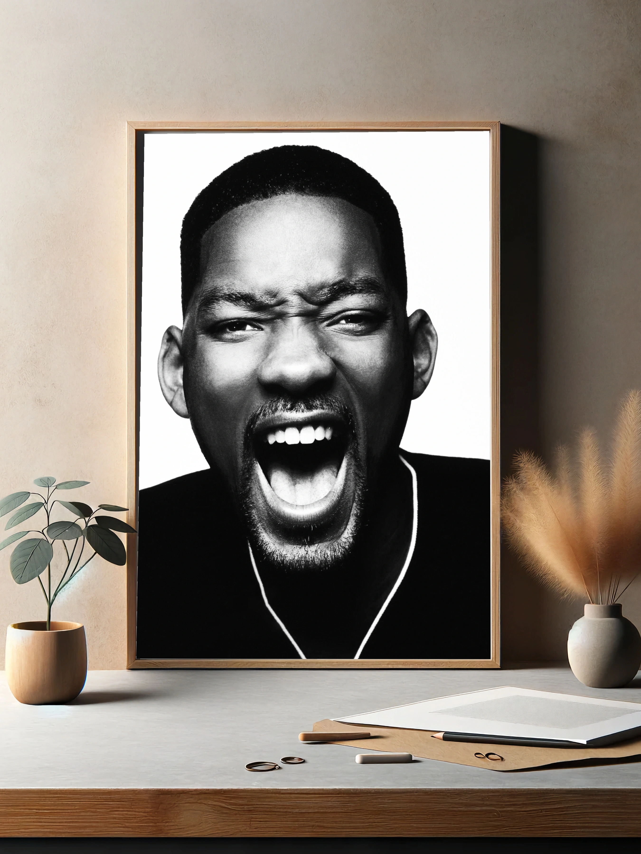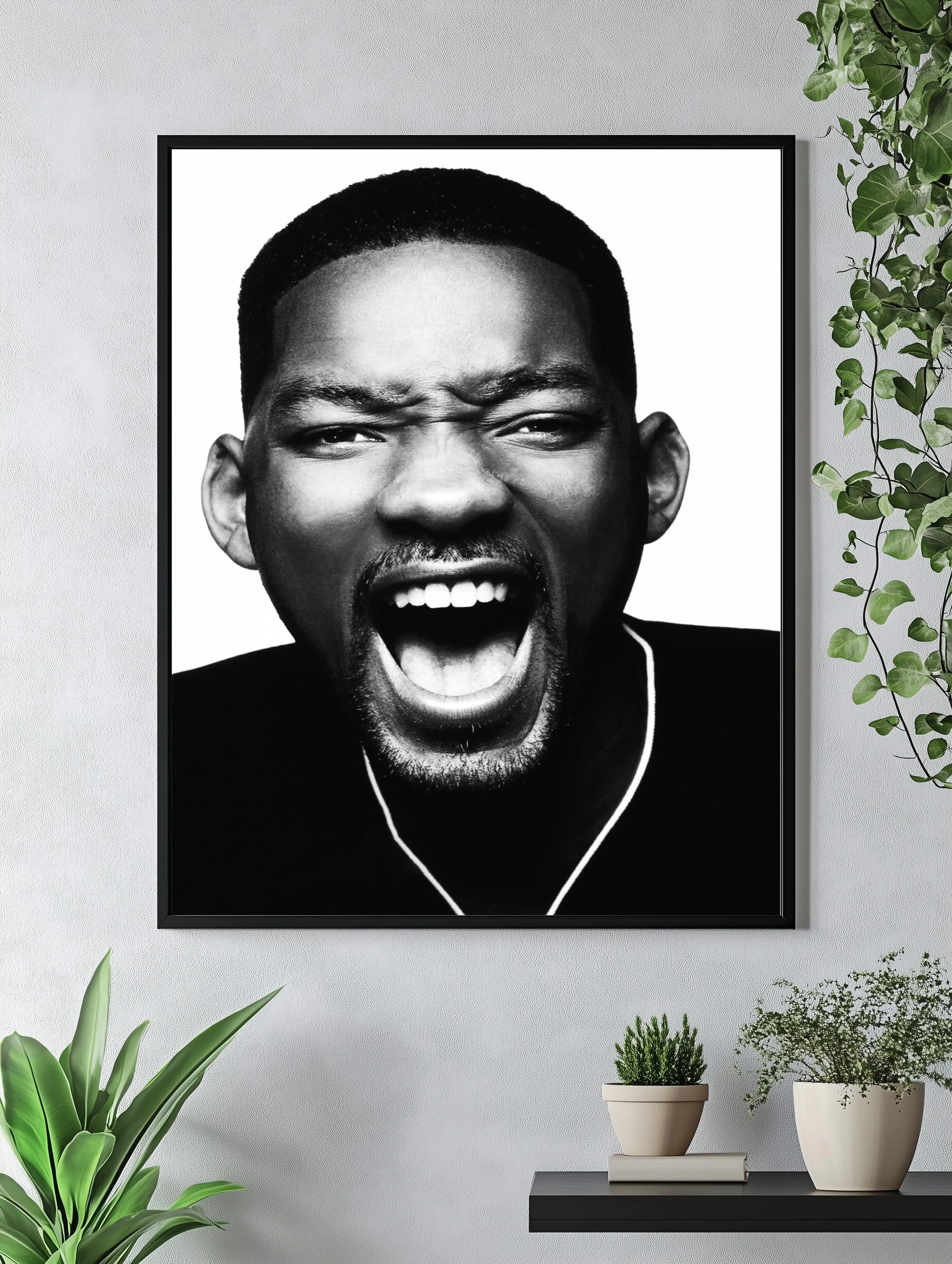 Чёрно-белый художественный фотопортрет Уилла Смита с открытым ртом, выражающим эмоции и энергию. Высококонтрастное современное искусство для стен, идеально подходящее в интерьер как картина для гостиной или офиса. Стильный декор стен, подчеркивающий динамику и силу личности.
