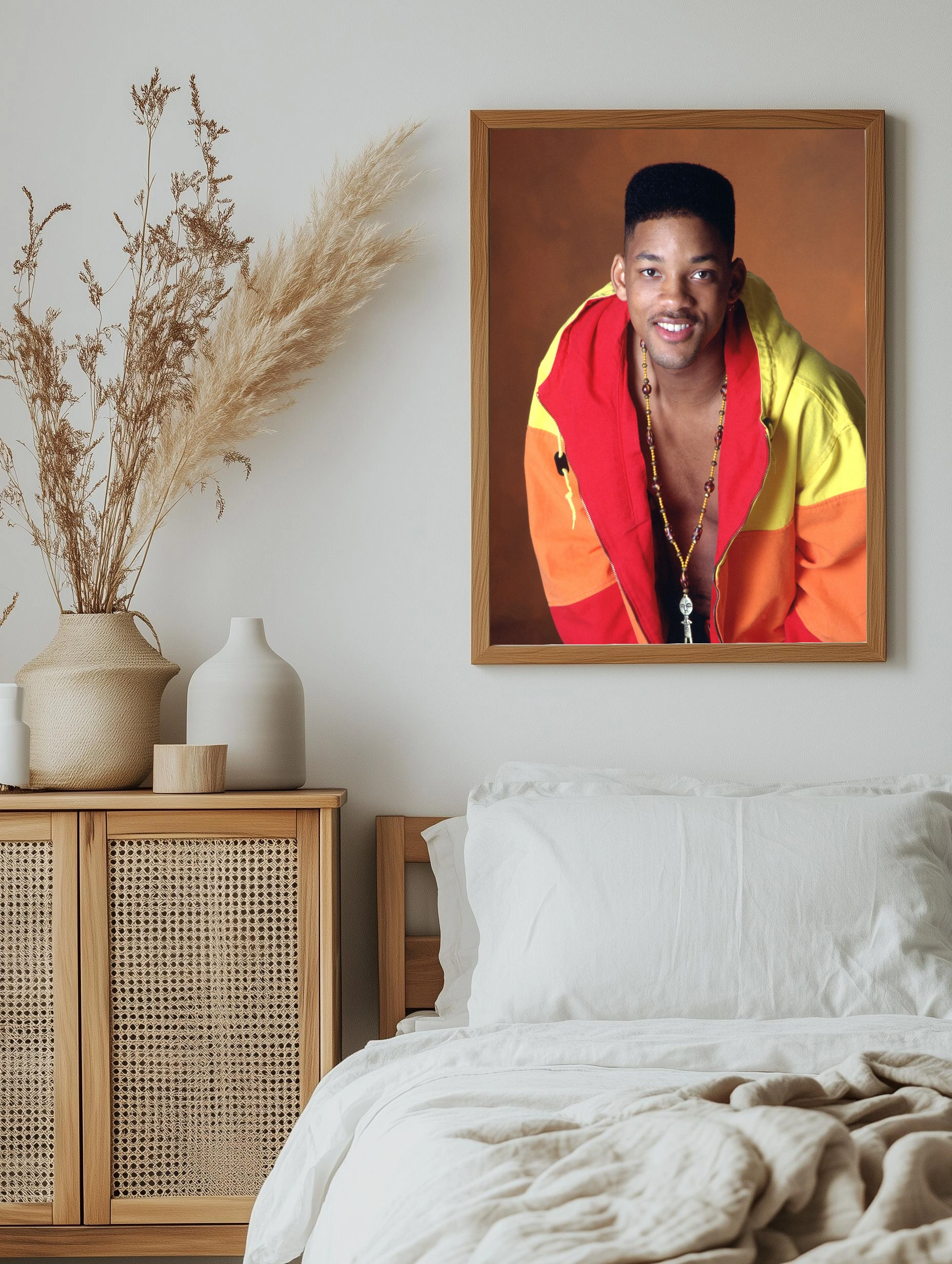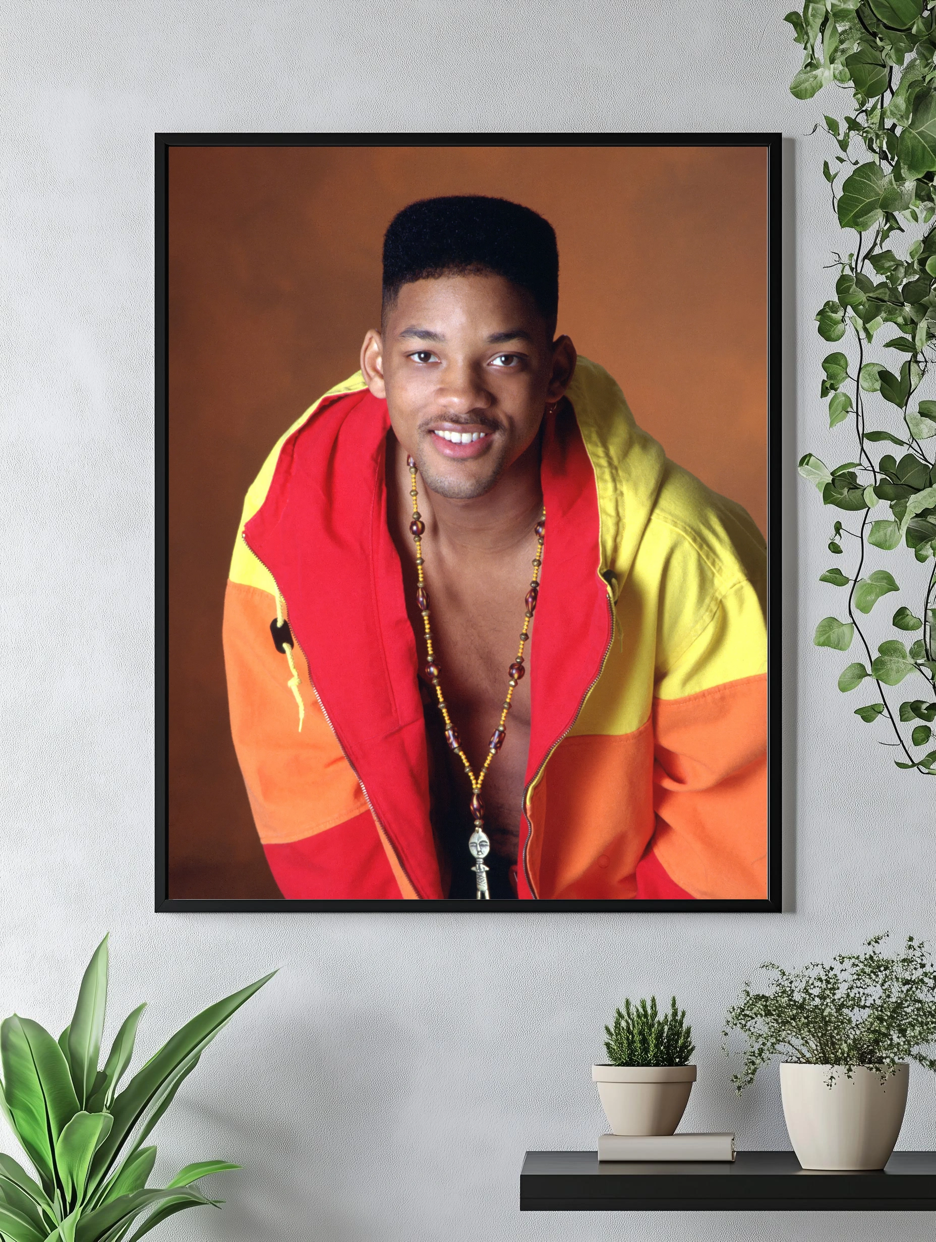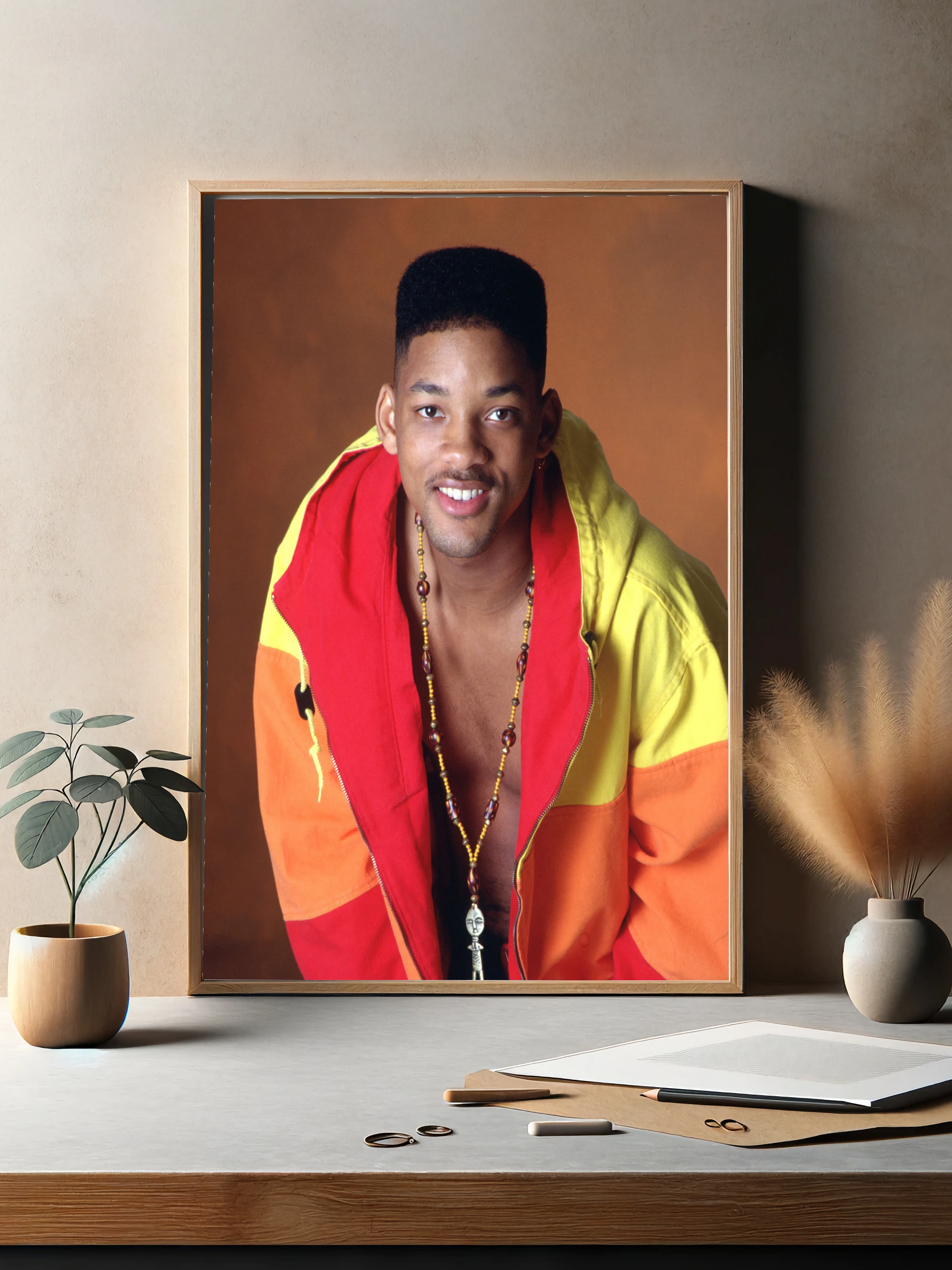 На изображении изображён Уилл Смит — известный актёр и музыкант, символик 90-х. Он одет в яркую куртку с оттенками жёлтого, красного и оранжевого цветов, что создаёт тёплое и позитивное настроение. Фото выполнено в стиле портрета с акцентом на улыбку и дружелюбие, подходящий интерьерный арт для современных интерьеров и декоративного оформления.