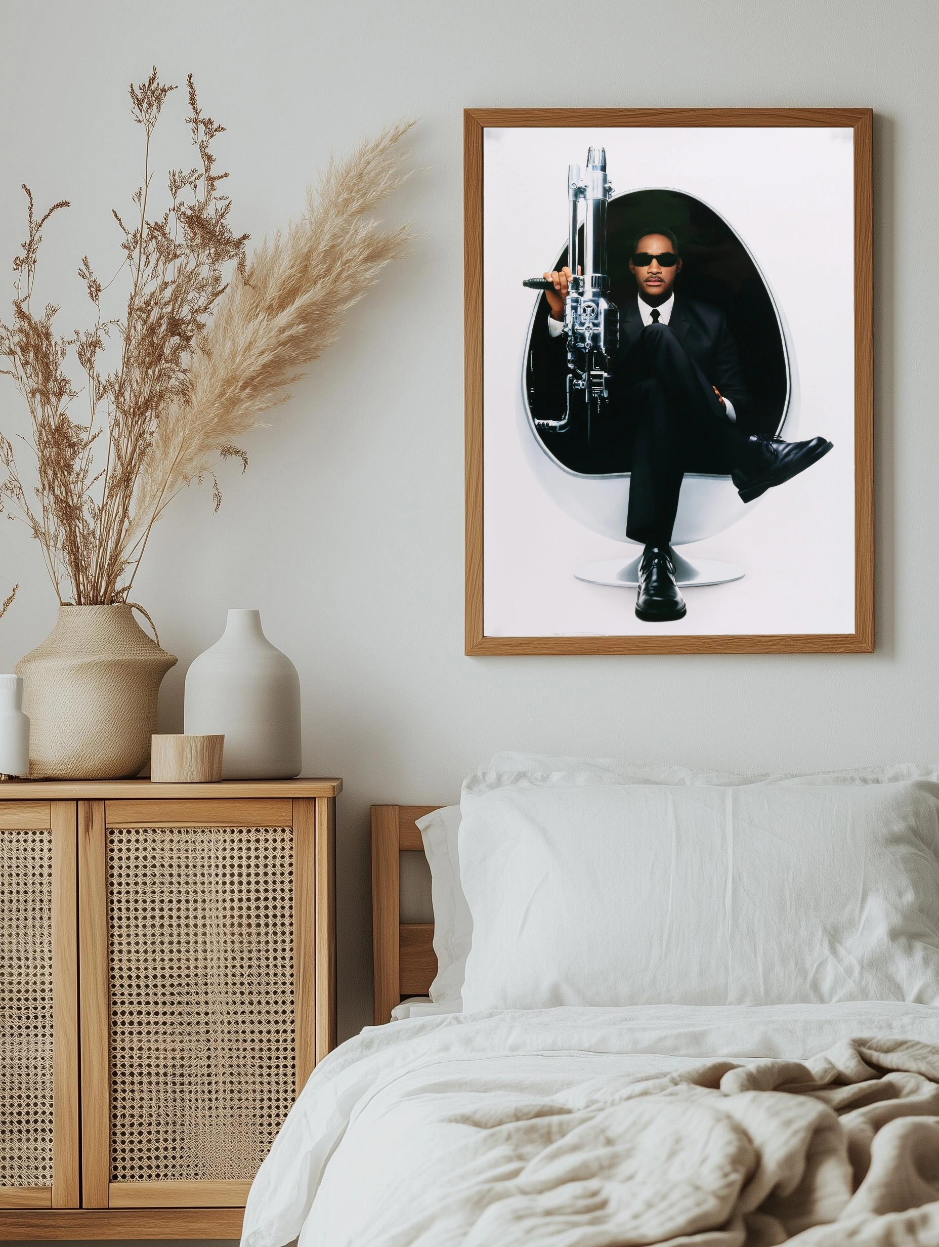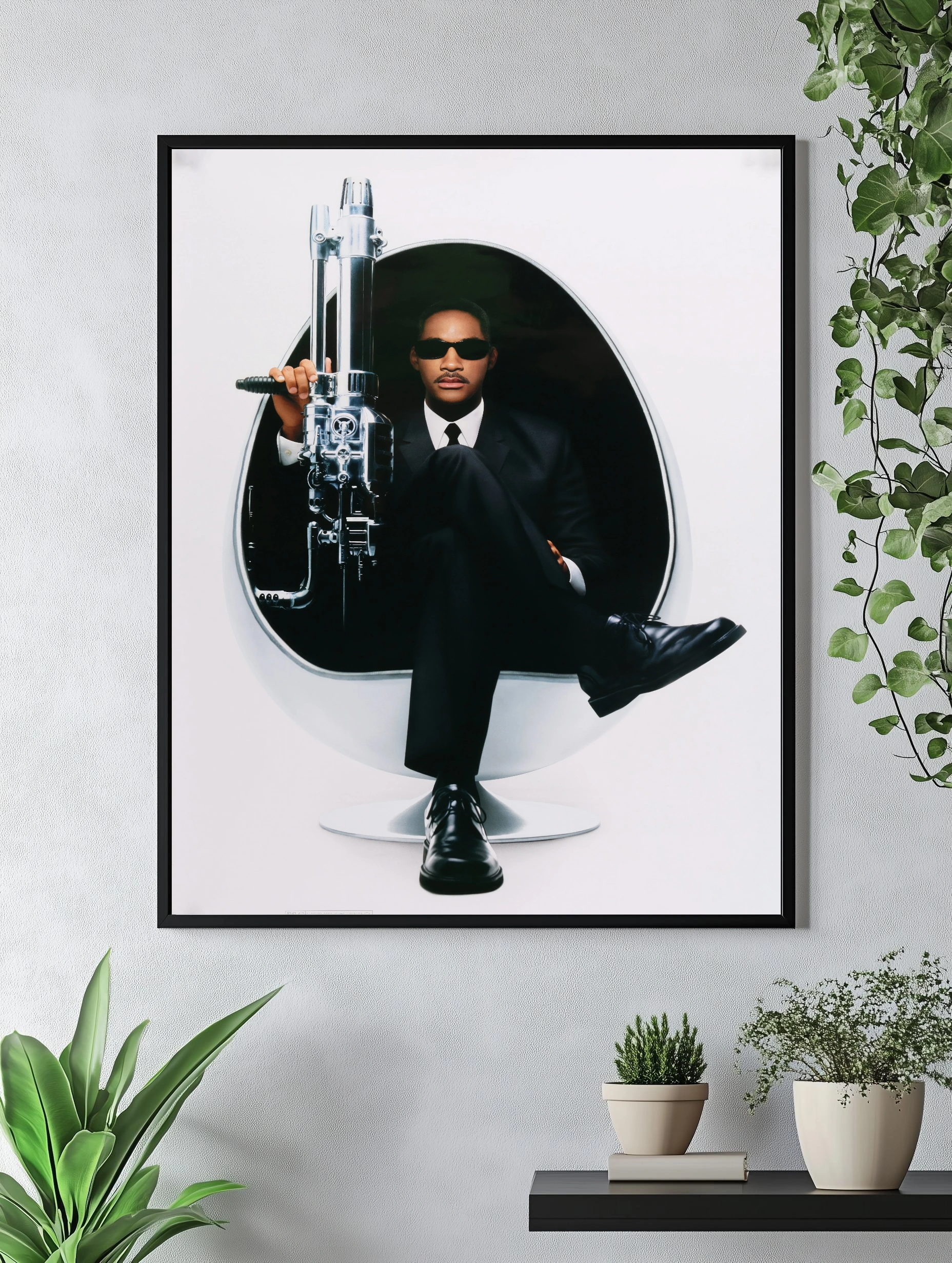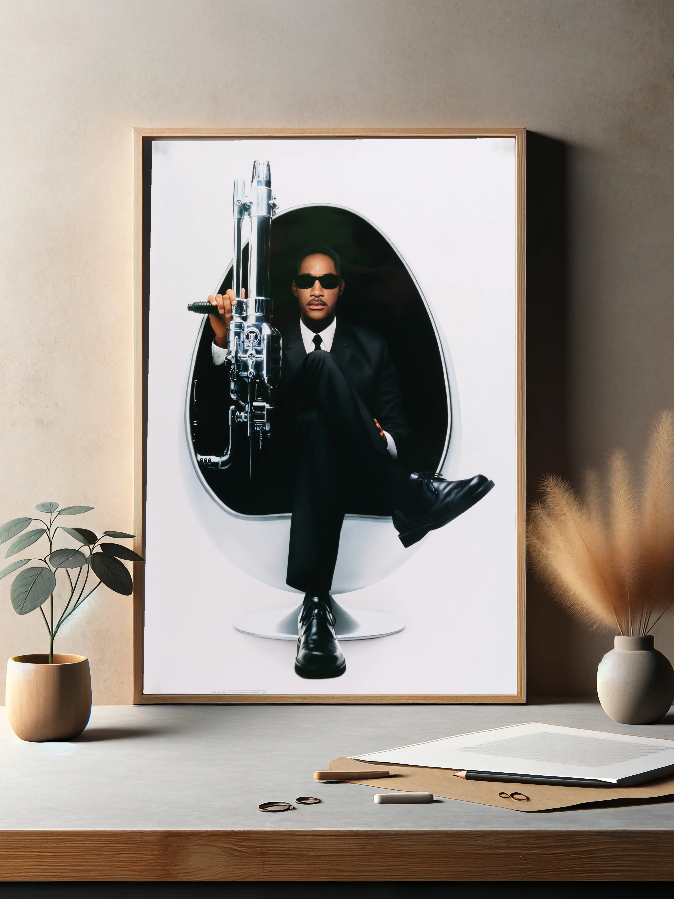 Яркая картина для гостиной и офиса с изображением стильно одетого мужчины в строгом черном костюме и солнцезащитных очках, сидящего в футуристическом кресле в форме яйца и держащего большое хромированное оружие. Настенный декор создает атмосферу современного искусства и загадочности, идеально подходящую для стильного интерьера.