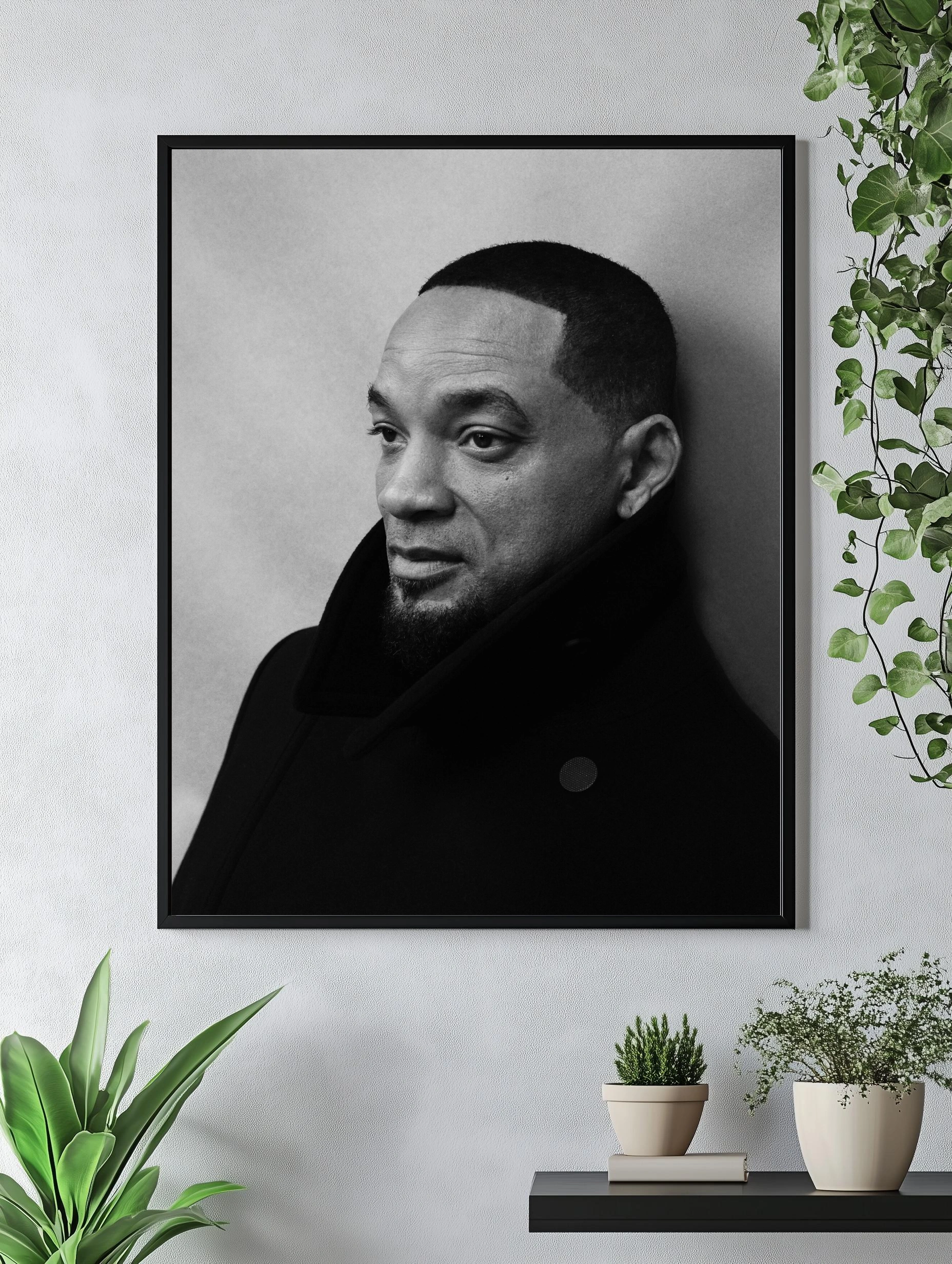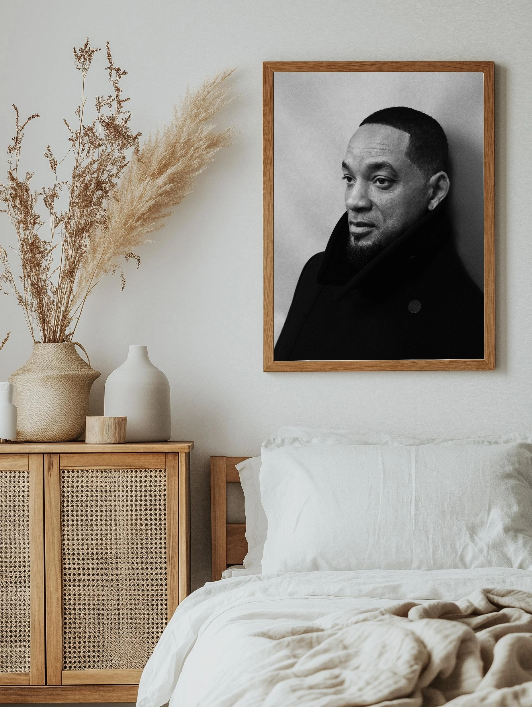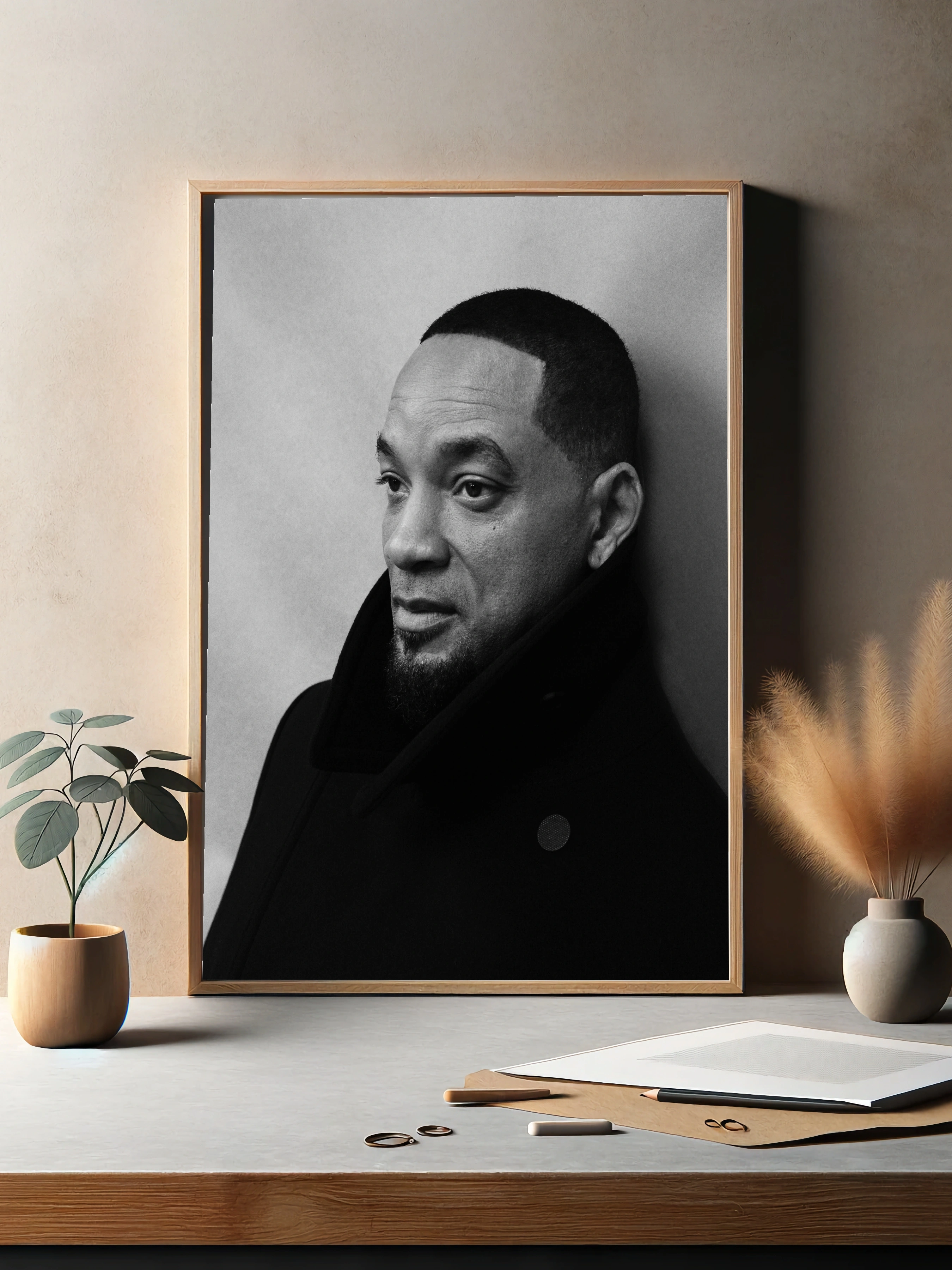 Изящный черно-белый фотопортрет знаменитого актера Уилла Смита, выполненный в классическом монохроме. Картина для гостиной или офиса создает атмосферу глубины и элегантности, идеально подходящая для современного искусства для стен и стильного интерьерного декора.