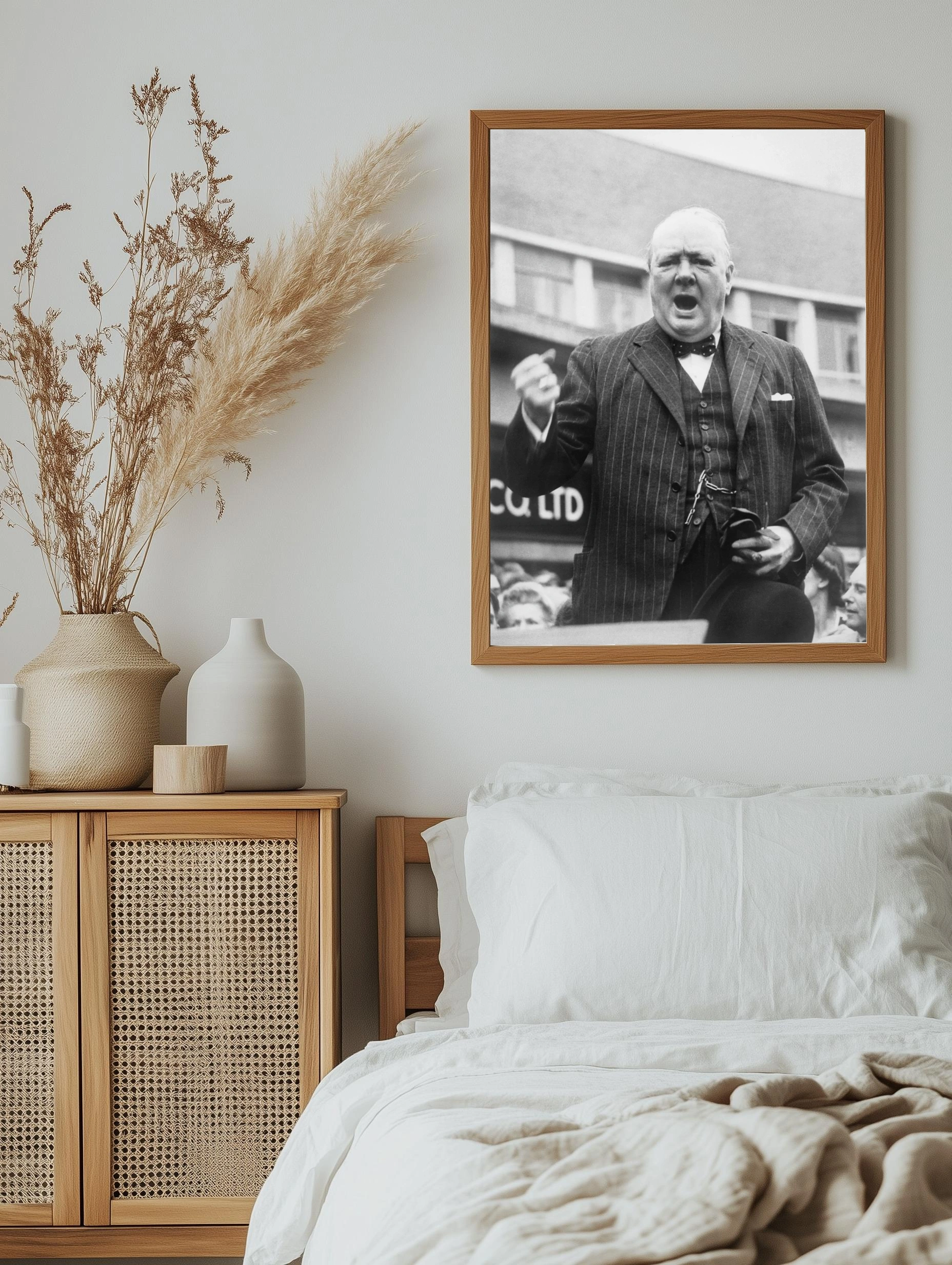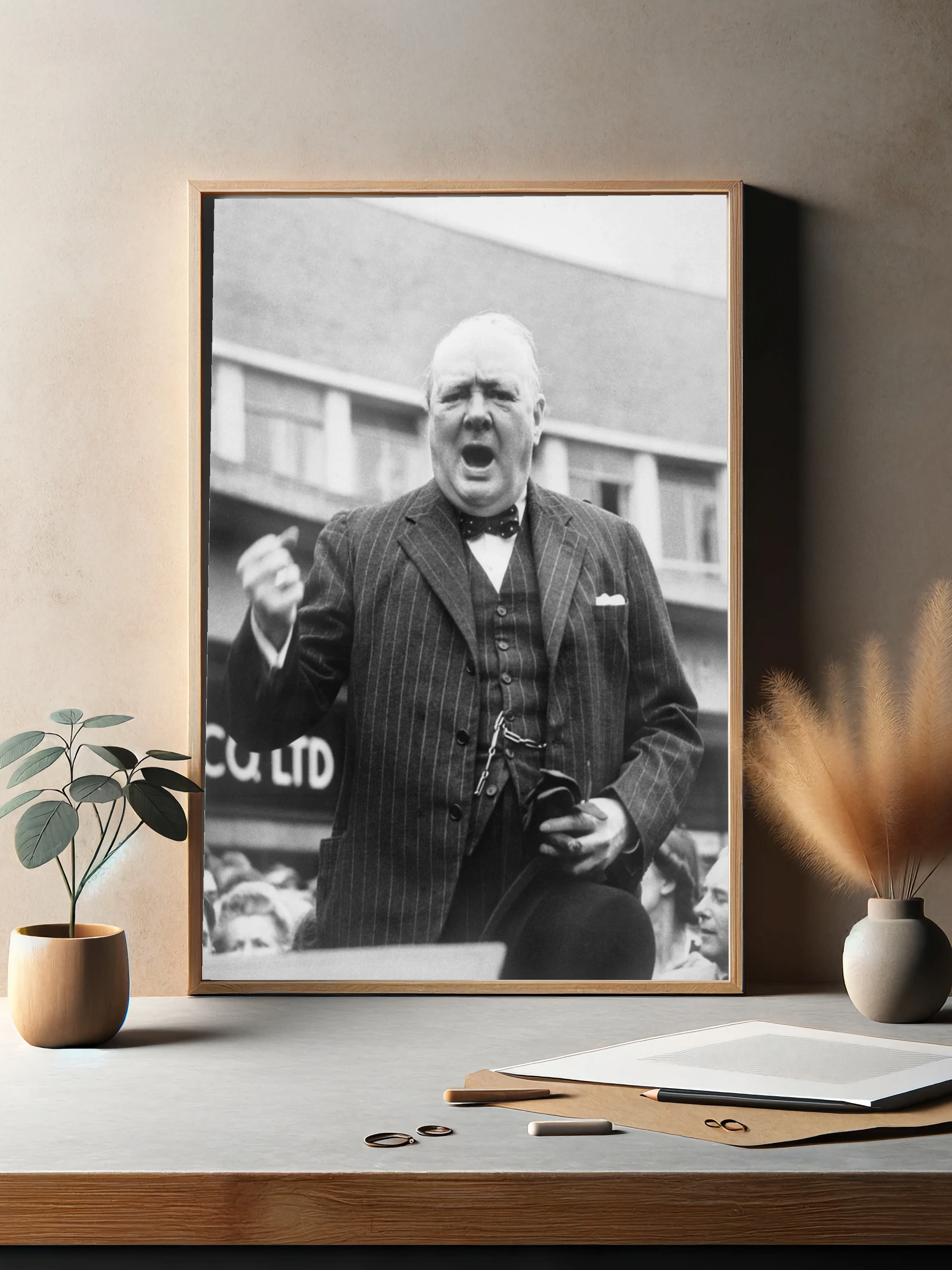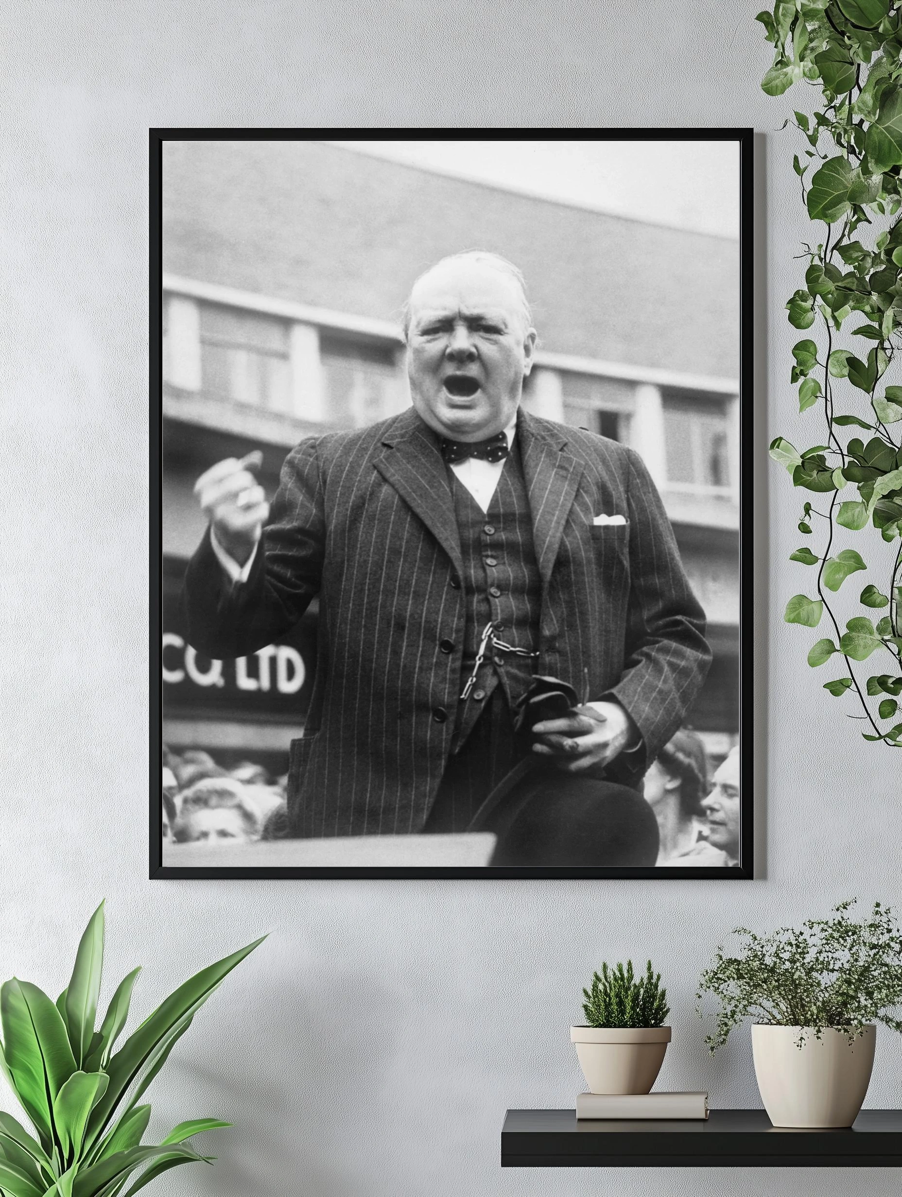 Чёрно-белая фотография представляет влияние и харизму Уинстона Черчилля, одного из самых известных государственных деятелей XX века. На изображении Черчилль в строгом костюме с бабочкой, держащий шляпу и выступающий на публике с решительным выражением лица. Эта историческая картина отлично впишется в интерьер гостиной или офиса, придавая атмосфере серьезность и стиль.