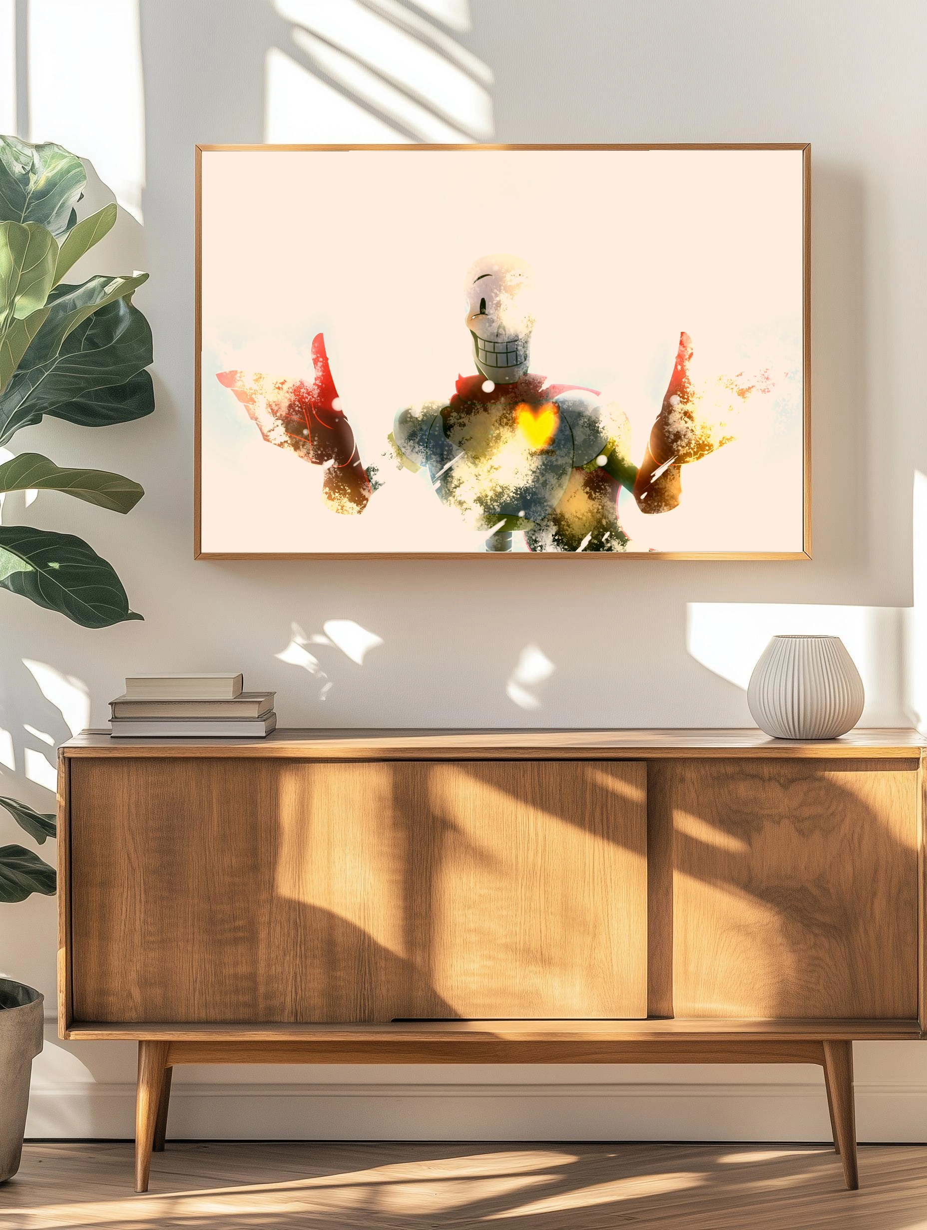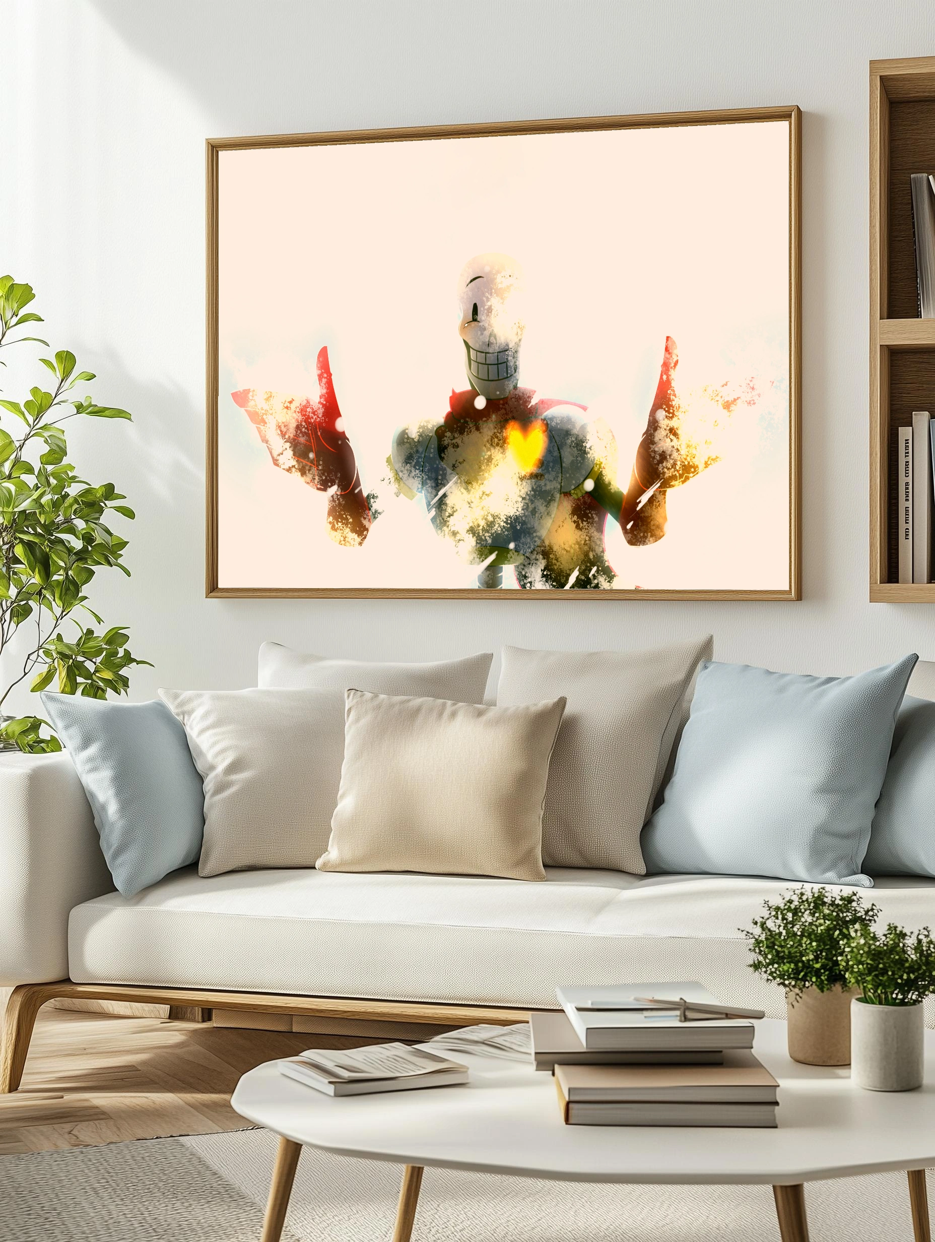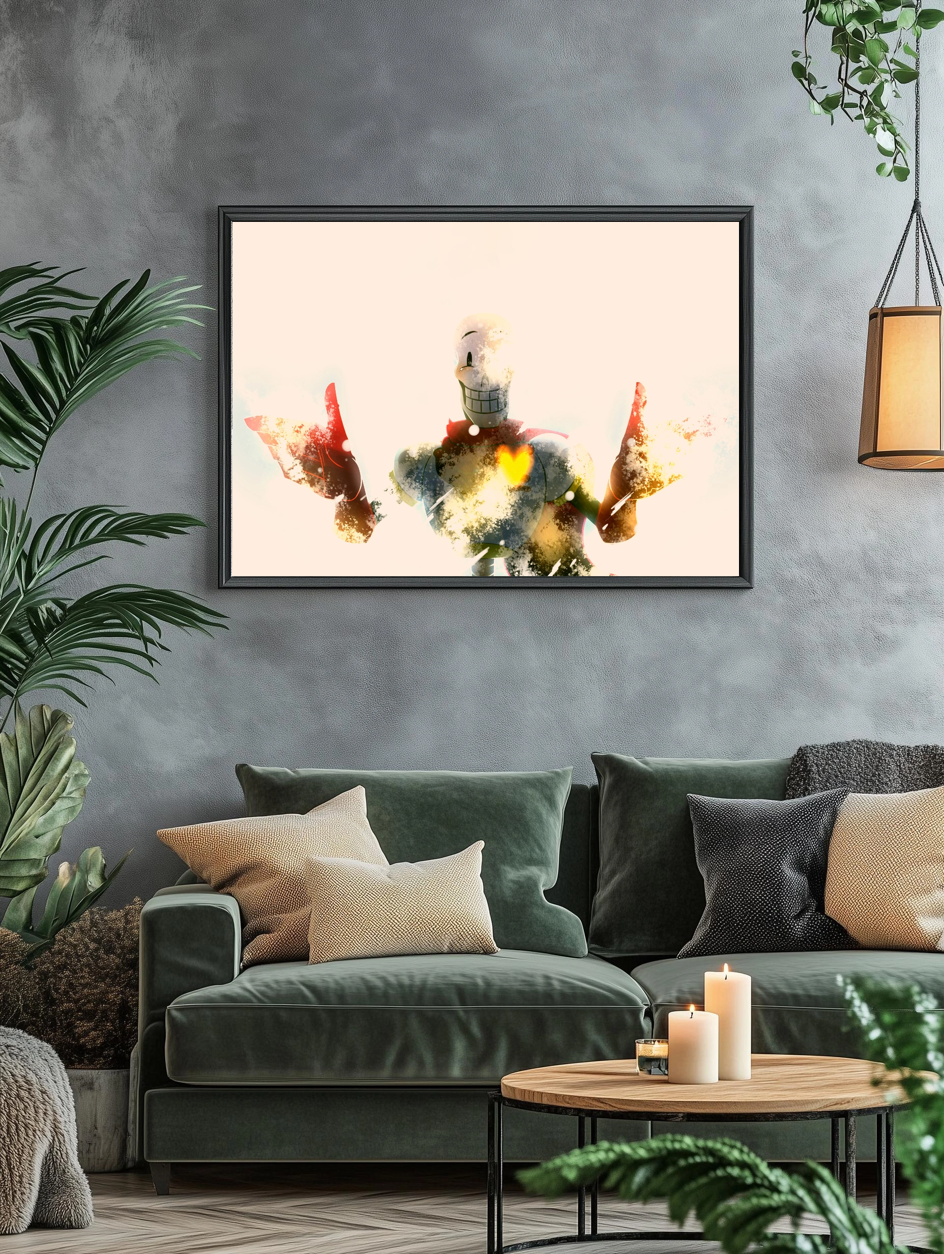 Декоративная картина с изображением известного персонажа игры Undertale, выполненного в стиле цифровой живописи с эффектом дымки и свечения. Главные цвета — тёплый жёлтый, красный и чёрный, создающие атмосферу таинственного света и внутреннего тепла. Такой интерьерный каркас идеально подойдет для спальни, гостиной или офиса, добавляя современное искусство для стен и уникальный стильный декор.