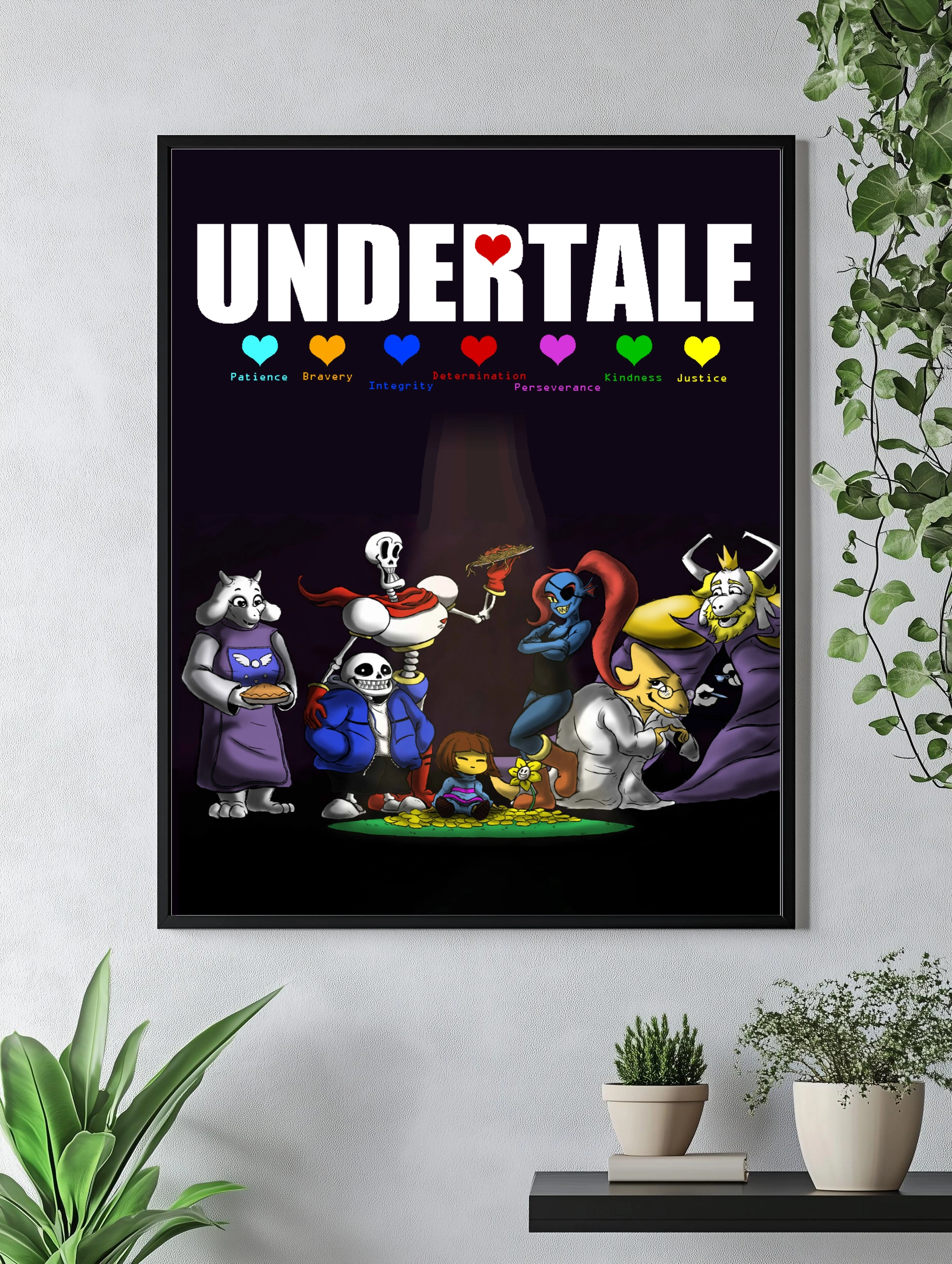 Изображение представляет собой интерьерное искусство с персонажами видеоигры Undertale: Ториэль с пирогом, Папайрус с тарелкой, Санса в синей куртке, Фриск и живой цветок Флауи, Андуна и Асгор с короной. Тёмный фон подчёркивает яркость героев, а разноцветные сердца символизируют качества, как терпение, храбрость, справедливость. Отличный декоративный плакат для стен, наполненный атмосферой игры, уникальный стильный декор для дома и офиса.