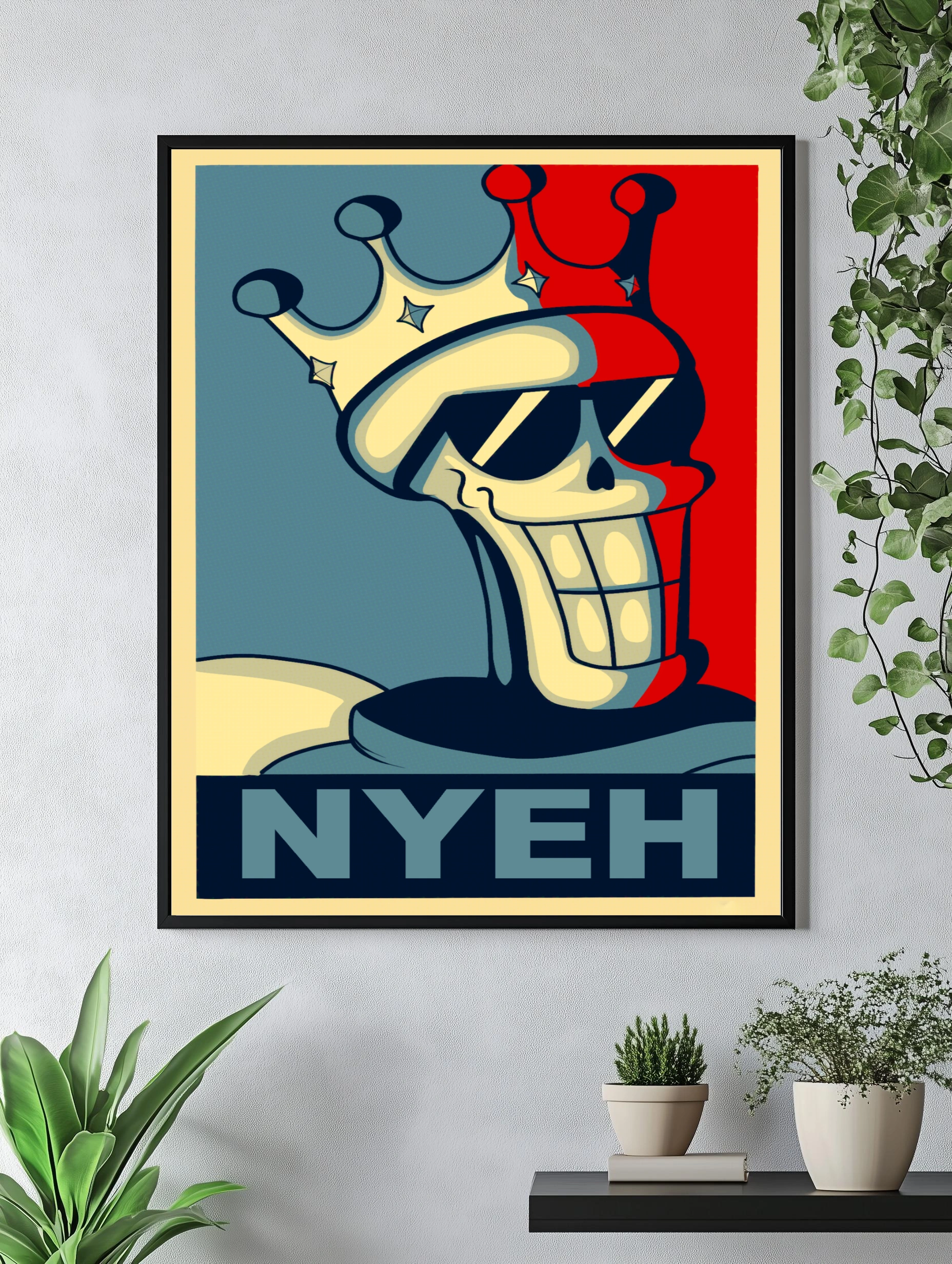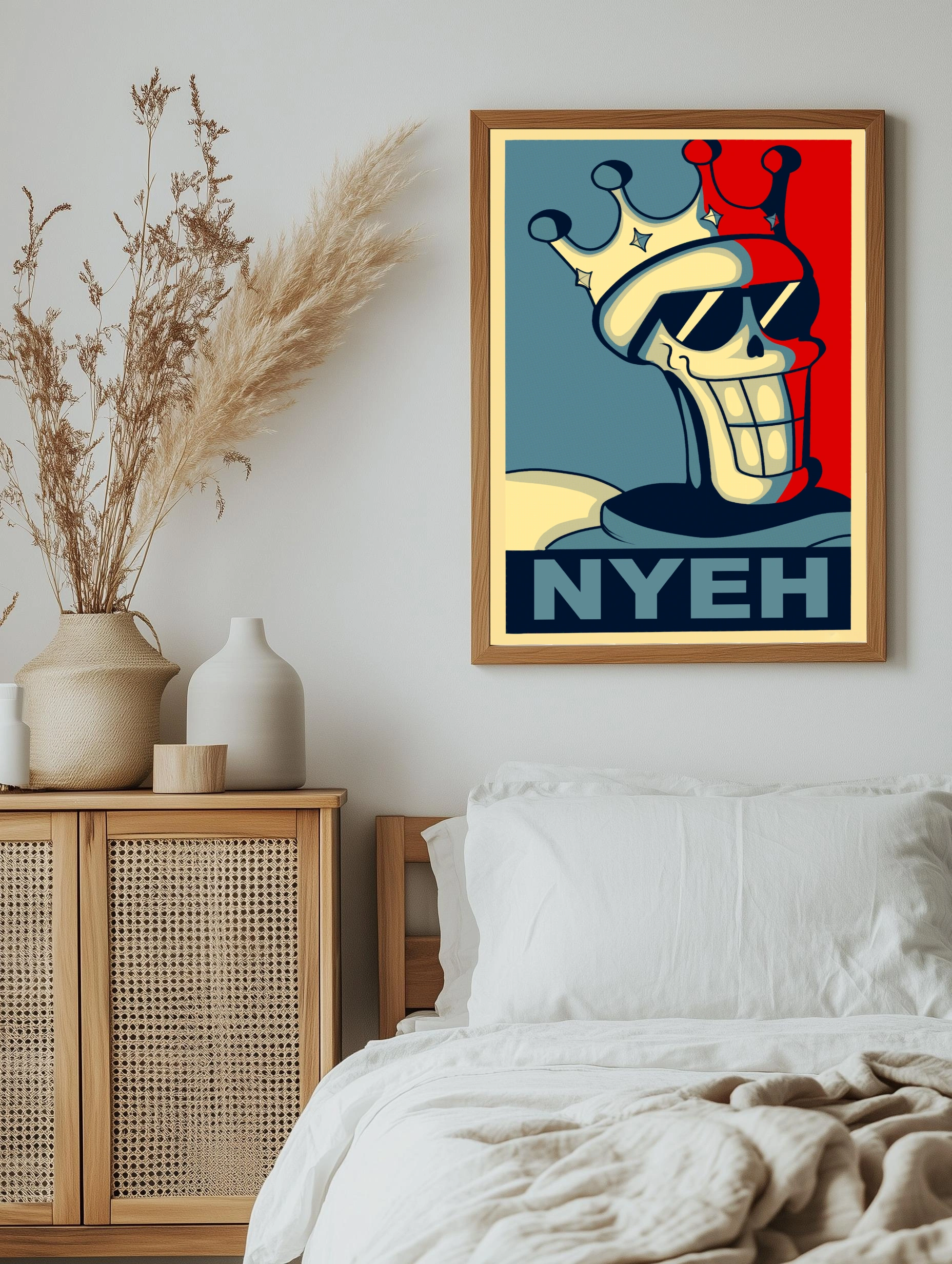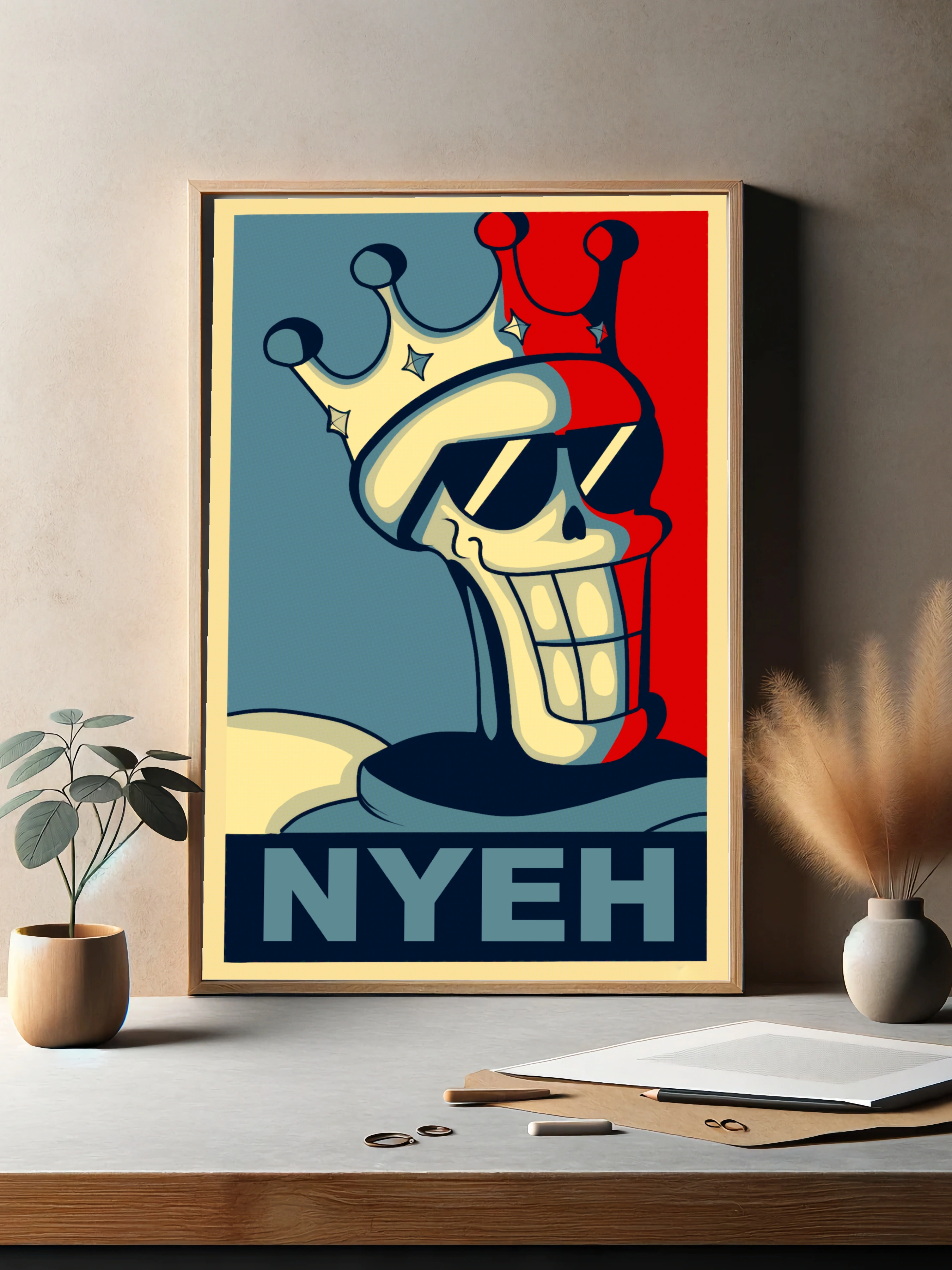 Изображение представляет собой стилизованный скелет с короной и солнцезащитными очками на фоне из синих и красных оттенков. Внизу крупная надпись NYEH добавляет графический акцент. Этот интерьерный арт идеально подходит как современное искусство для стен в гостиной или офисе. Идеально для тех, кто ценит уникальные картины для дома и стильный декор стен.