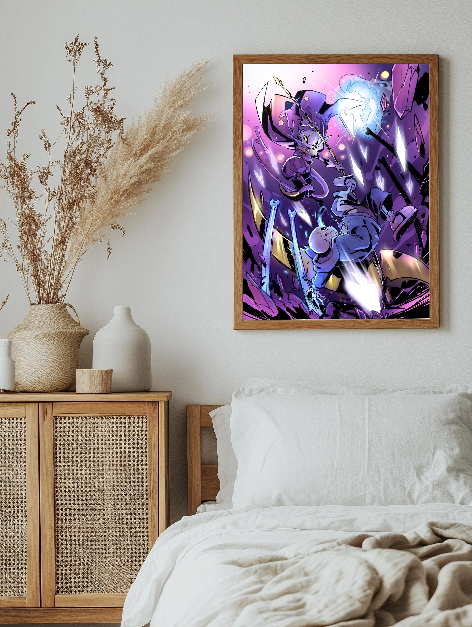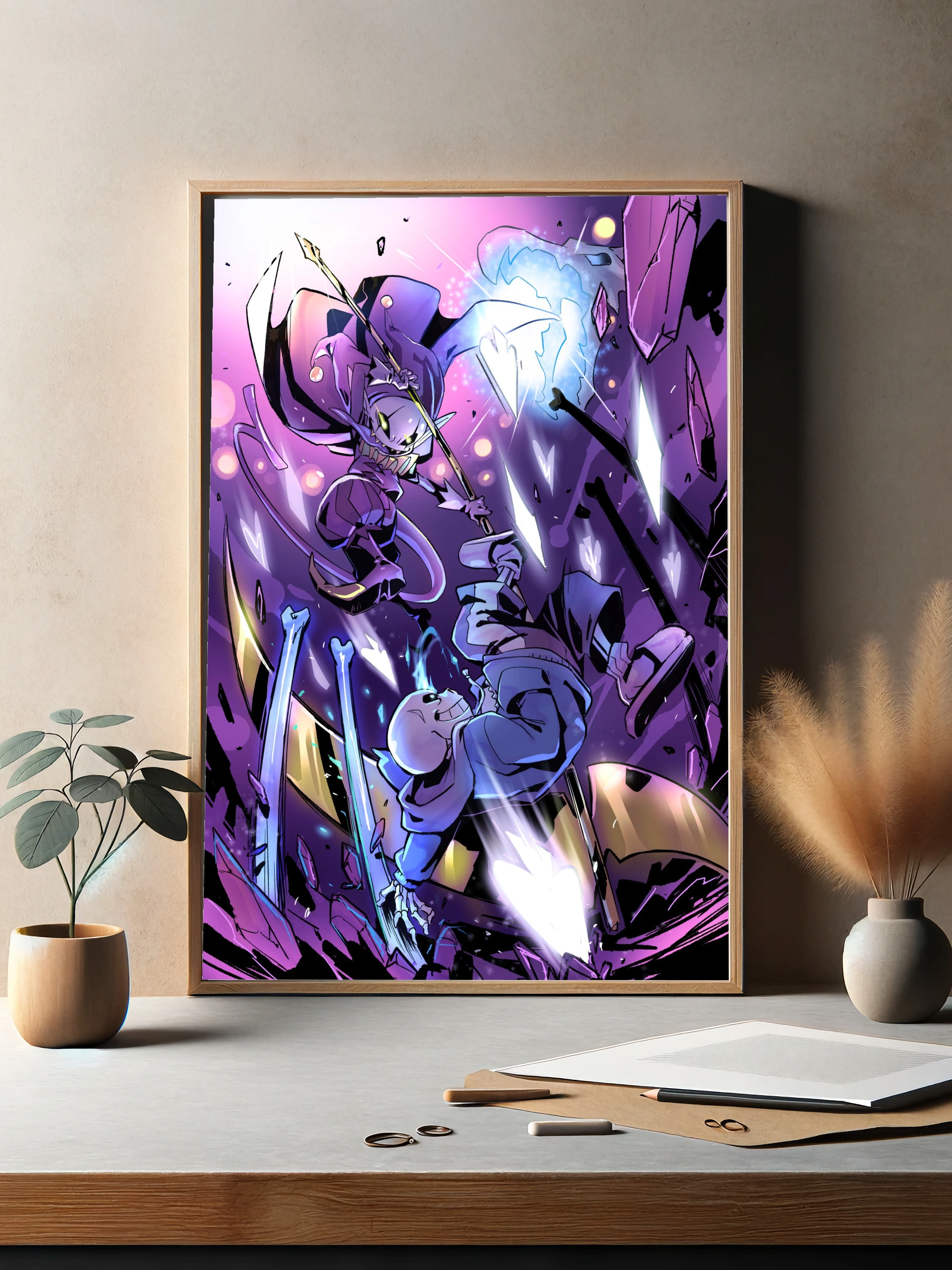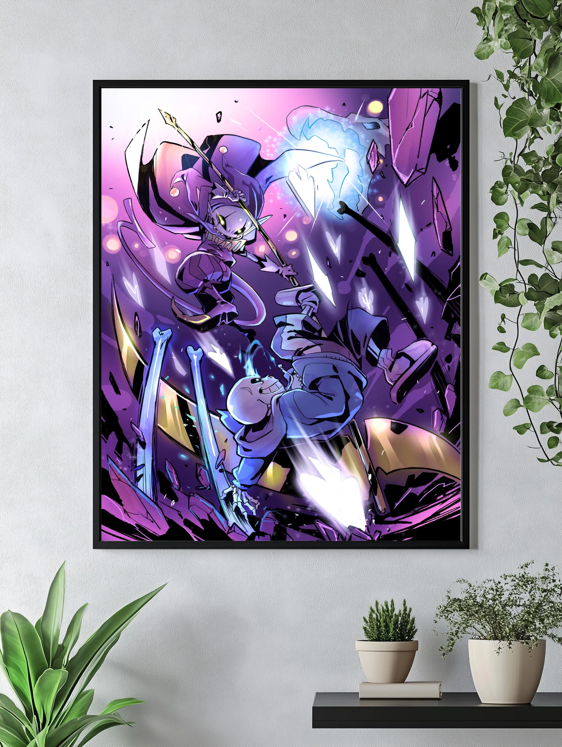 Динамичная цифровая картина показывает эпическую битву между Сансом и Джокером из игры Undertale. Использование насыщенных фиолетовых и синих оттенков наряду с контрастным светом создает захватывающее настроение напряженного момента. Отличный интерьерный арт для любой игровой комнаты или современного декора стен.