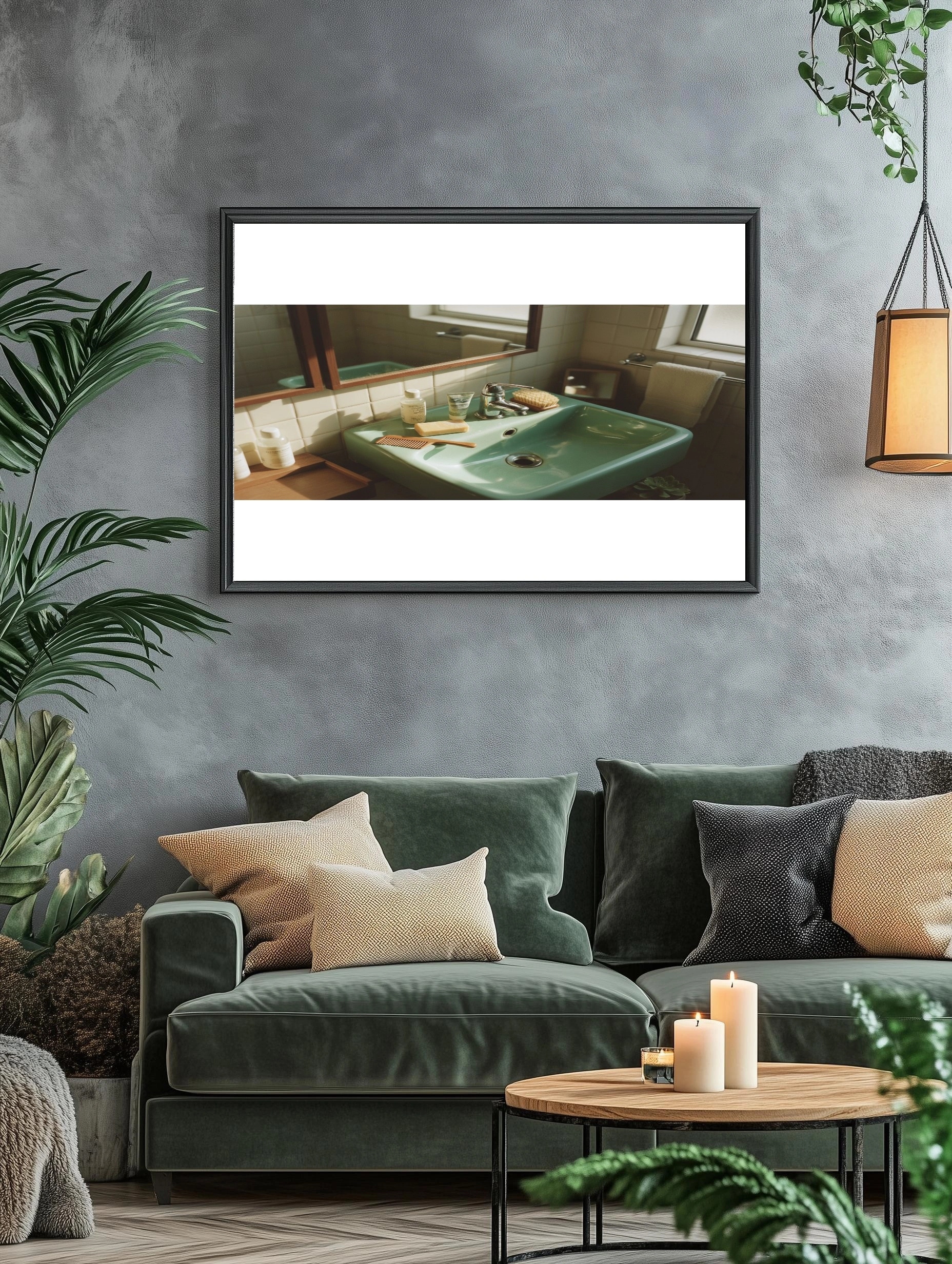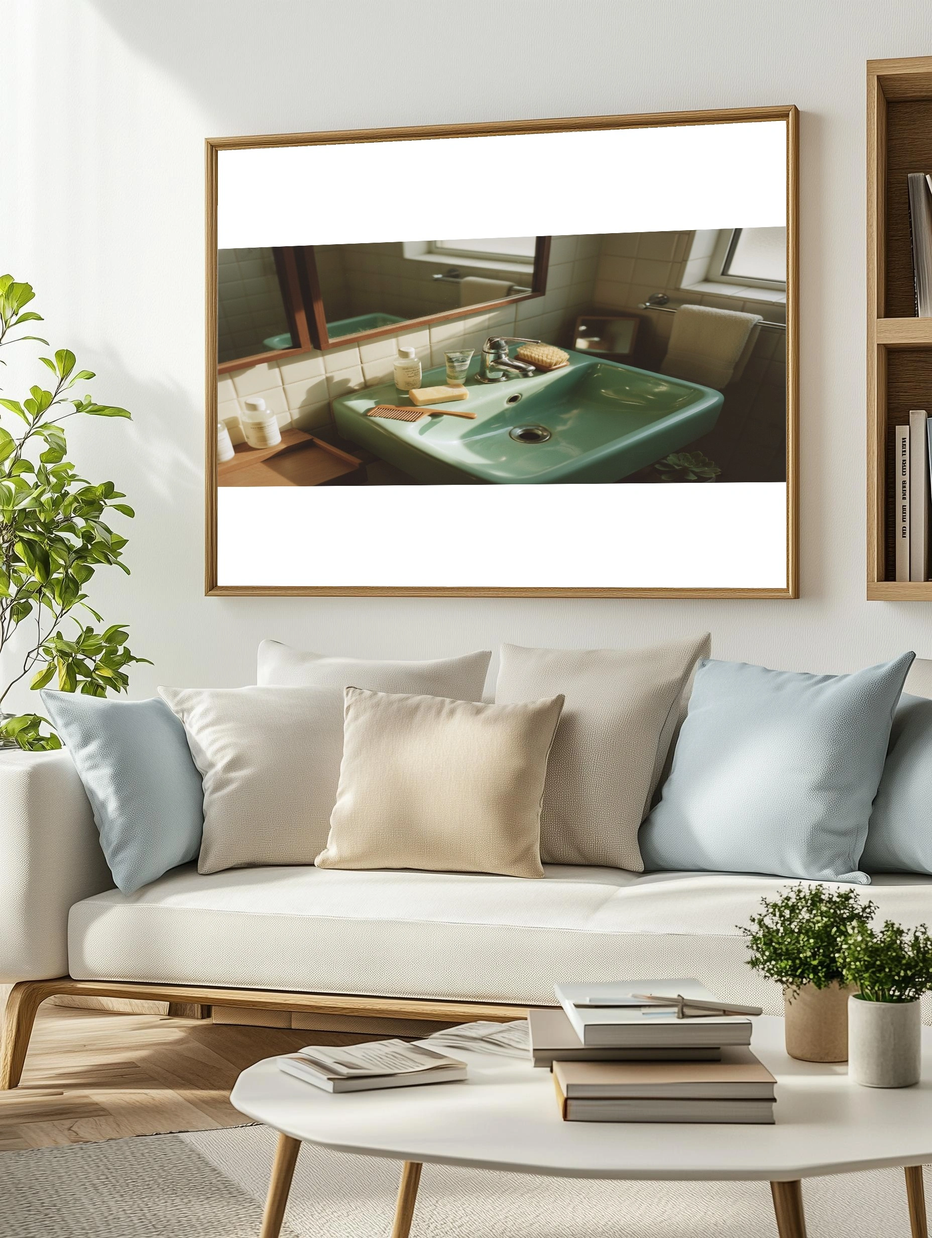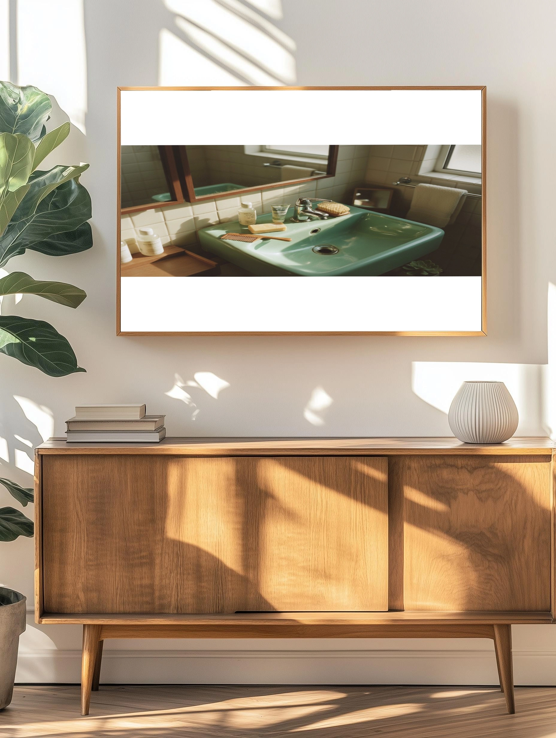 Погрузитесь в атмосферу уюта и спокойствия с этим постером, изображающим стильную ванную комнату. На переднем плане — изящная зелёная раковина, отражающая мягкий свет, который проникает через окно. На раковине аккуратно расположены косметические средства: бутылочки с шампунем и гелем для душа, а также мыло и деревянный гребень, создающие гармоничное сочетание. Внимание привлекает и маленькая щётка для тела, добавляющая нотку заботы о себе. Фон из светлых плиток и деревянных элементов создает атмосферу тепла и уюта, идеально подходящую для ванной комнаты. Этот постер станет отличным акцентом в интерьере, добавляя нотки стиля и комфорта в любое пространство.