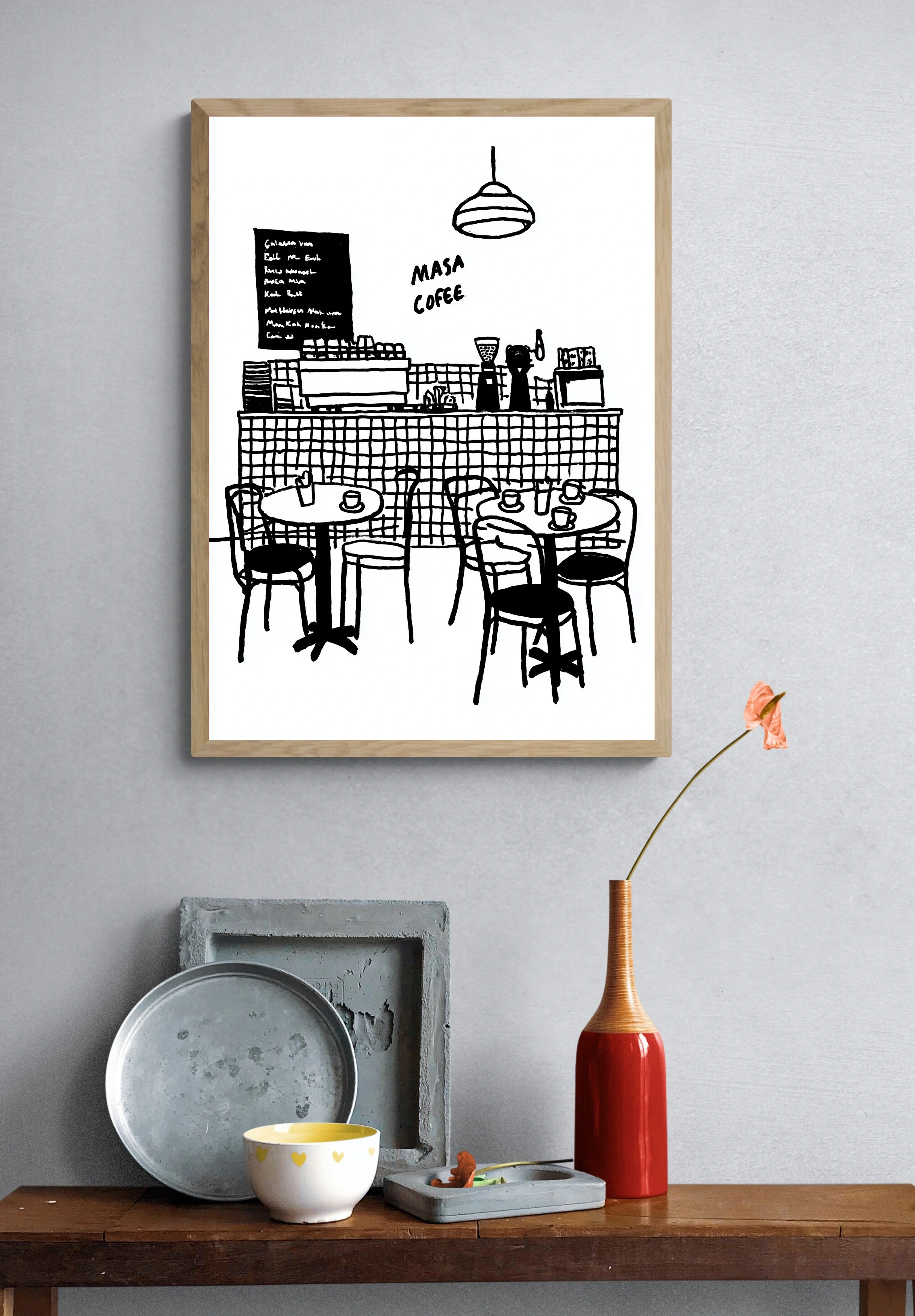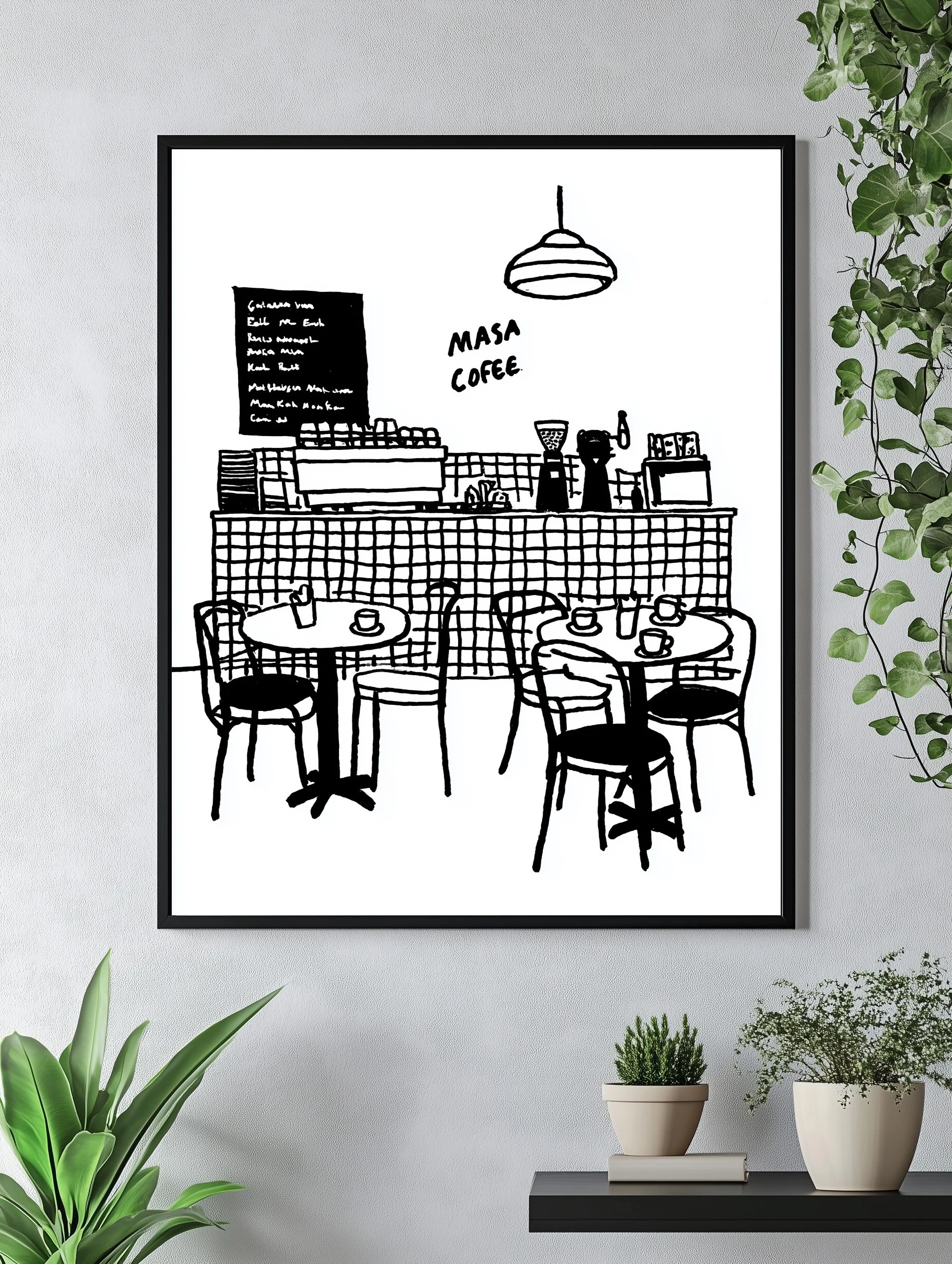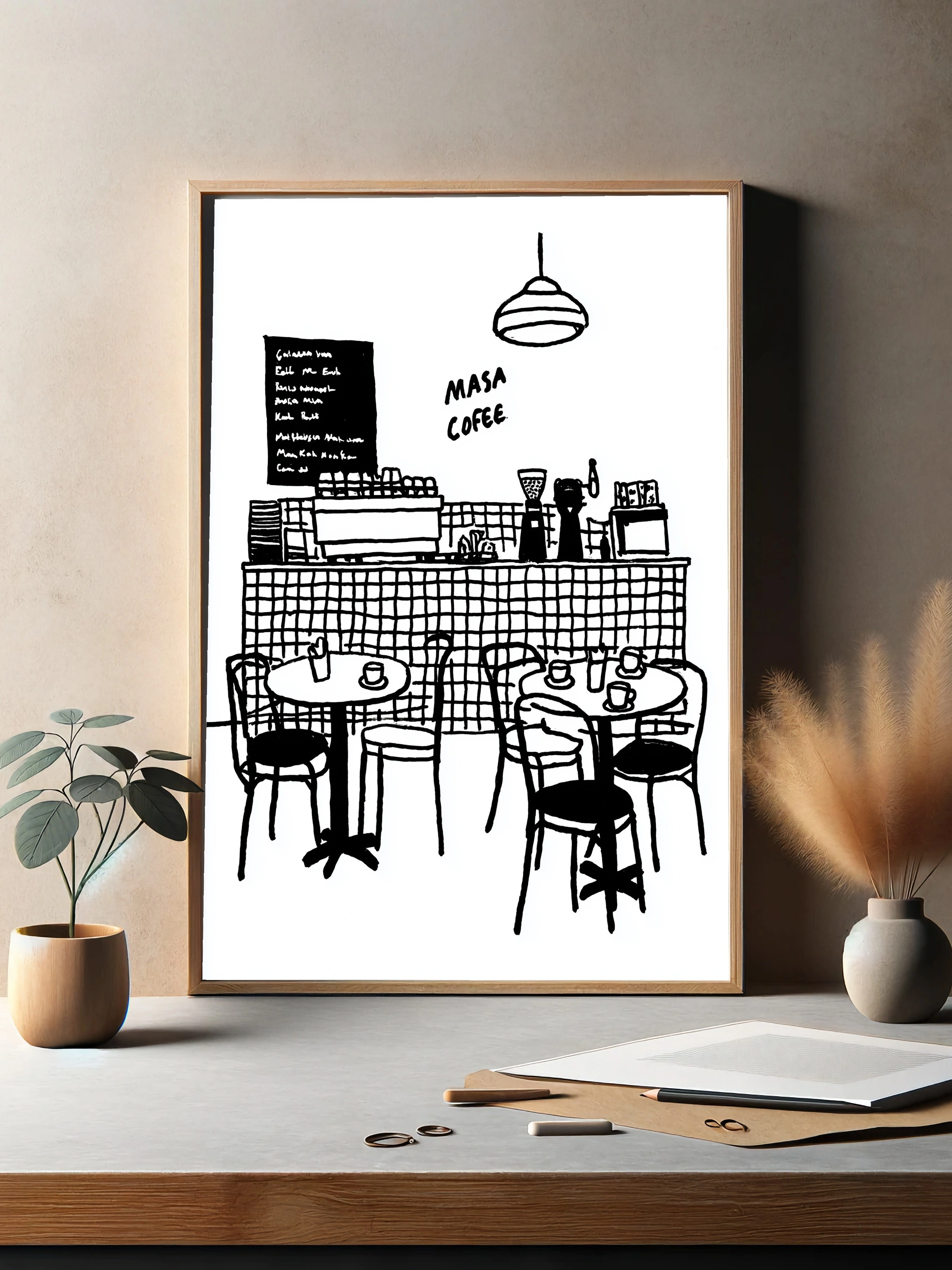 Погрузитесь в атмосферу уюта и тепла с этим стильным постером, изображающим кафе MASA COFFEE. На картине вы видите минималистичную композицию с черными линиями, создающими уютный интерьер. За барной стойкой расположены кофемашины и упаковки с кофе, а на стене написано меню, что добавляет нотку аутентичности. Столы с круглыми столешницами и стулья с изящными линиями приглашают вас насладиться чашечкой ароматного кофе. Постер выполнен в черно-белых тонах, что подчеркивает его современный стиль и делает его универсальным для любого интерьера. Идеально подойдет для оформления кухни, гостиной или кафе, добавляя стиль и атмосферу. Целевая аудитория — молодежь и креативщики, ценящие уют и эстетику.