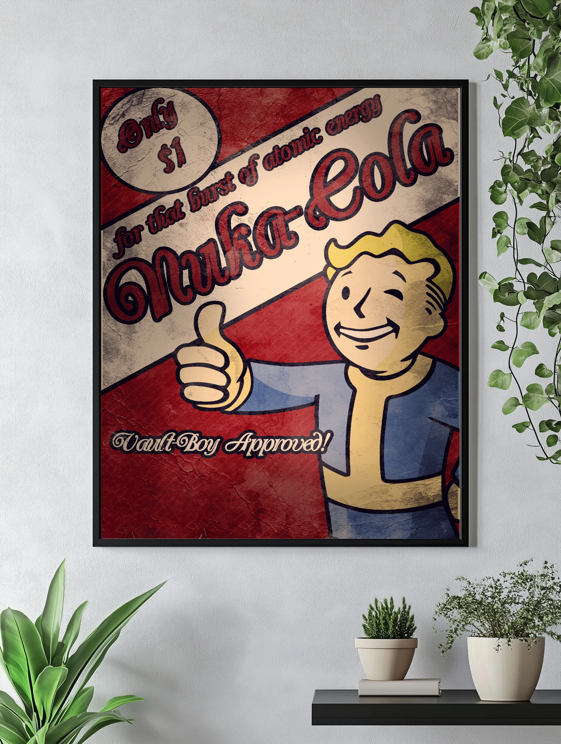 Декоративный плакат в винтажном стиле с изображением знаменитого персонажа Vault Boy из игры Fallout. Надпись «Nuka-Cola» и слоган выделены красным цветом на фоне с преобладанием красного и кремового. Этот интерьерный плакат подарит атмосферу ретро и постапокалиптического мира для гостиной или офиса.