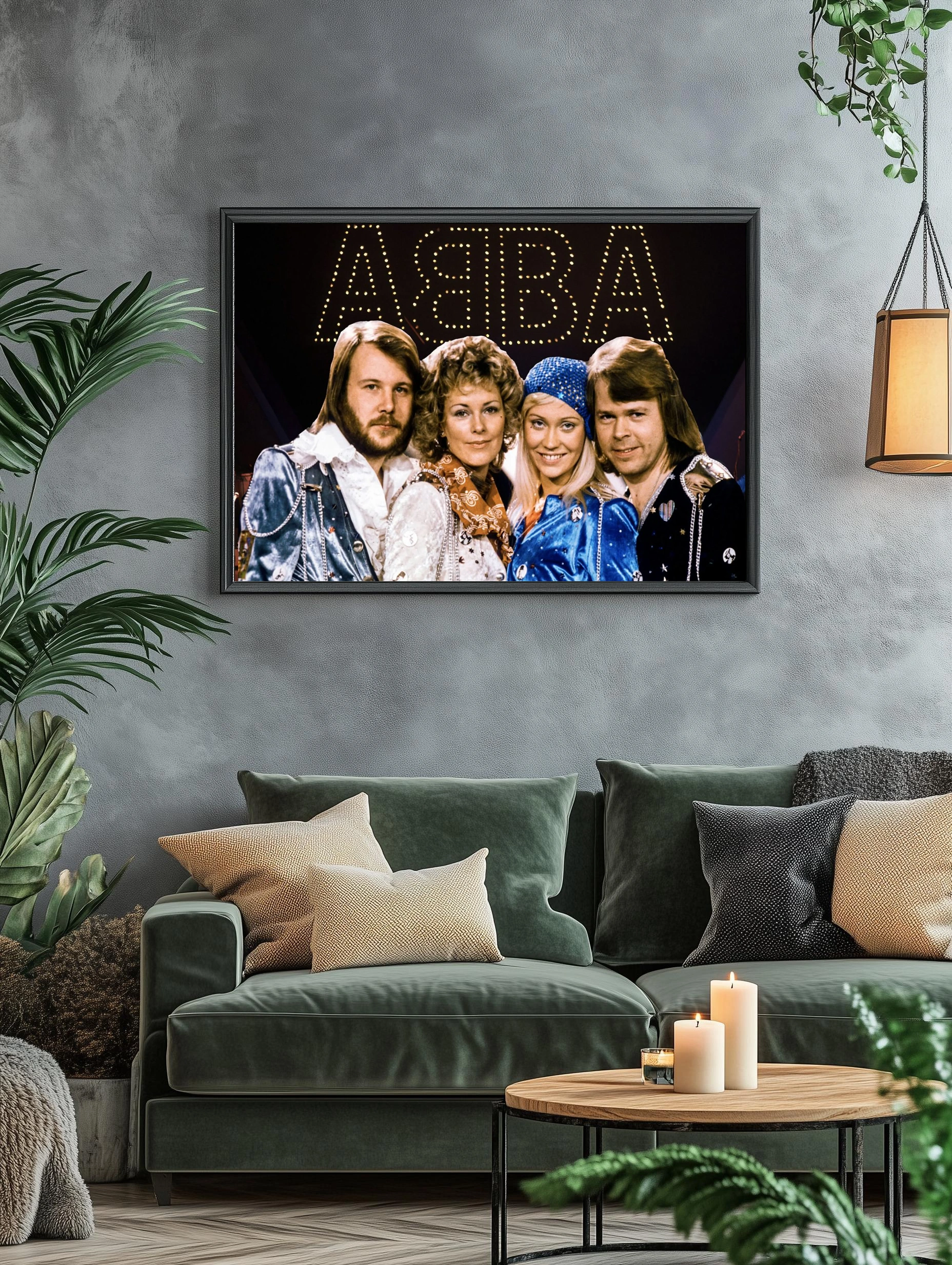 На изображении изображена знаменитая шведская поп-группа ABBA — участники в ярких костюмах 70-х годов на фоне подсвеченных букв с названием группы. Картина для гостиной или офиса, интерьерный декор с уникальным фотопостером, отражающим музыкальную историю и стильное искусство для стен.