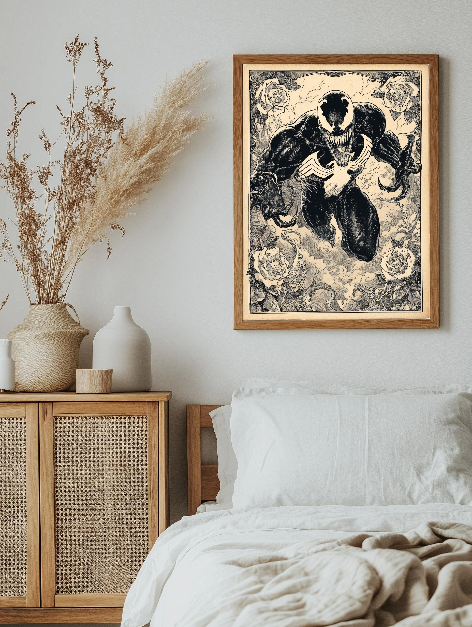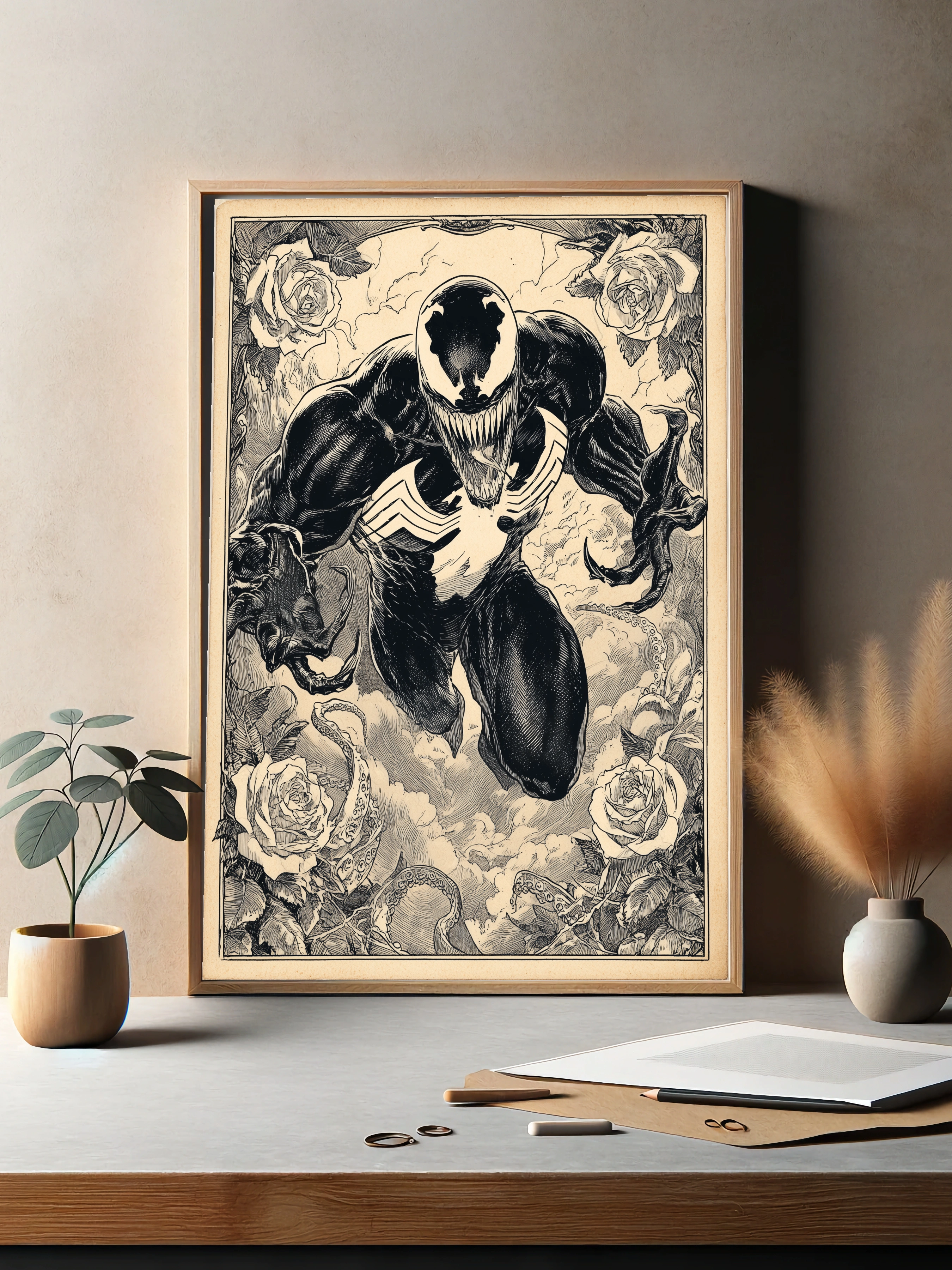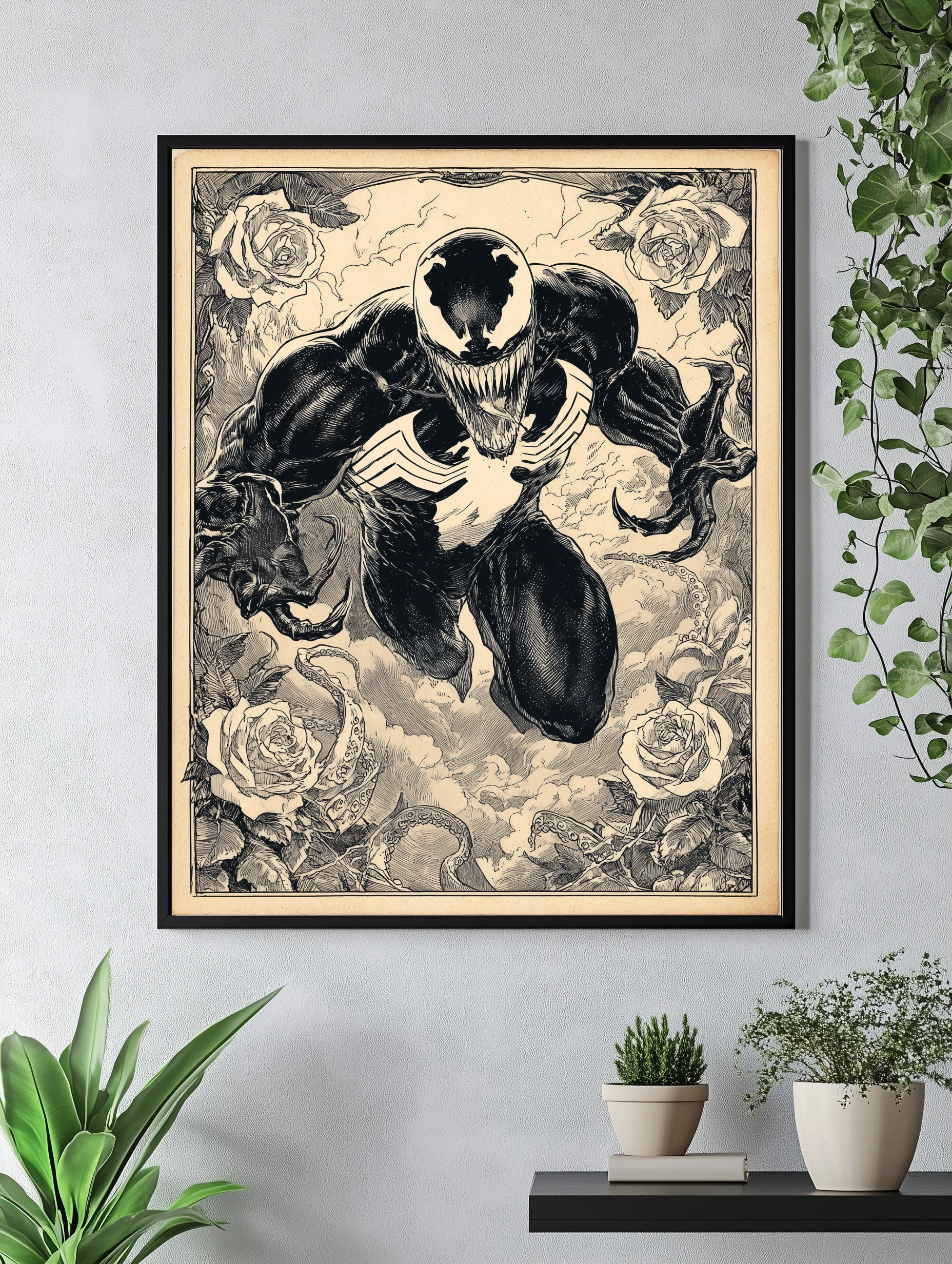 На изображении представлен известный персонаж Веном из комиксов Marvel в динамичной позе. Чёрно-белая графика выполнена с детальной прорисовкой, окружённая розами и щупальцами, создавая уникальный художественный плакат. Этот интерьерный арт подойдёт для декора гостиной или офиса, придавая стенам современный стиль.