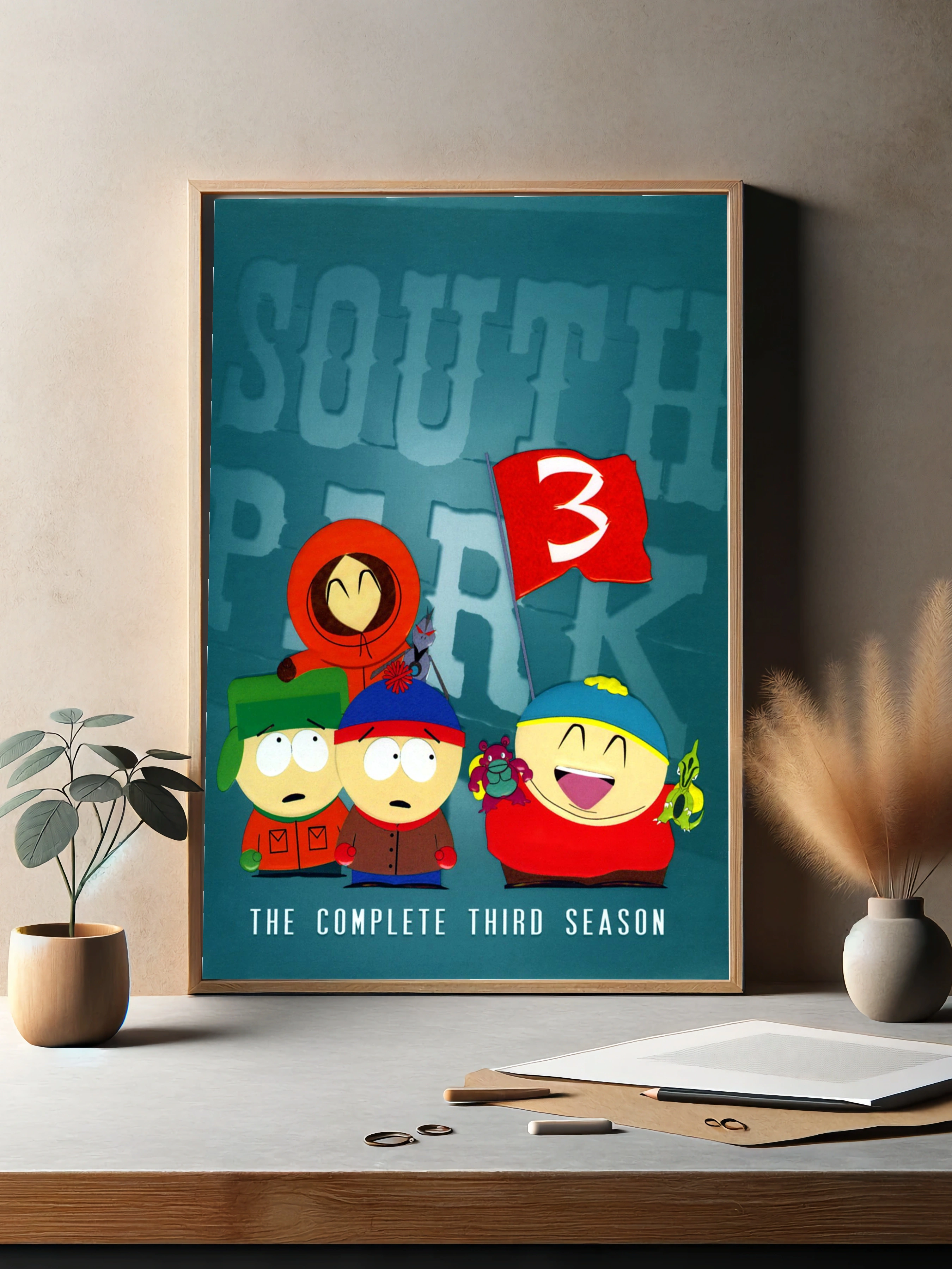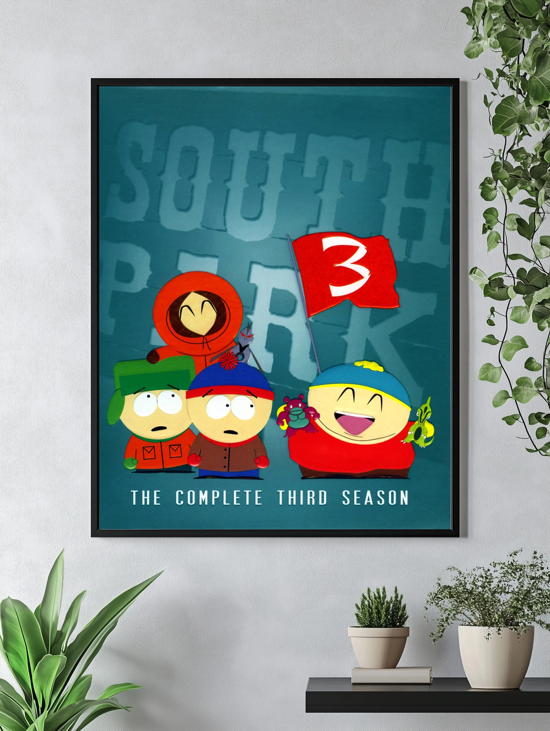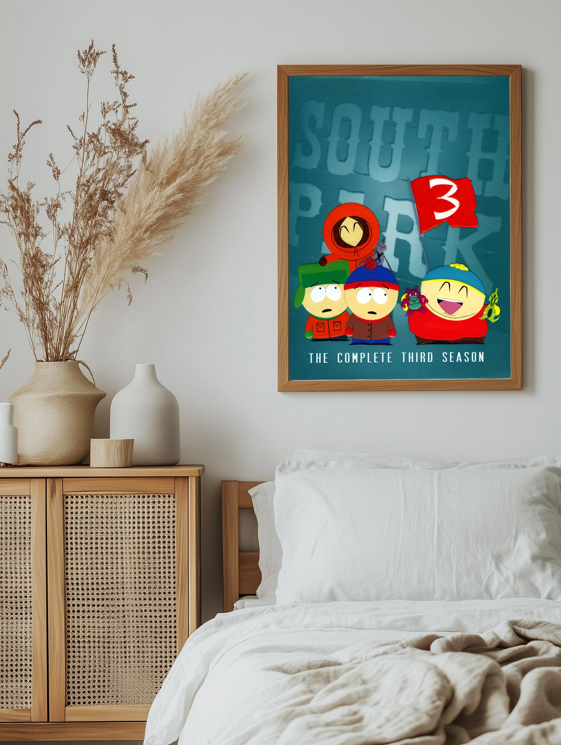 Яркое изображение персонажей из знаменитого мультсериала Южный Парк — Кайла, Кенни, Стан и Эрика. На фоне надпись South Park, а Эрик держит красный флаг с цифрой 3, обозначающей третий сезон. Стиль изображения типичен для оригинальной анимации сериала, который подарит интерьеру игровую атмосферу и юмор.
