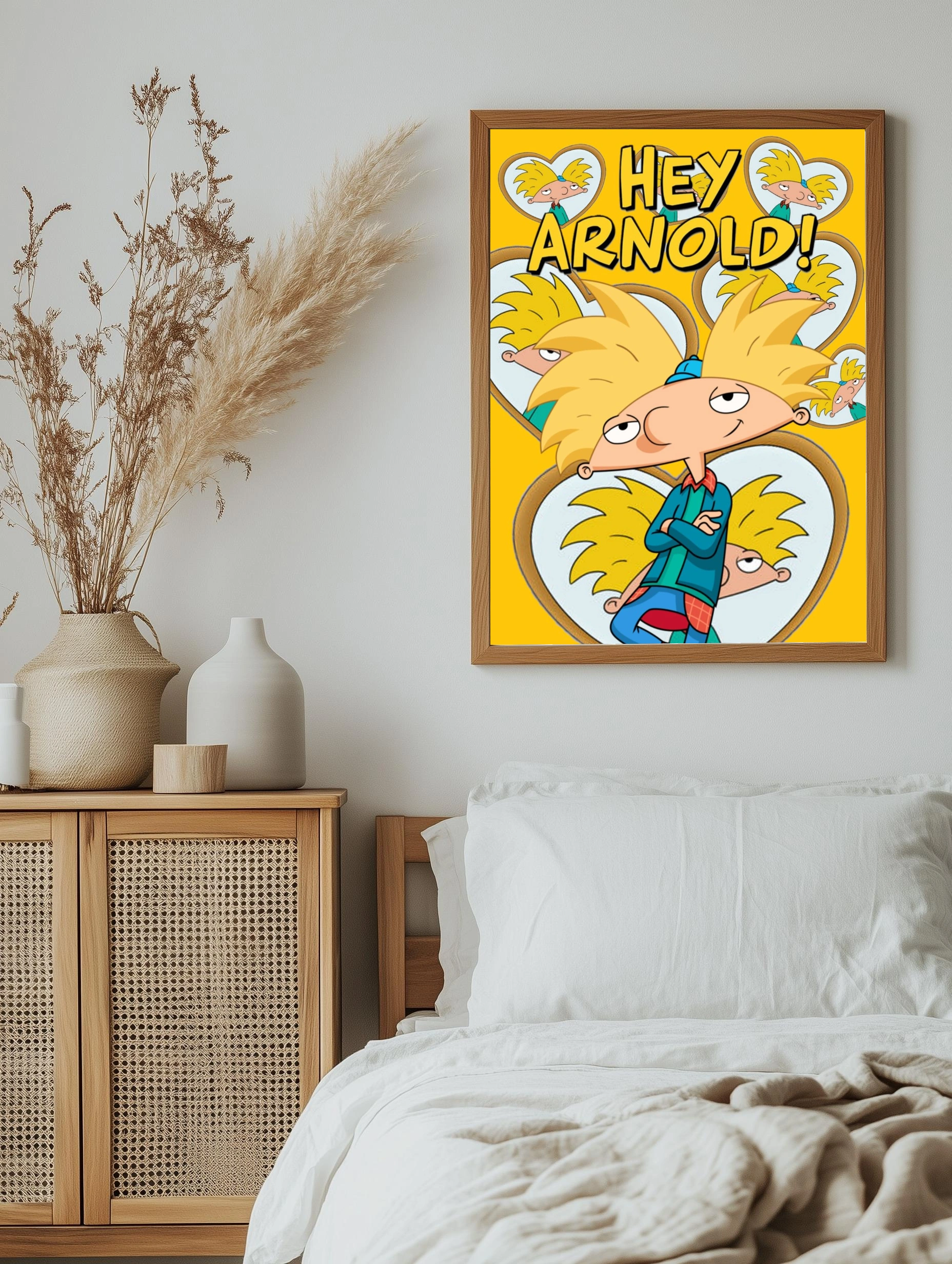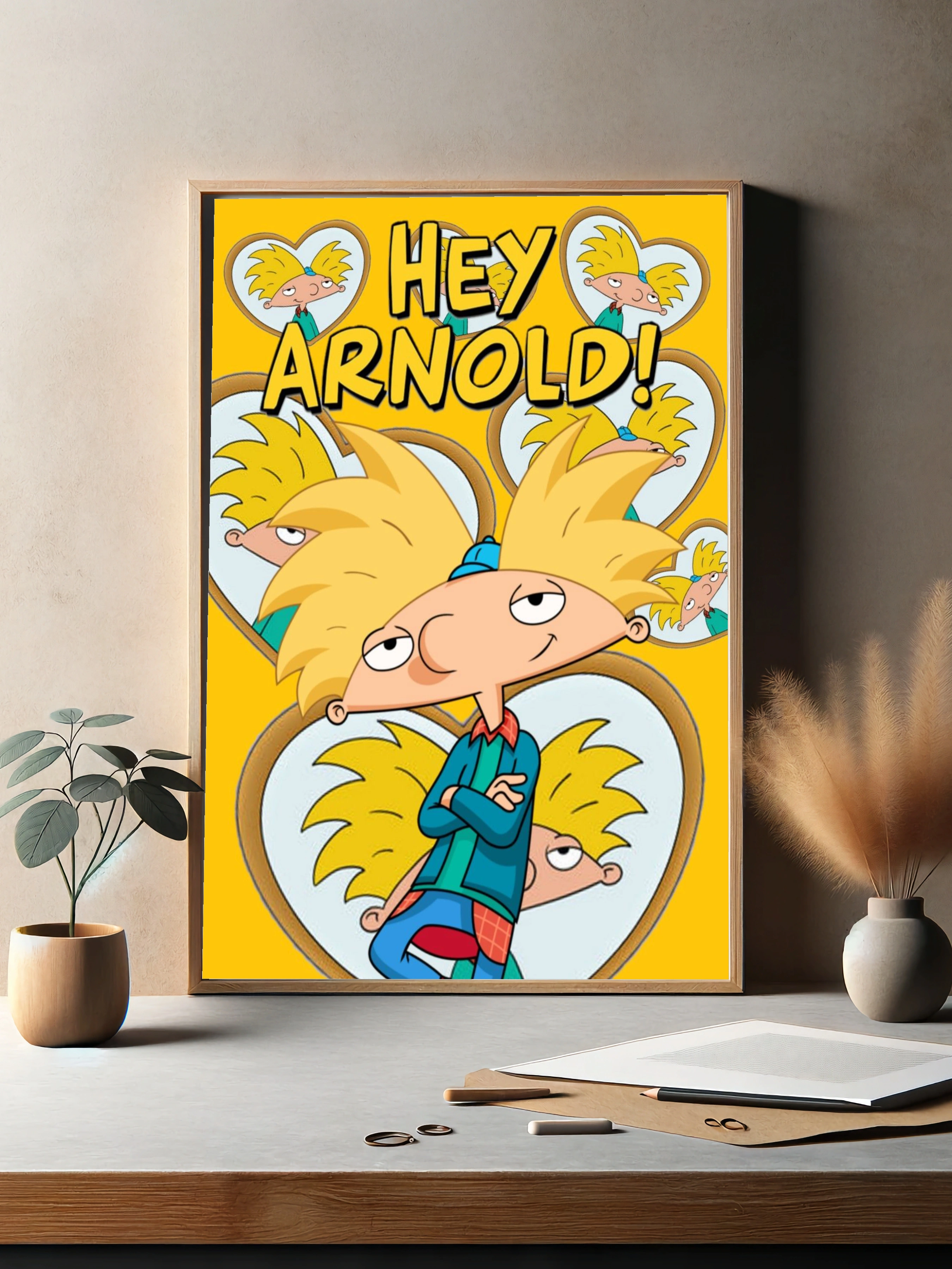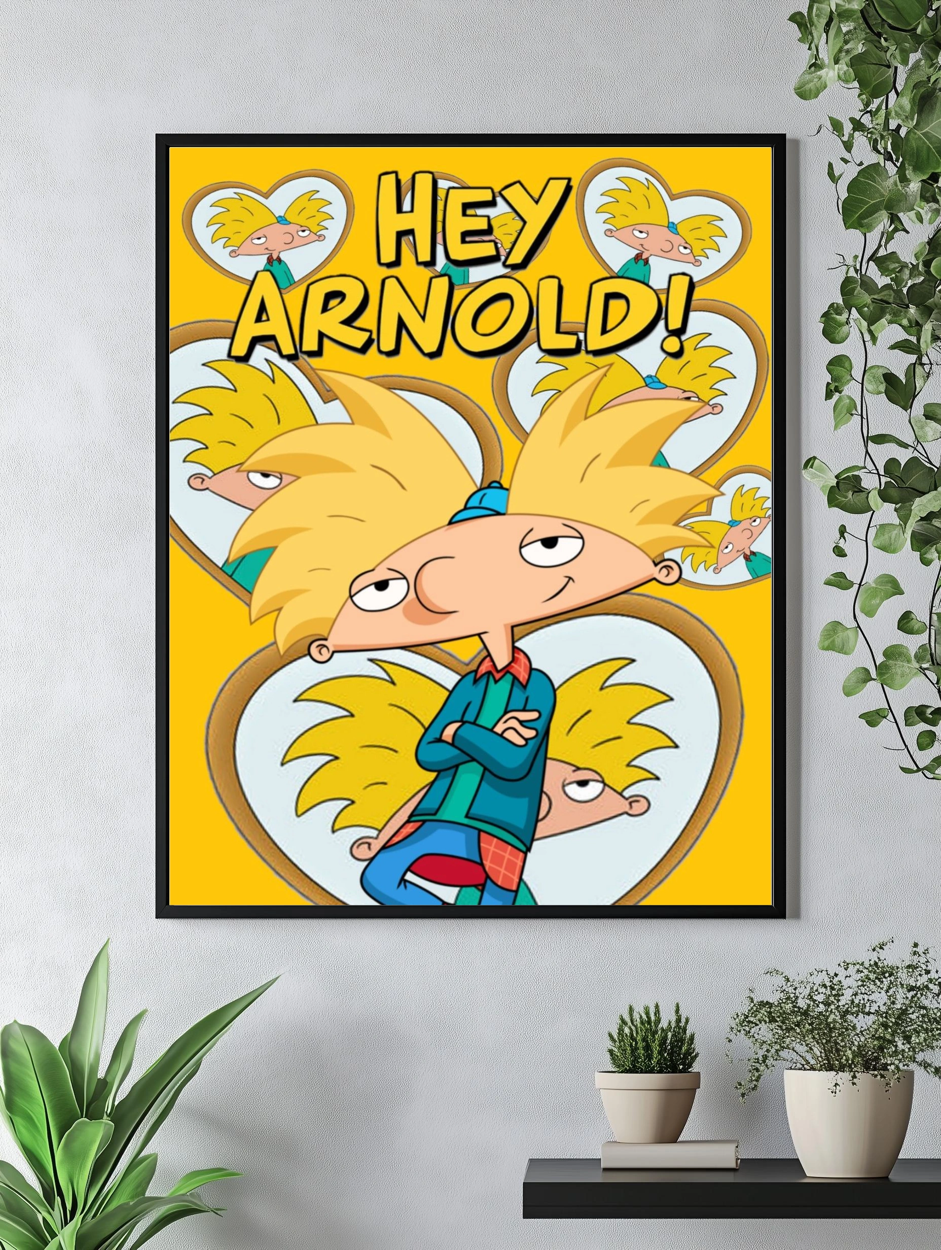 Яркий и стильный интерьерный арт с героем мультсериала Hey Arnold! — Арнольдом. Главный персонаж изображён на фоне жёлтых сердец, преобладают жёлтый и синий цвета. Весёлое настроение, узнаваемый мультипликационный стиль. Отлично подойдёт для декора гостиной, детской или офиса, создавая уникальный и позитивный акцент в интерьере.