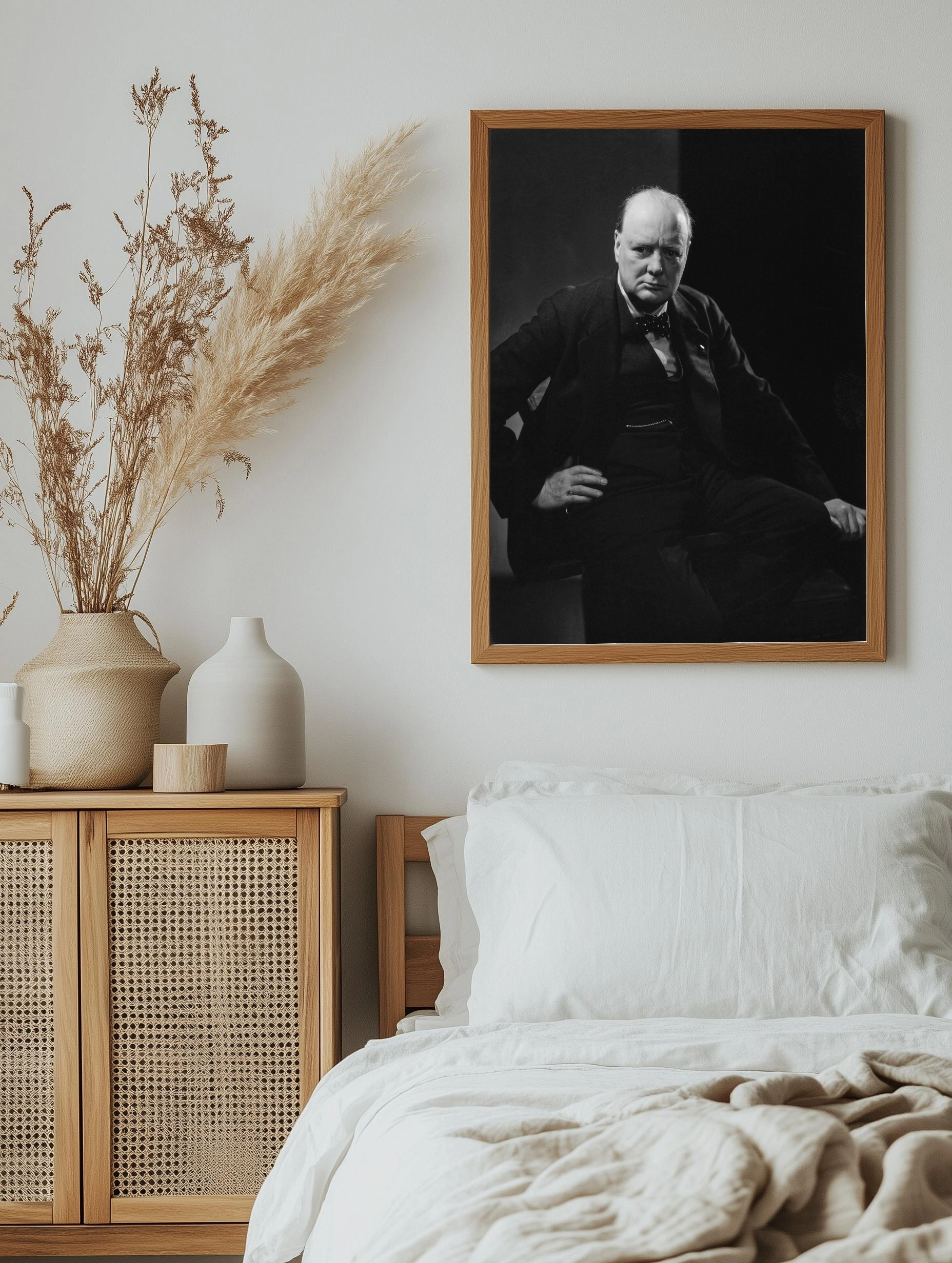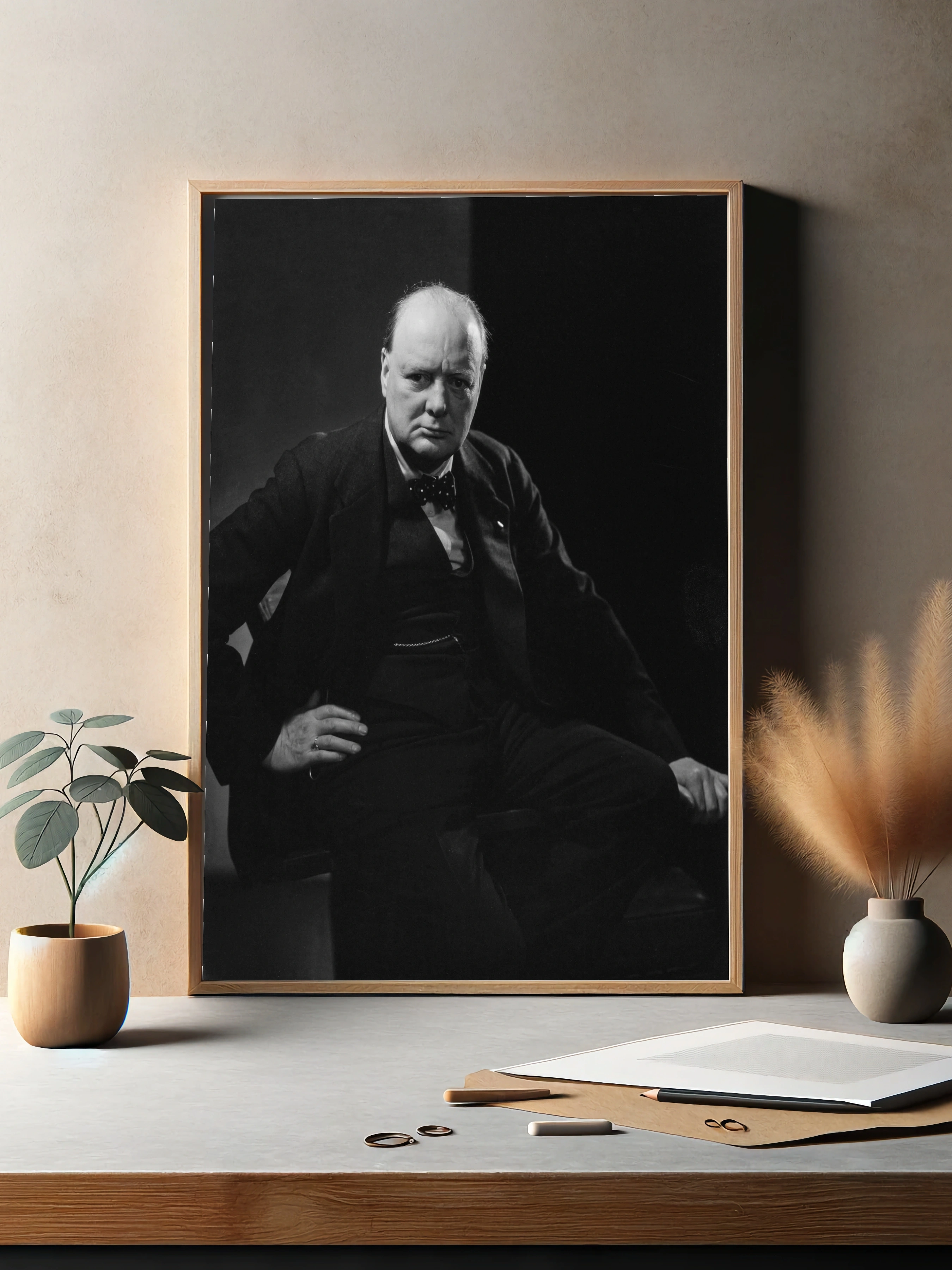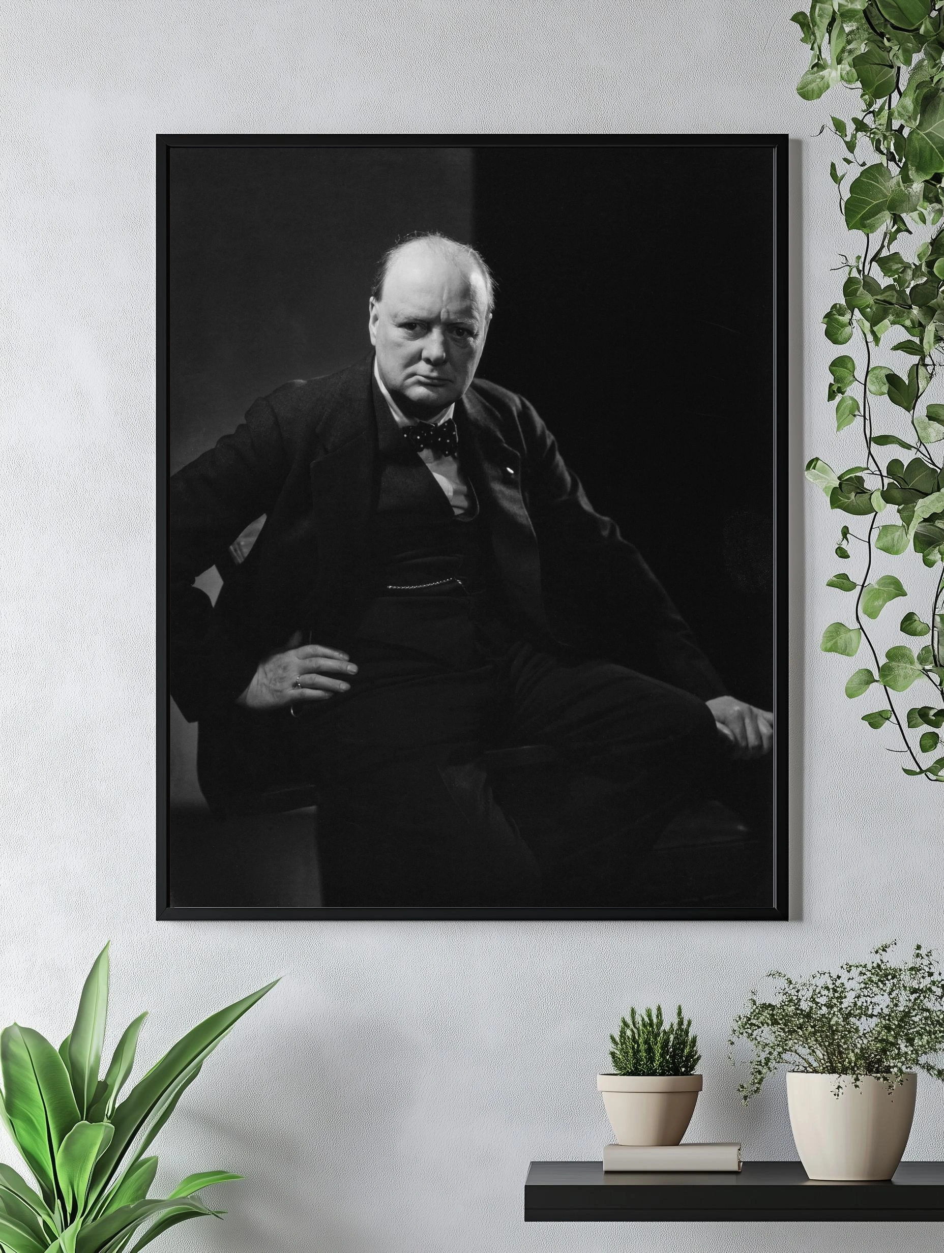Чёрно-белый интерьерный постер с изображением Винстона Черчилля — одного из самых известных государственников XX века. Фотопортрет передает серьёзность и решительность, подчёркивая историческую значимость личности. Идеальный выбор для стильного декора стен в офис или гостиную, ценящих историческое и современное искусство.