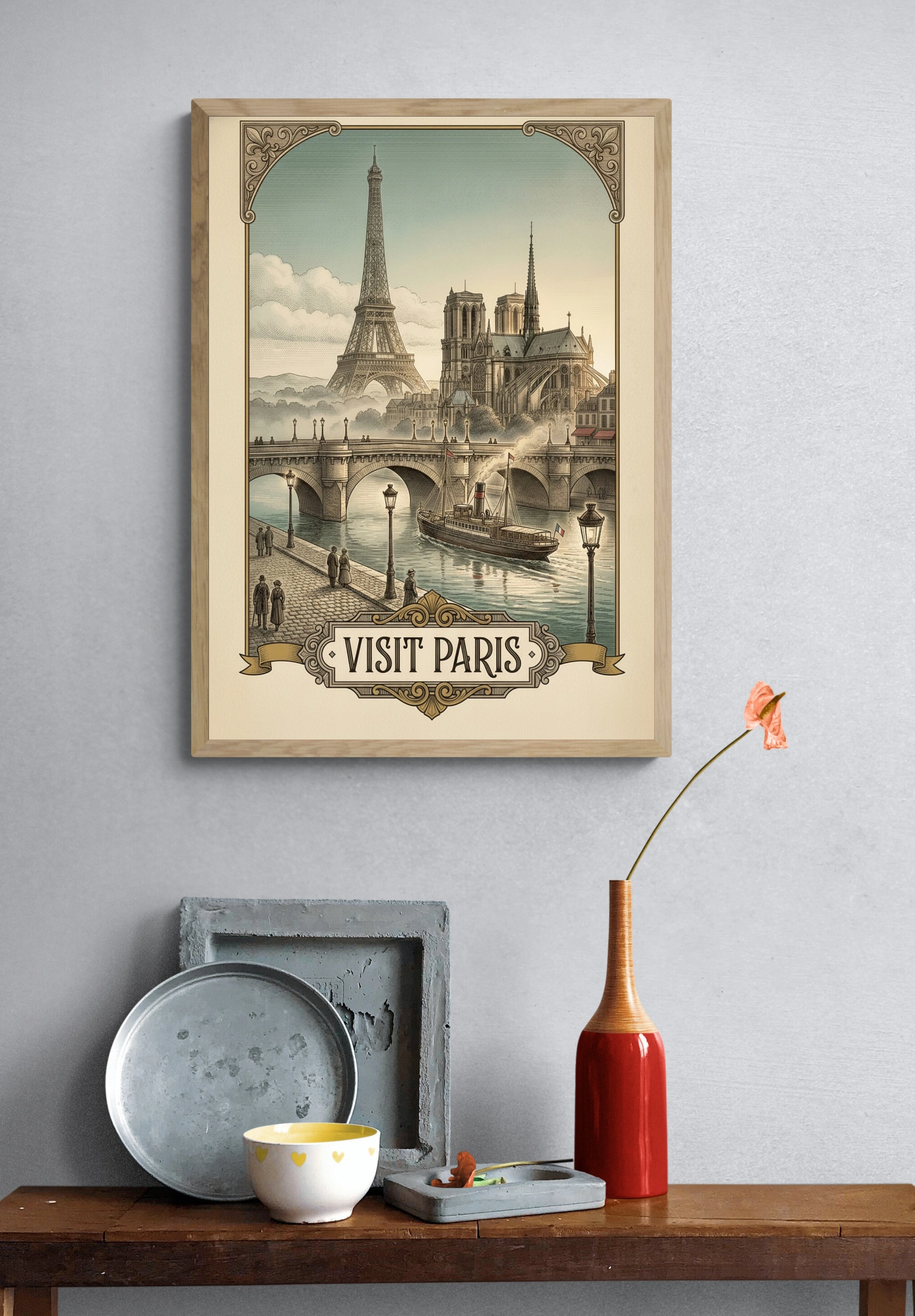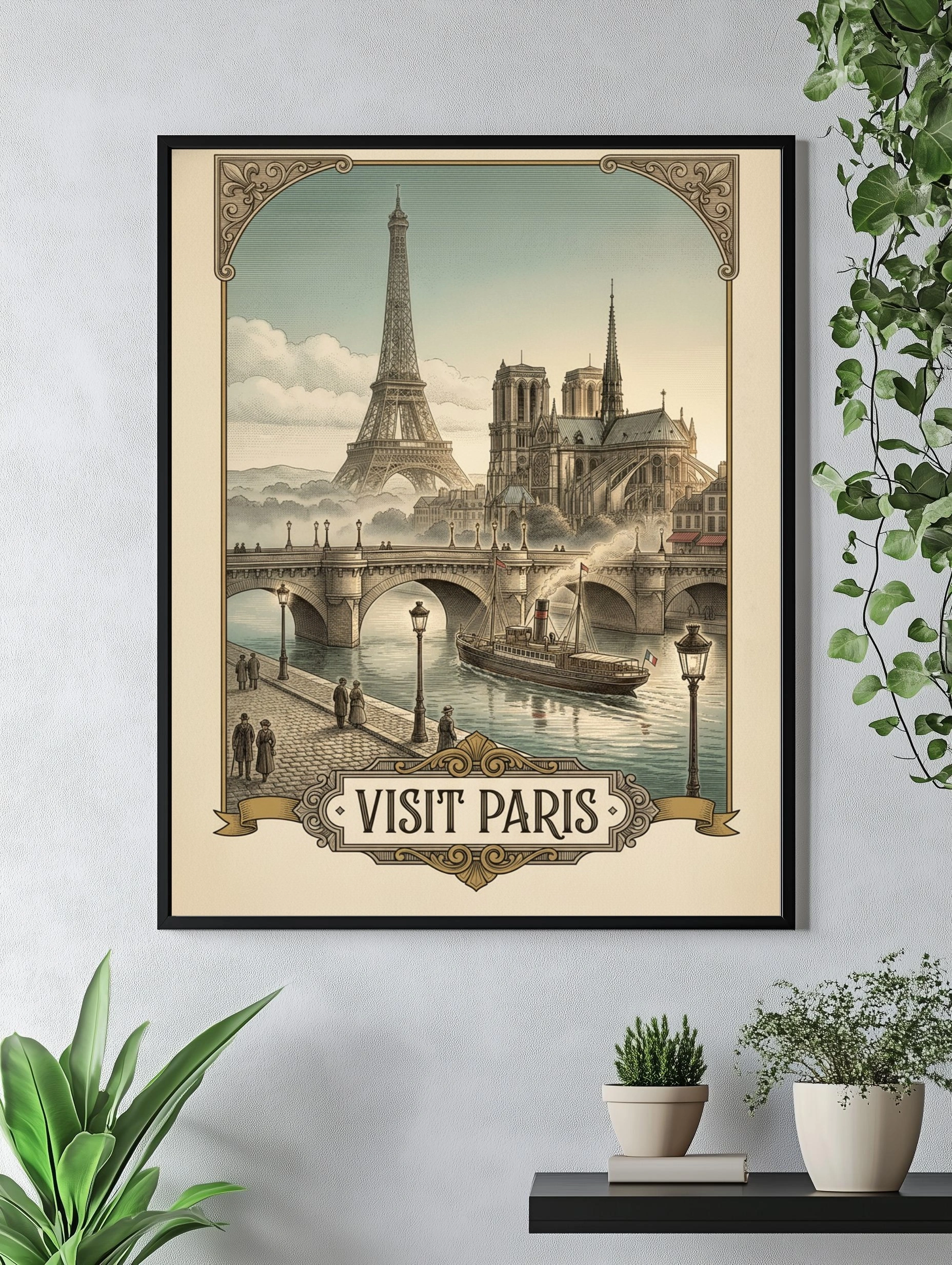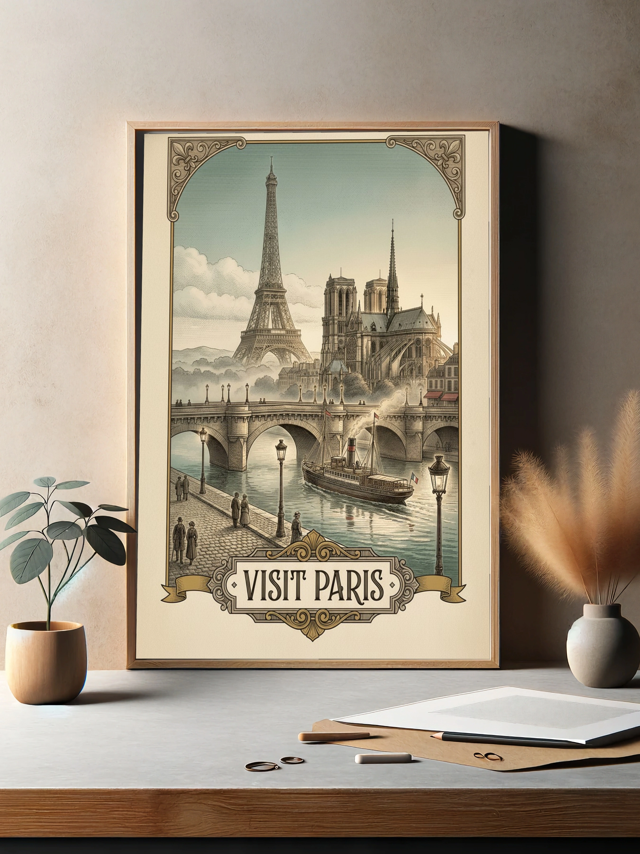 Погрузитесь в атмосферу романтического Парижа с этим великолепным постером, на котором изображены знаковые достопримечательности города. Эйфелева башня величественно возвышается на фоне облачного неба, а рядом — величественный Нотр-Дам, олицетворяющий архитектурное великолепие. На переднем плане реки Сены парит пароход, добавляя динамики в спокойную сцену. Уютные фонари вдоль набережной создают теплую атмосферу, а прохожие в винтажной одежде придают картине исторический шарм. Этот постер станет идеальным акцентом в вашем интерьере, напоминая о романтике и красоте Парижа.
