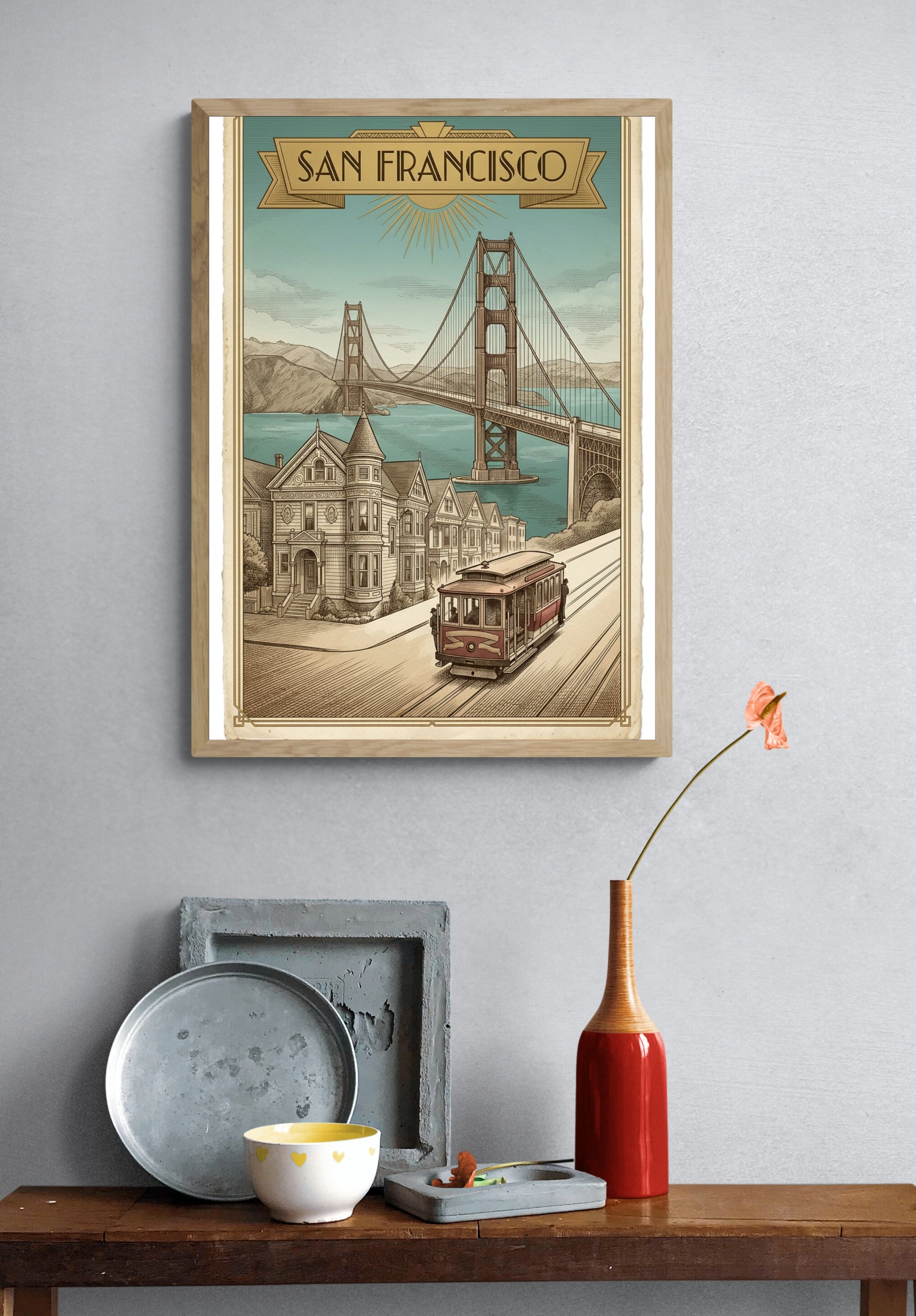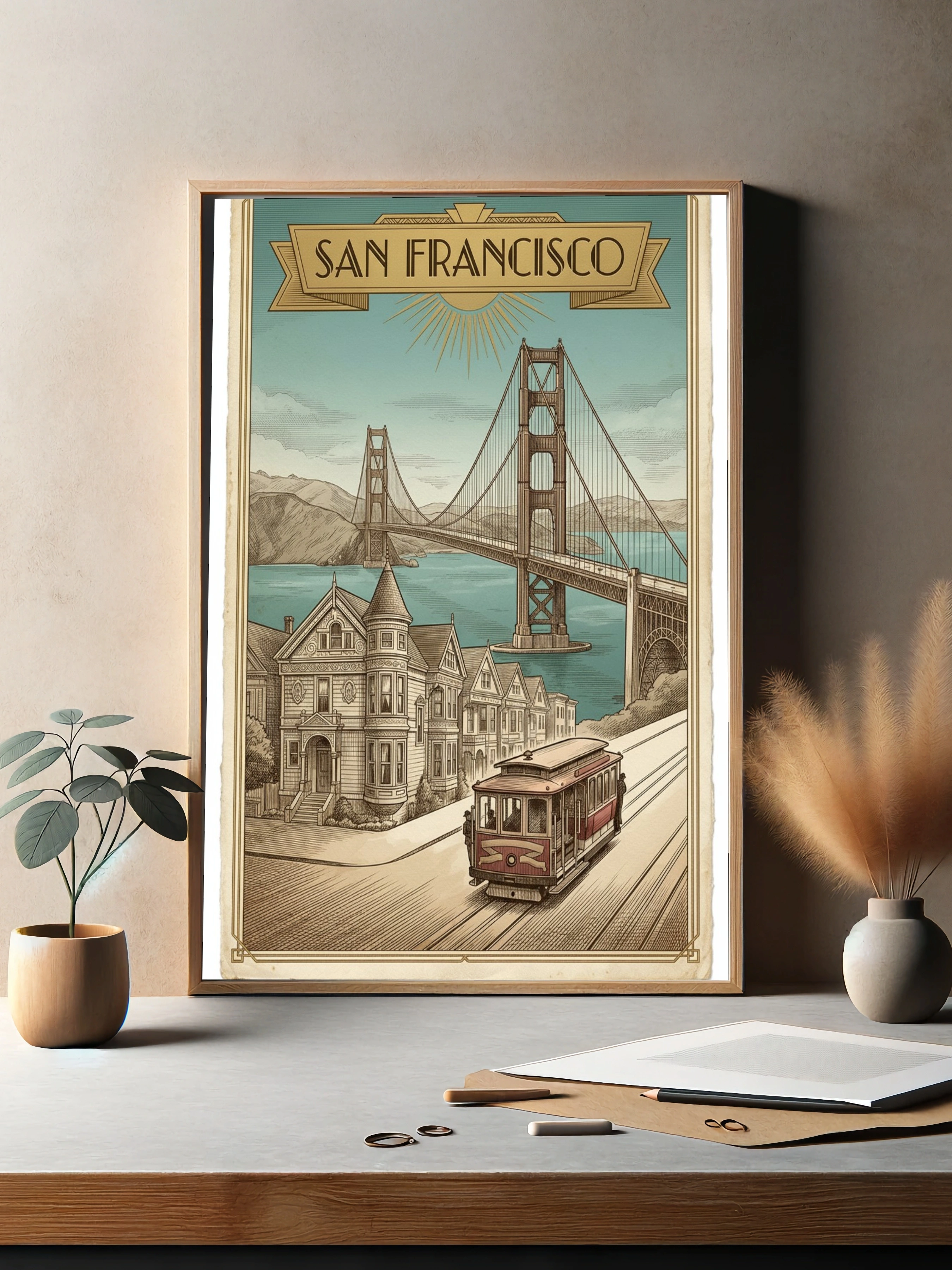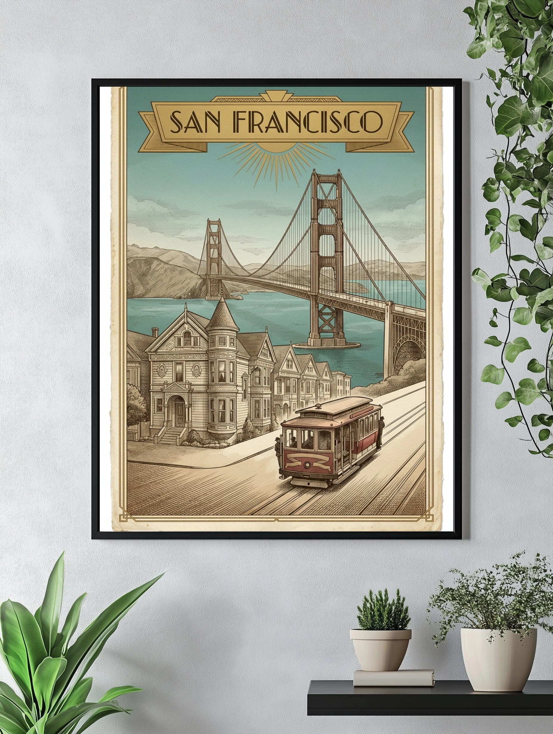 Погрузитесь в атмосферу Сан-Франциско с этим великолепным винтажным постером, на котором изображен знаменитый мост Золотые Ворота. В центре композиции — красный трамвай, который плавно движется по извивающейся улице, окруженной историческими домами в стиле викторианской архитектуры. На заднем плане величественные горы и спокойные воды залива создают гармоничное сочетание. Нежно-голубое небо с легкими облаками добавляет легкости и свежести. Этот постер станет идеальным акцентом для вашего интерьера, будь то гостиная, спальня или офис, привнося в пространство дух калифорнийского шарма. Подходит для молодежи, семей и всех, кто ценит уникальный стиль.