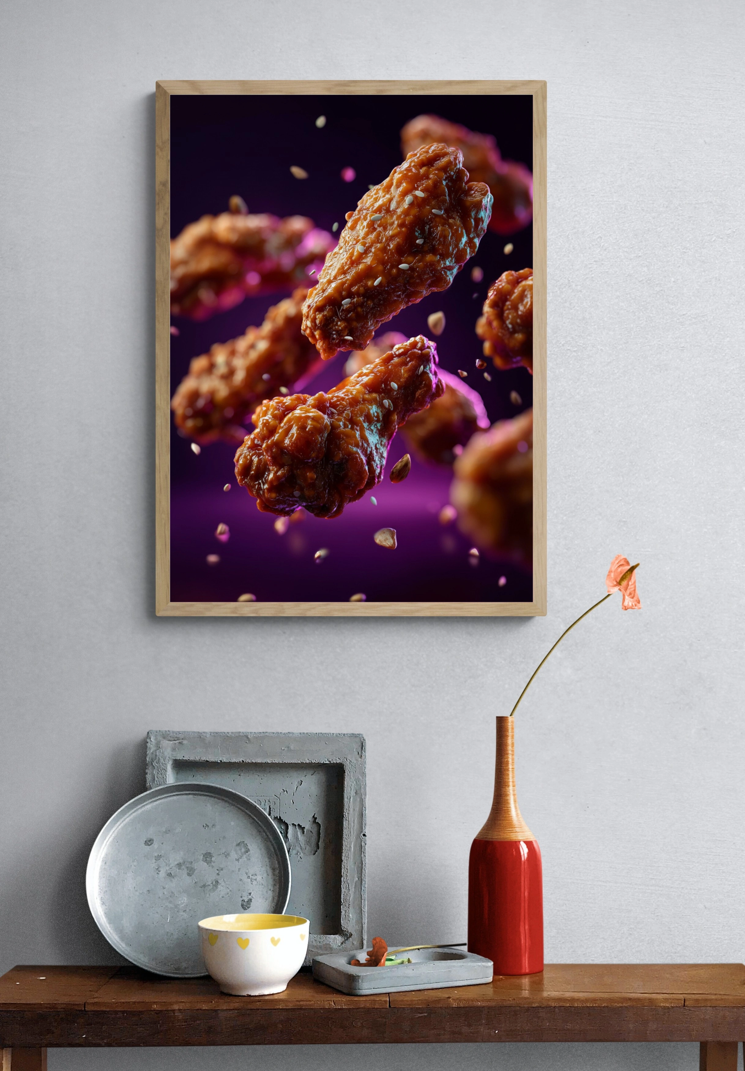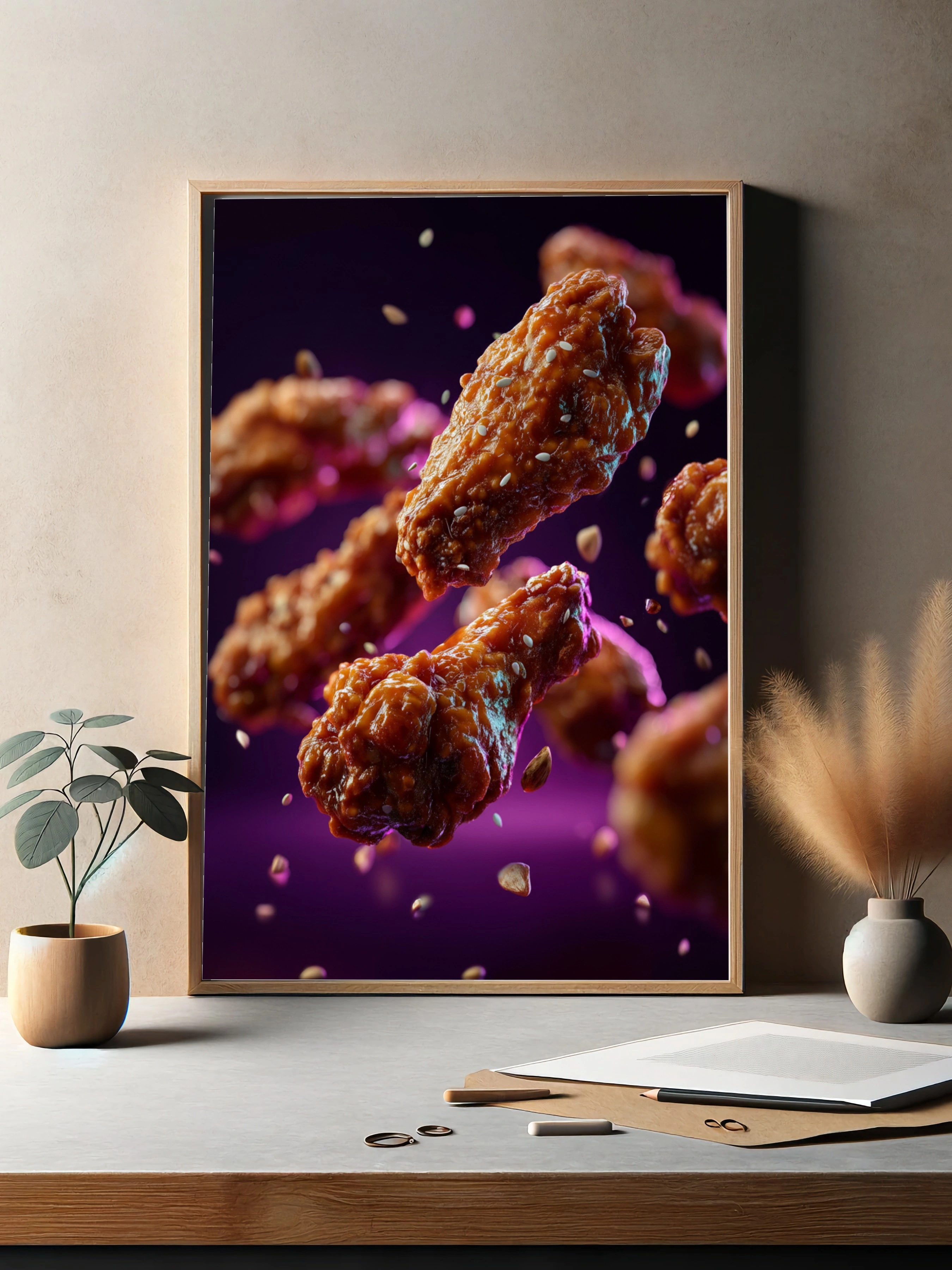 Погрузитесь в мир аппетитных удовольствий с этим ярким постером, на котором изображены сочные куриные крылышки, покрытые глазурью. Каждое крылышко выглядит так, будто только что было вынуто из фритюра, с хрустящей корочкой и блестящей поверхностью. Они парят в воздухе на фоне глубокого фиолетового цвета, создавая ощущение легкости и динамики. Мелкие семена кунжута добавляют текстурные акценты, а капли соуса словно играют в воздухе, подчеркивая свежесть и вкус. Этот постер станет отличным украшением для кухни, столовой или кафе, привлекая внимание гурманов и любителей вкусной еды. Идеален для молодежной аудитории и всех, кто ценит кулинарные шедевры.
