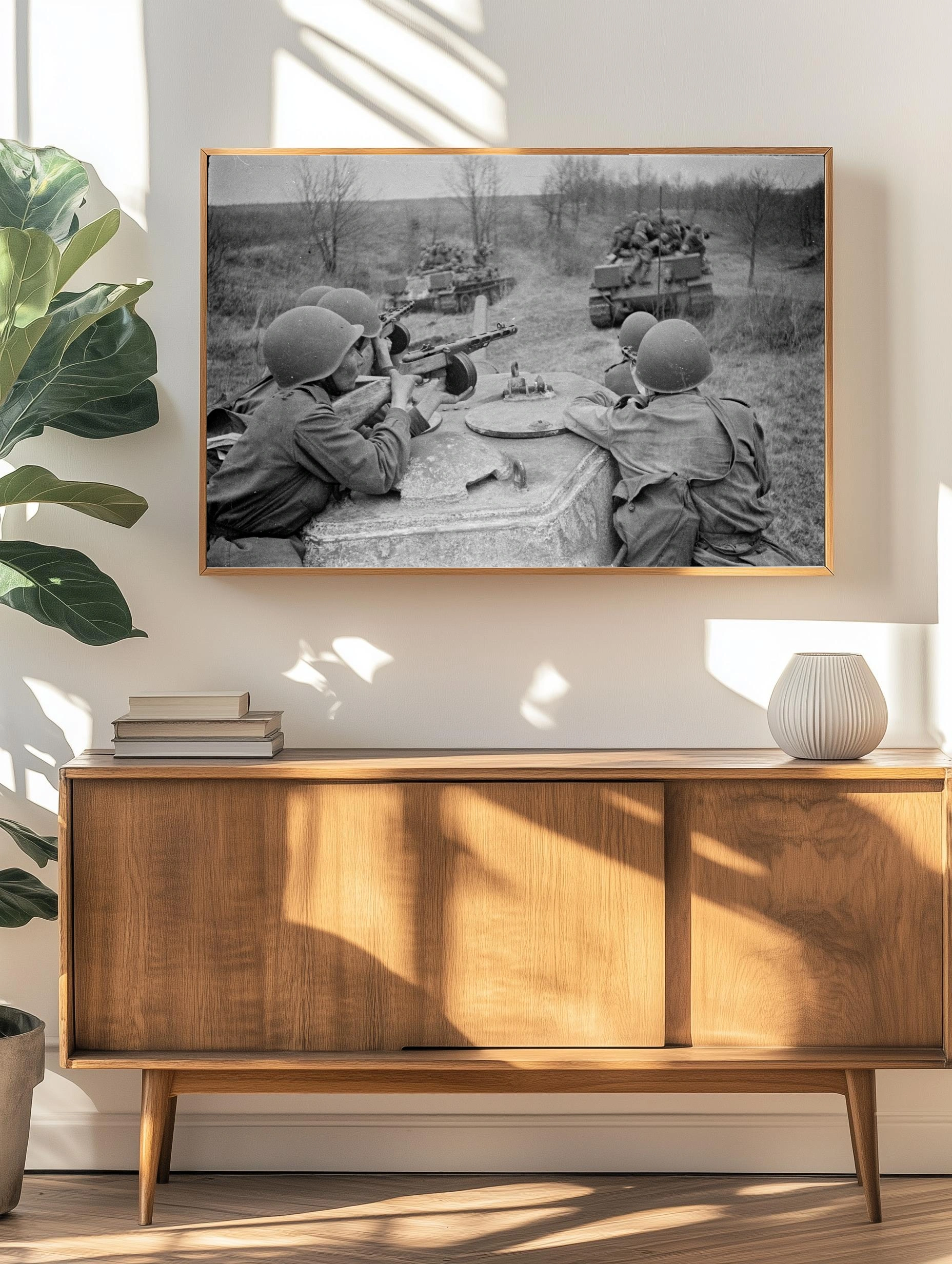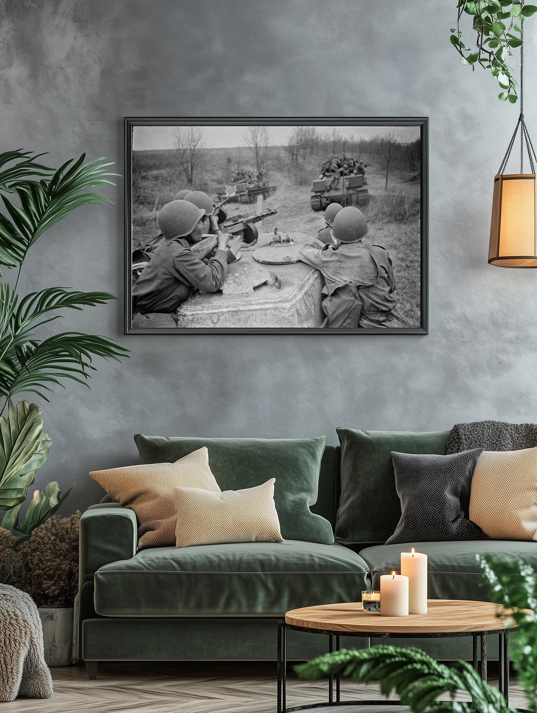 Черно-белая фотография показывает группу солдат в касках, находящихся на бронетехнике, вооружённых пулемётами. В кадре видны другие танки и размытый природный пейзаж с деревьями без листвы, создающий атмосферу напряжённого военного действия. Это художественный плакат с интерьерным искусством, идеально подходящий для любителей истории и военной тематики.