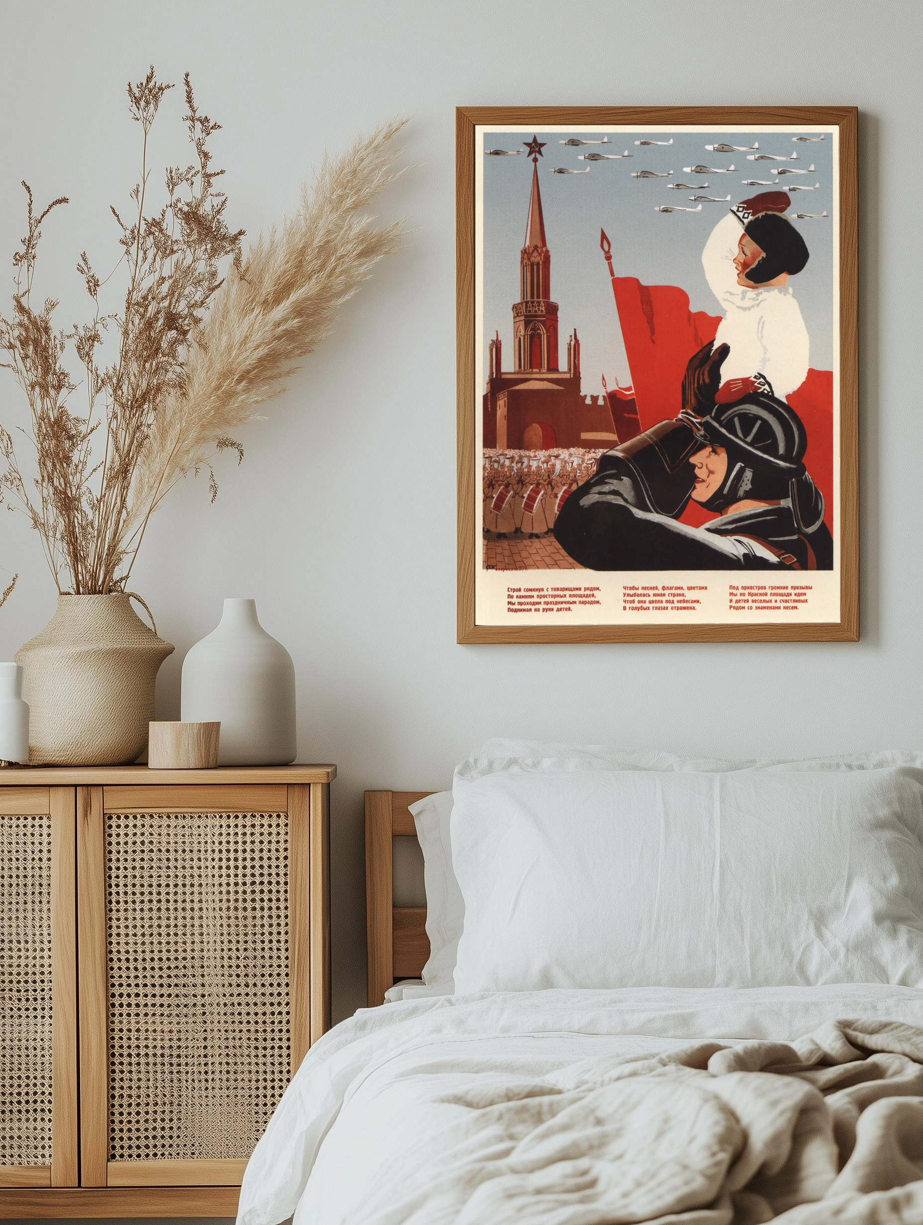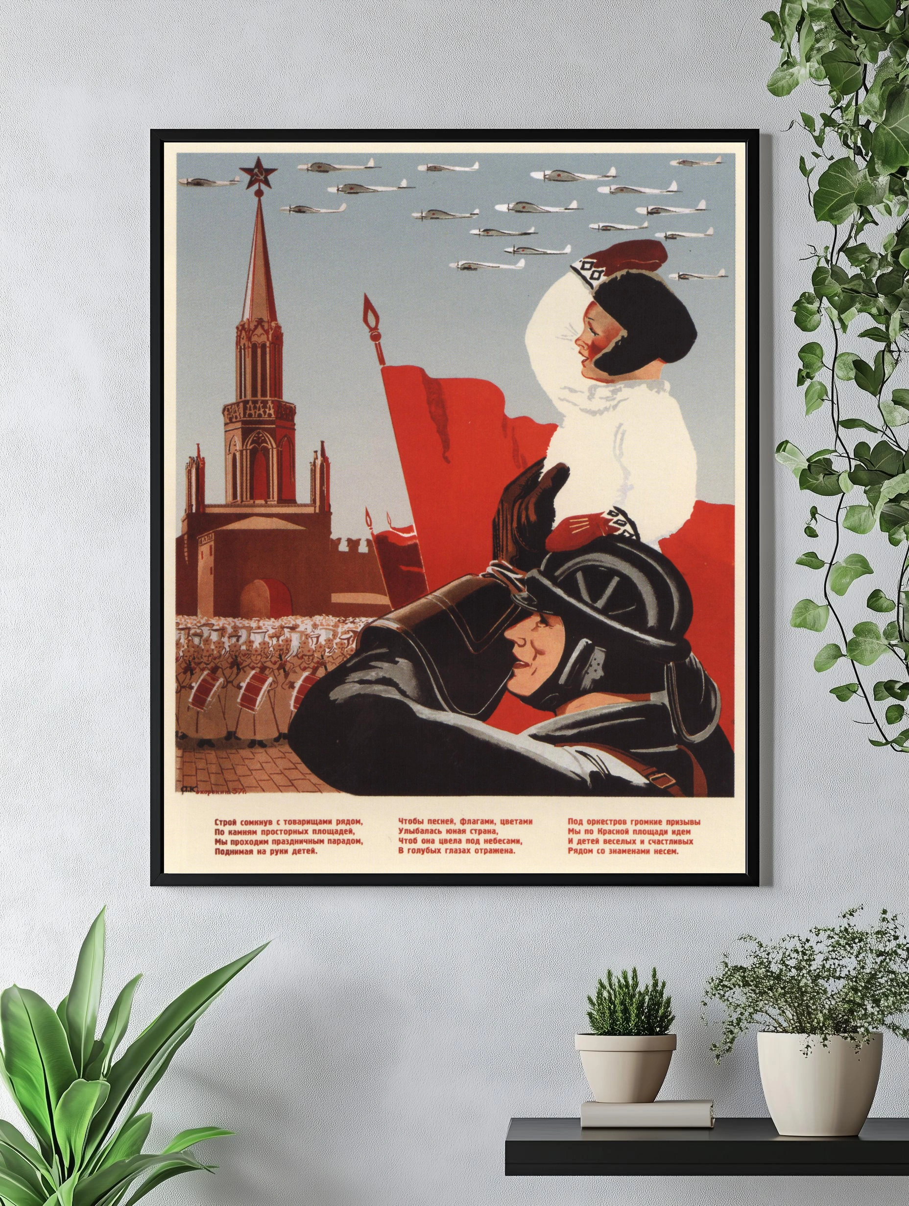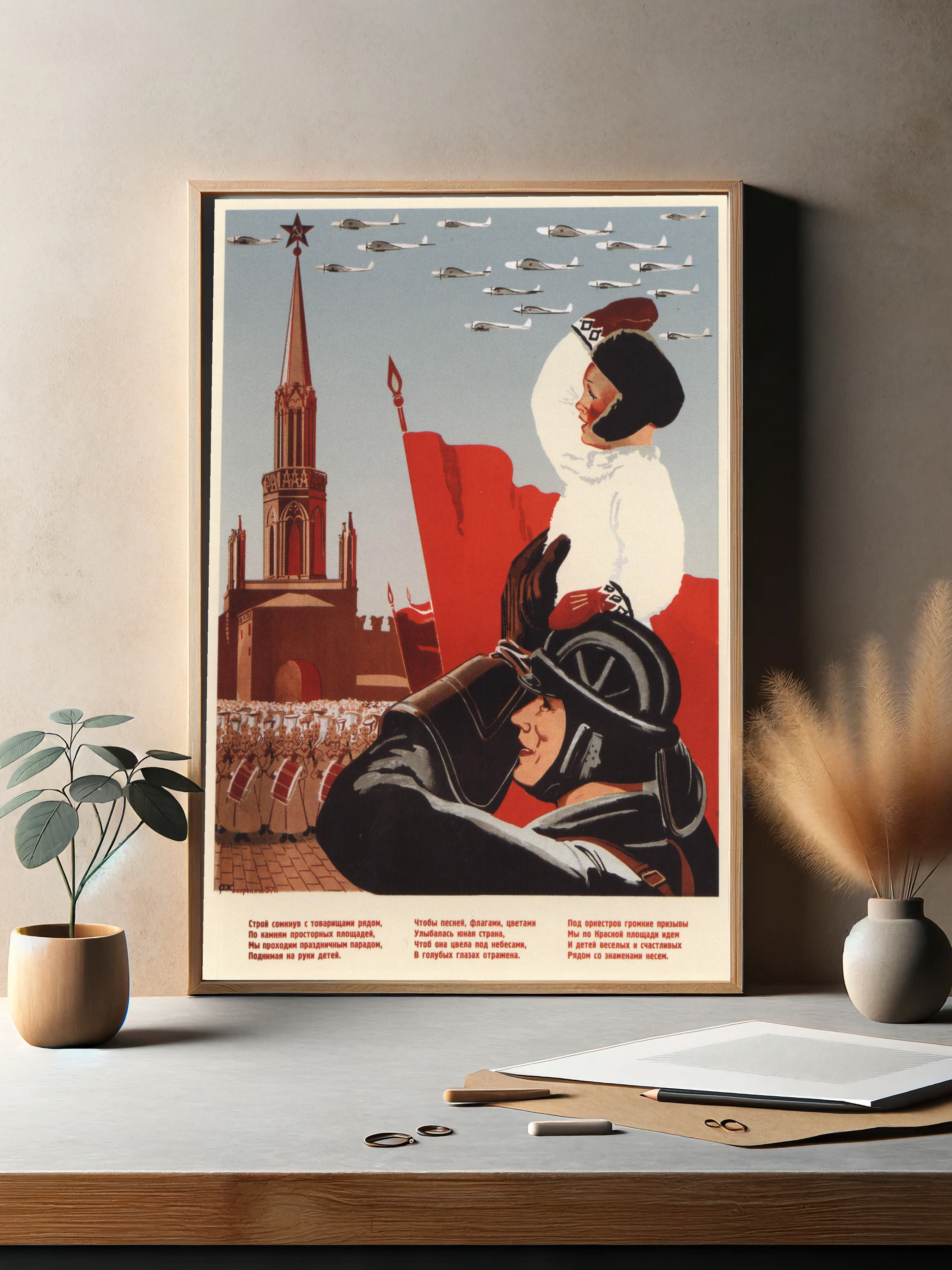 Яркая советская картина с изображением праздничного парада на Красной площади: ребенок и солдат в центре внимания, красные флаги, боевые самолеты в небе и знаменитая Спасская башня. Стиль ретро с акцентом на патриотизм и единство, декоративный настенный декор и интерьерное искусство для гостиной или офиса.