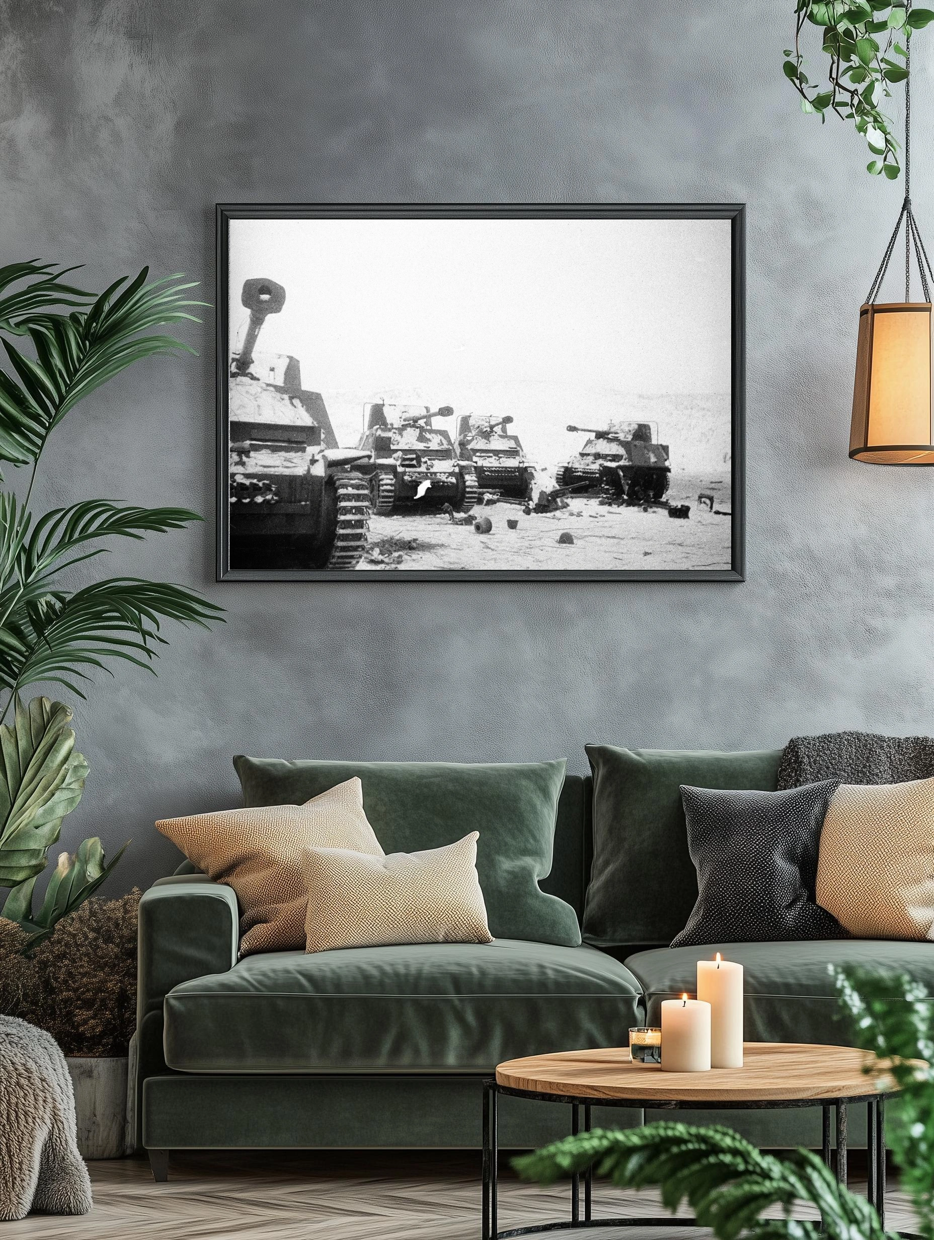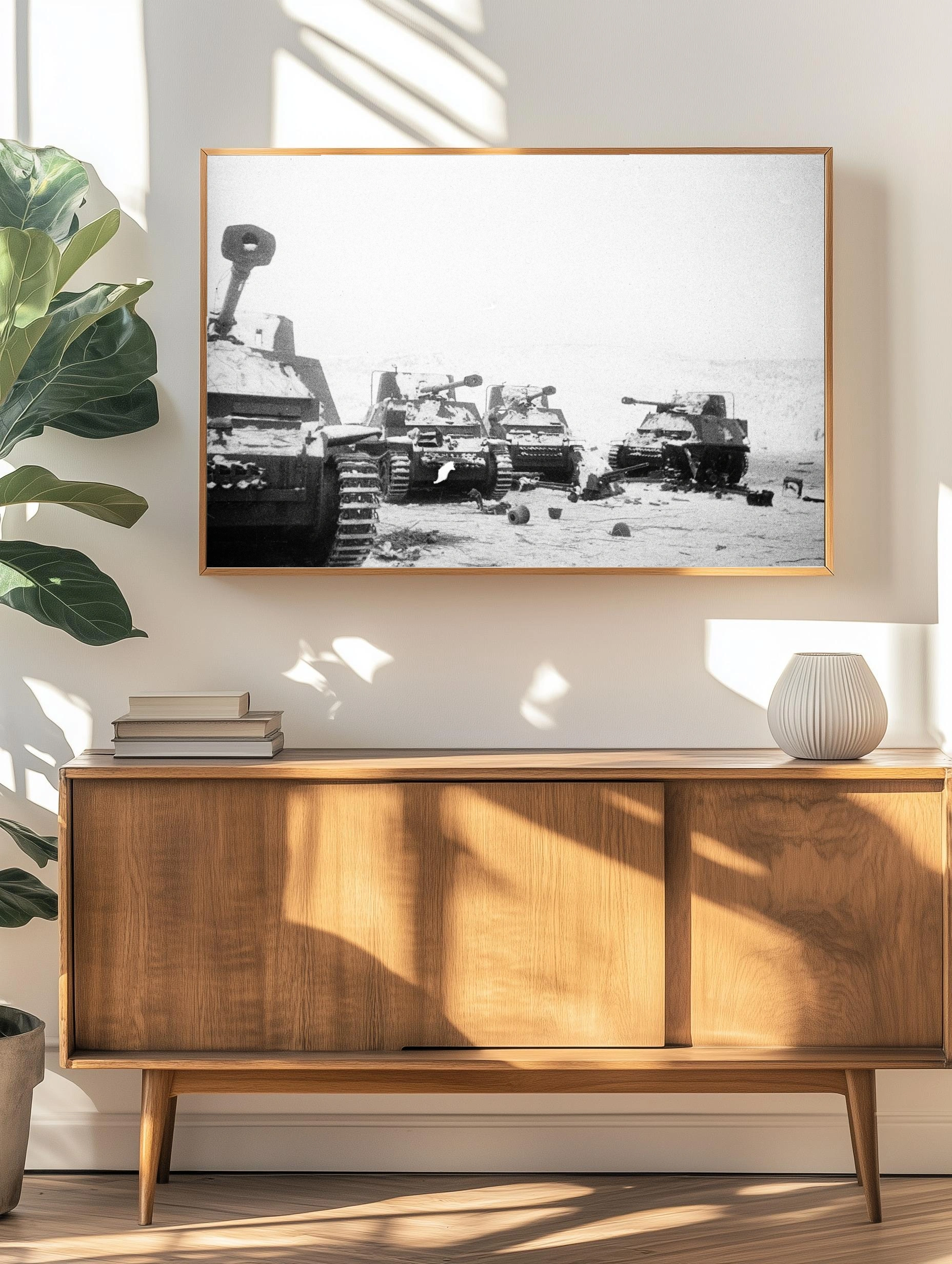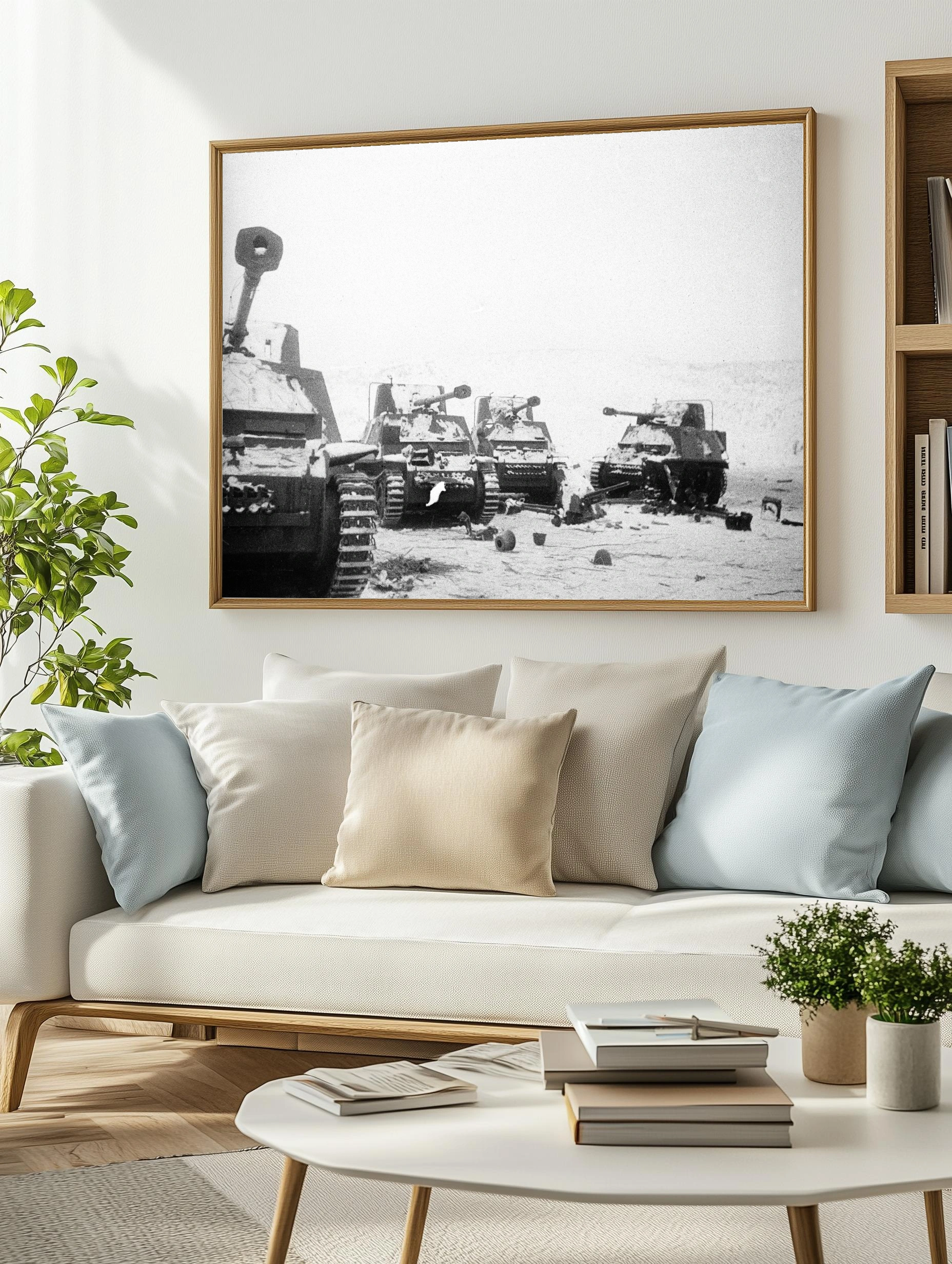 Черно-белое историческое изображение с рядами танков на фоне открытого поля. Фотография запечатлела детали военной техники времен Второй мировой войны, создавая атмосферу прошлого и напоминая о значимости исторических событий. Идеально подойдет для оформления офисов и интерьеров, связанных с военной тематикой.