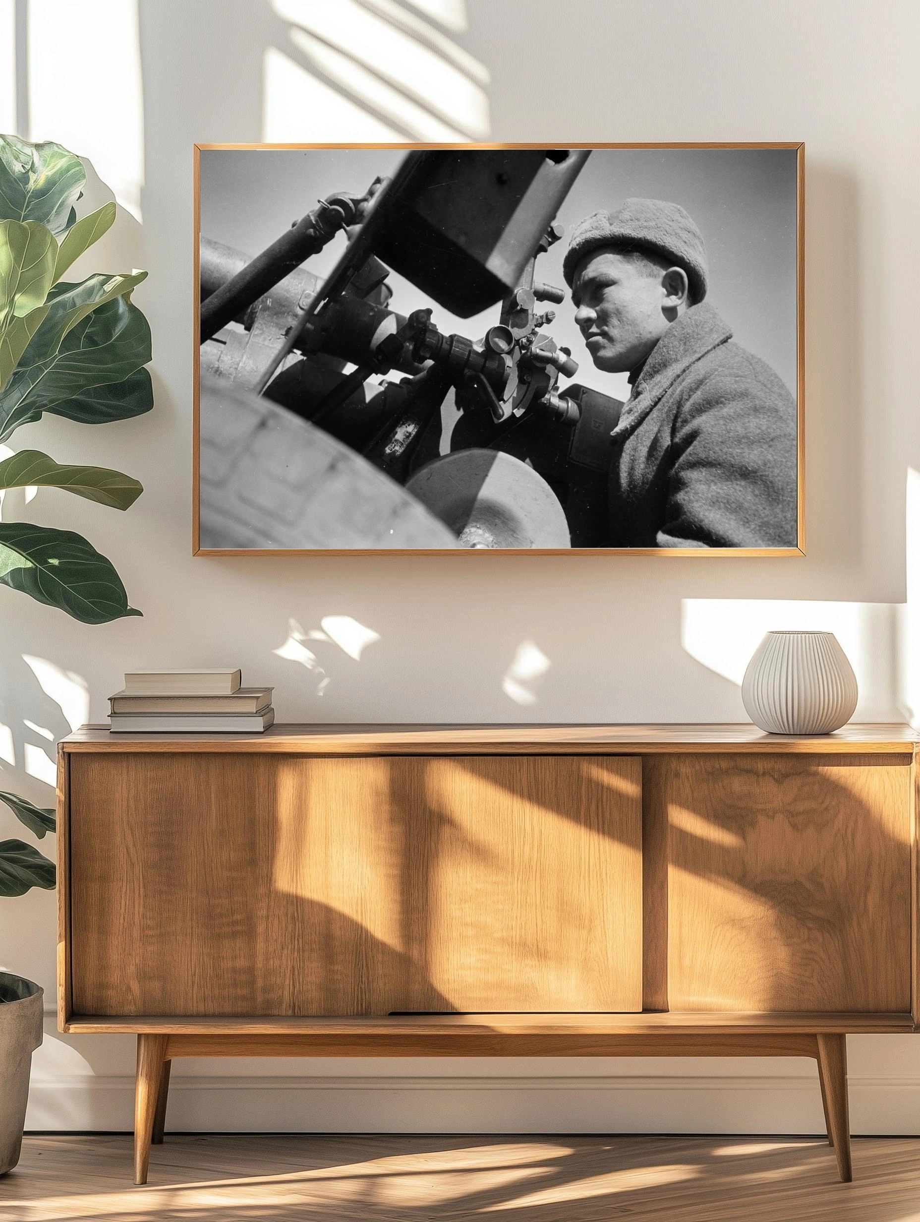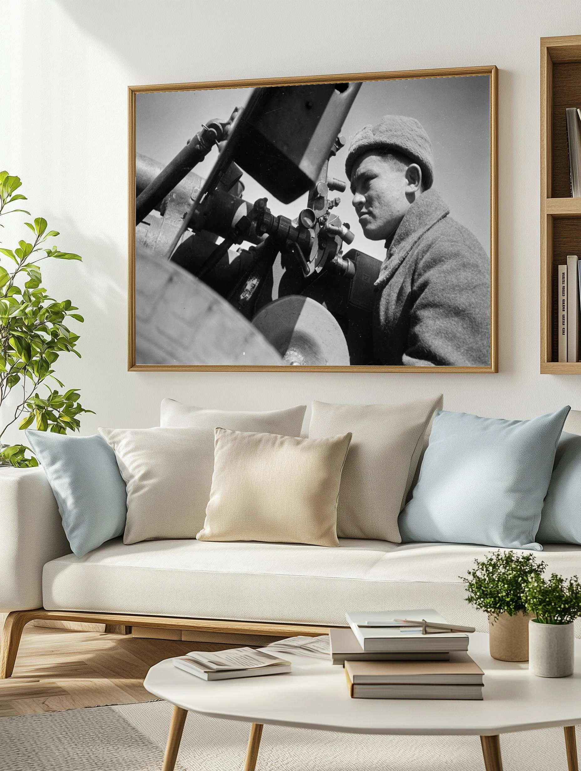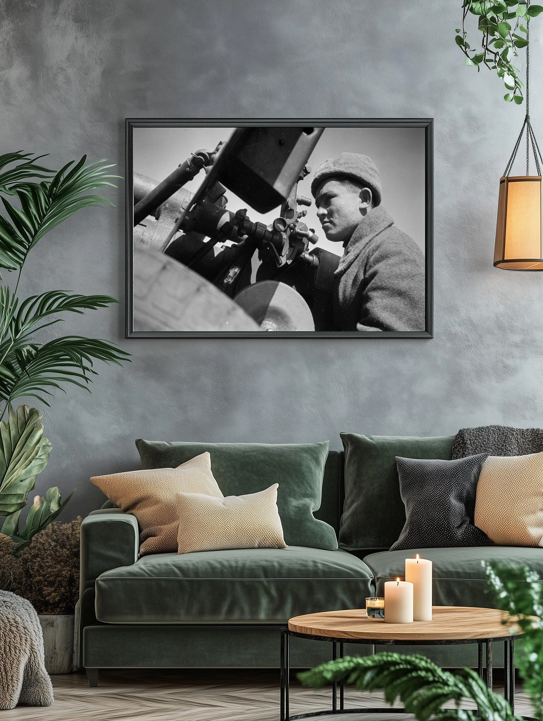 Черно-белая фотография показывает солдата в военной форме с меховой шапкой, внимательно осматривающего прицел артиллерийского оружия. Стиль ретро, атмосфера напряженности и концентрации, передающая важный исторический момент. Подходит как интерьерное искусство, декоративный плакат и стильный декор стен.