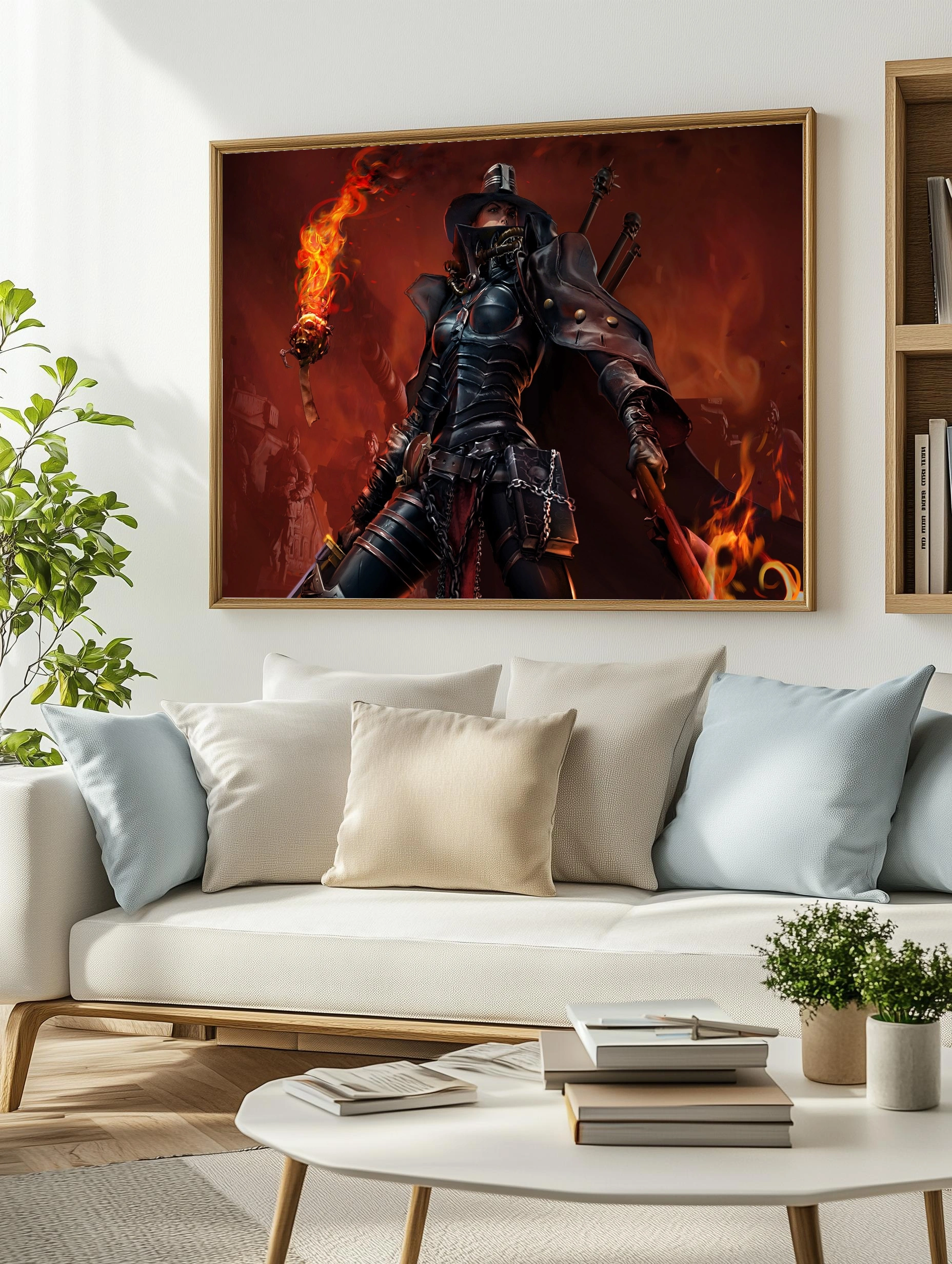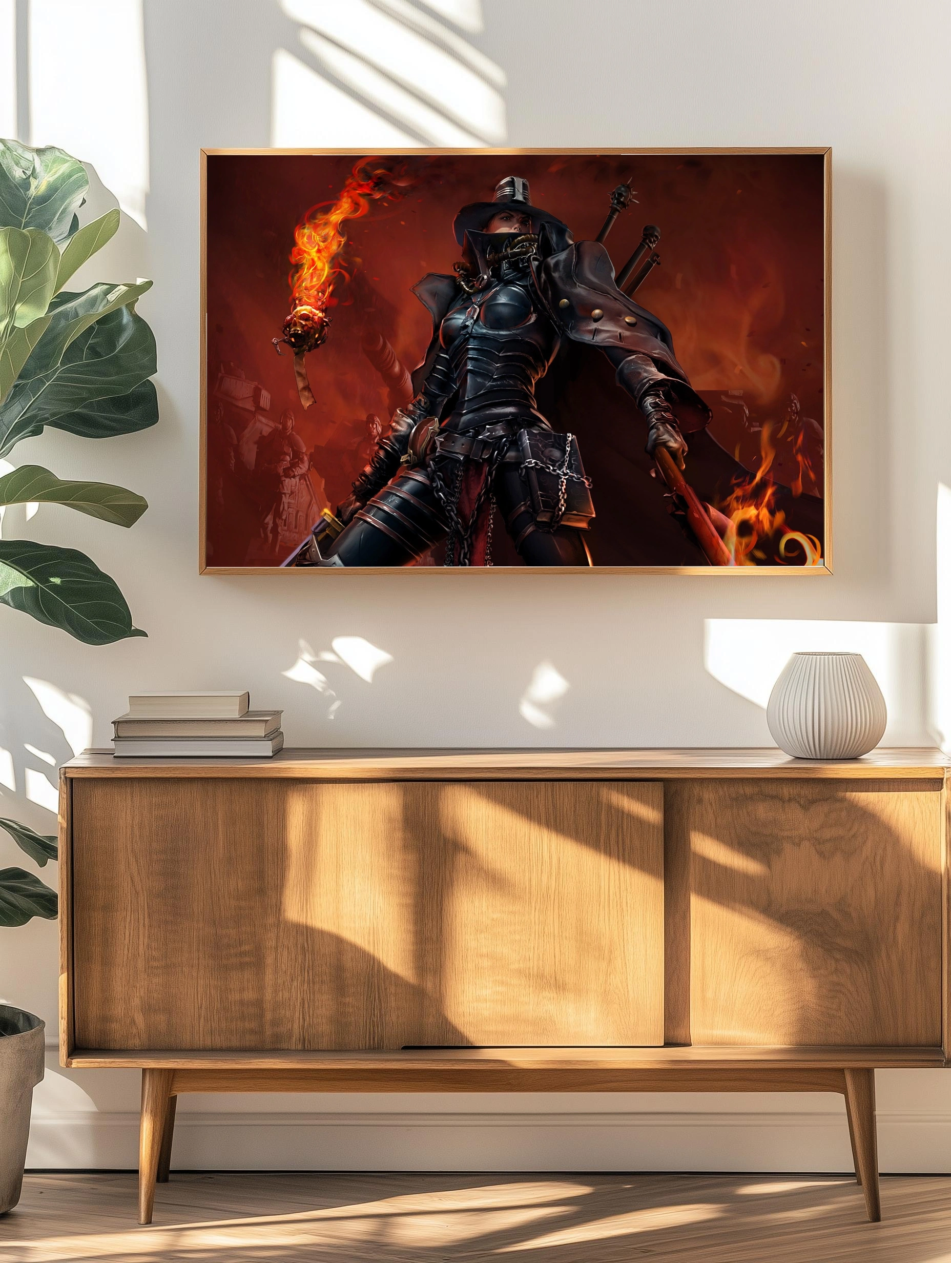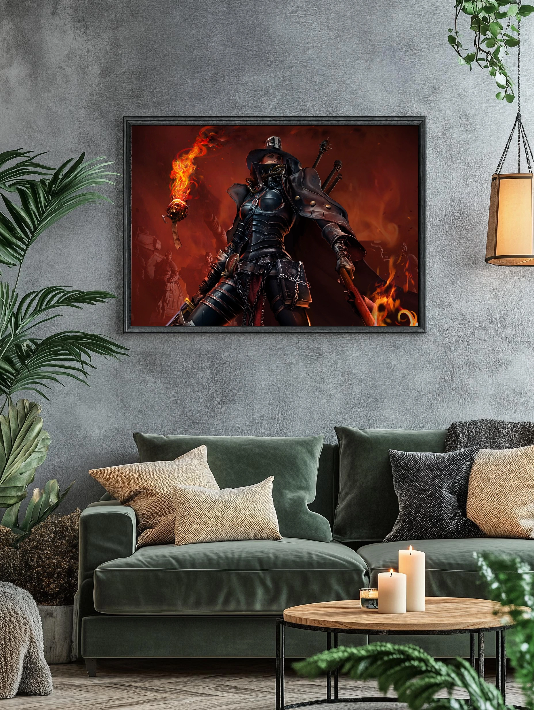 Изображение в жанре темного фантастического искусства показывает воительницу в тяжелой броне и широкополой шляпе, держащую горящий факел. Атмосфера загадочна и напряжённа, с акцентом на огненные оттенки, что создаёт эффект драматичности и мистики. Отличный интерьерный арт для поклонников фэнтези и эпических сюжетов с элементами современного искусства для стен.