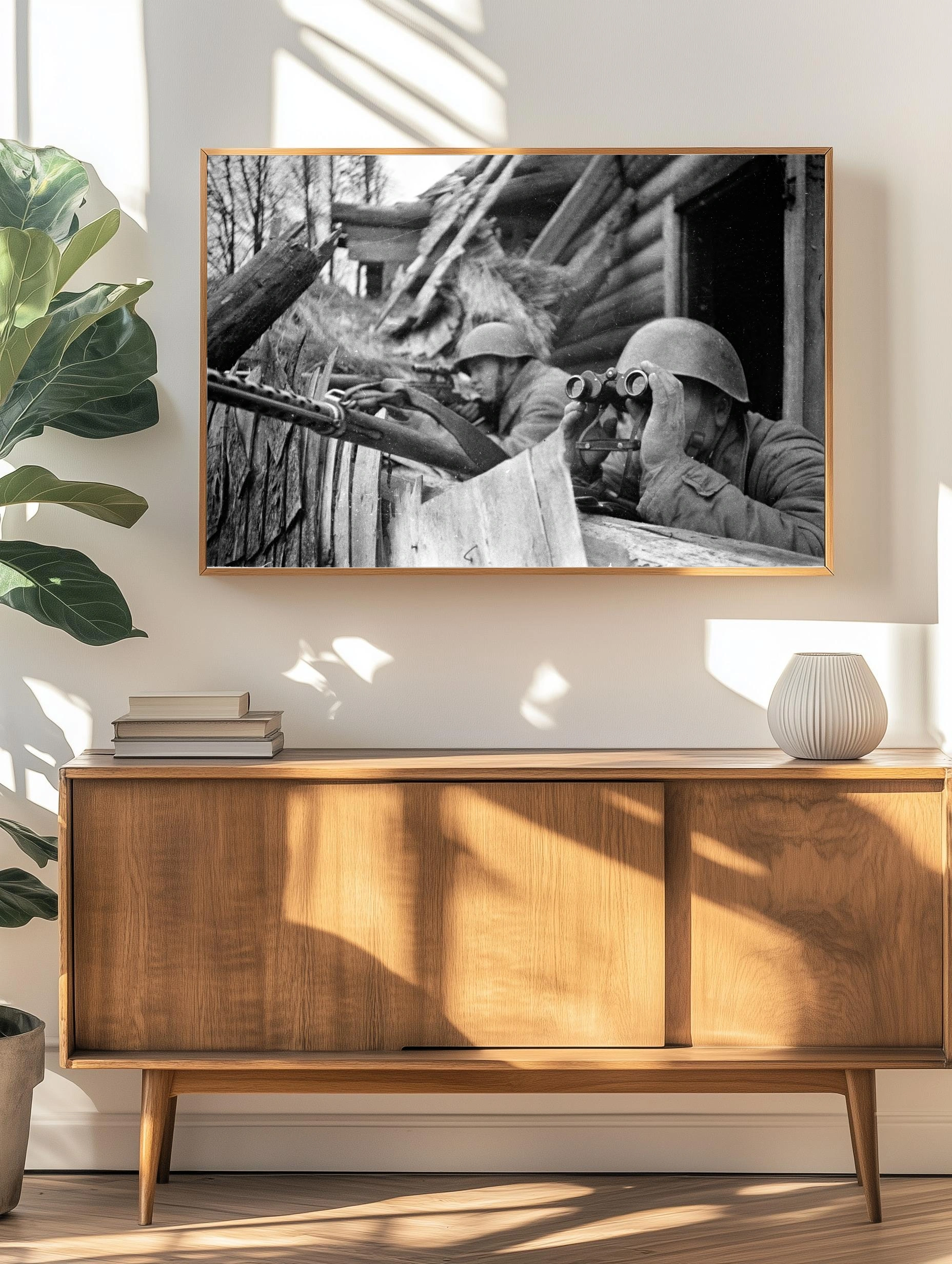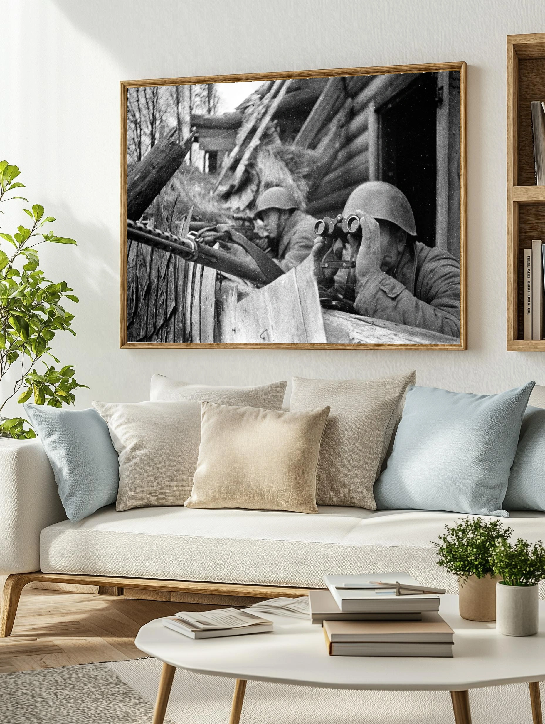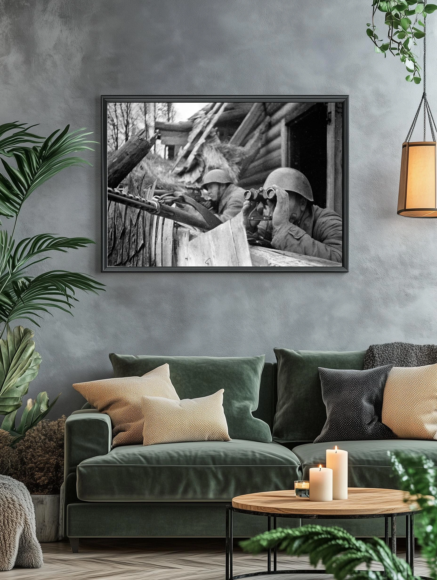 Историческая черно-белая фотография изображает двух солдат в касках, находящихся в окопе возле деревянного сооружения. Один из них смотрит через бинокль, другой готовится стрелять из пулемёта. Атмосфера напряжённости и боевого ожидания передана через детали и композицию кадра. Это художественный плакат для интерьера, который подчеркнёт военную тематику и атмосферу истории в вашем доме или офисе.