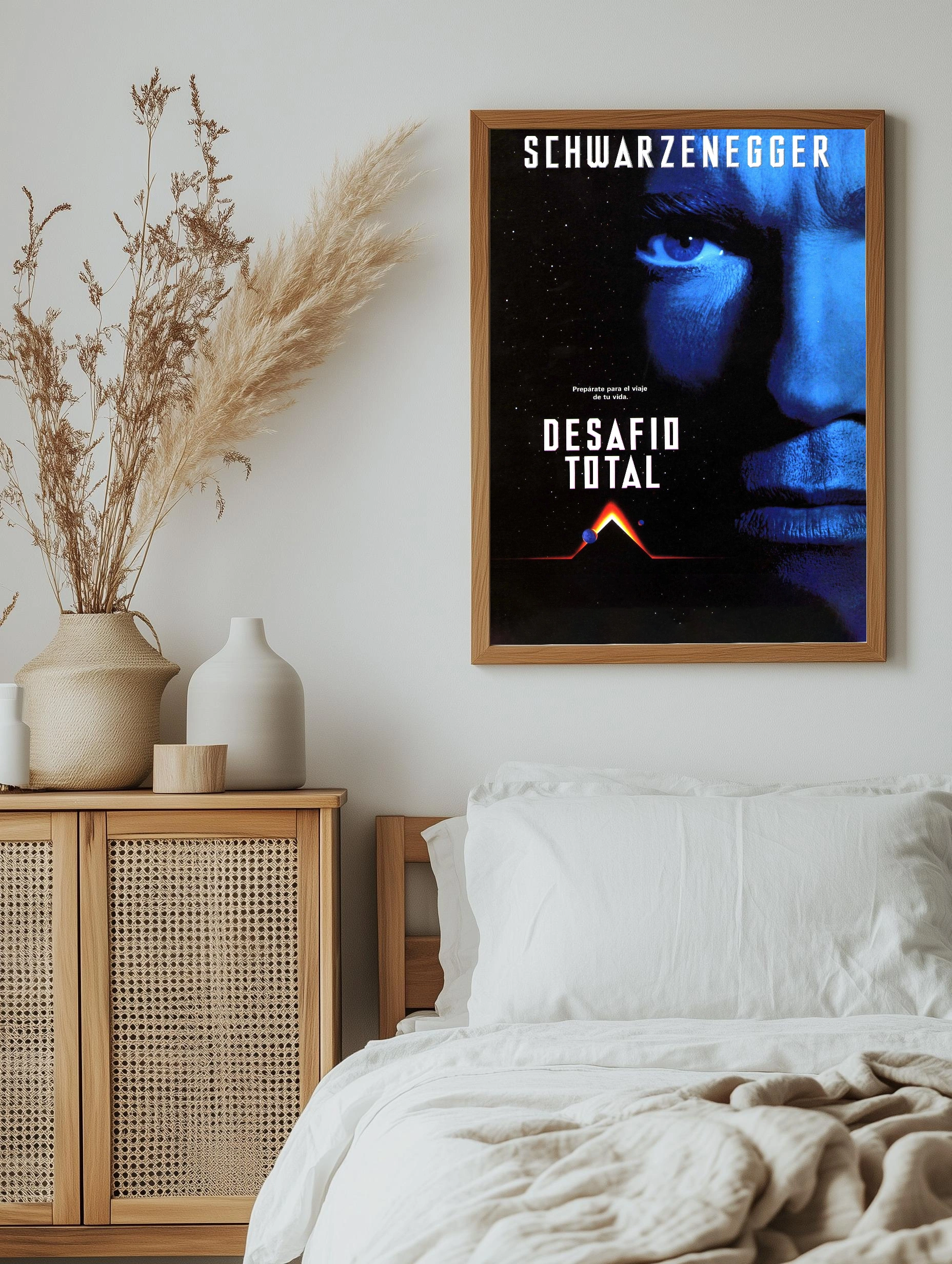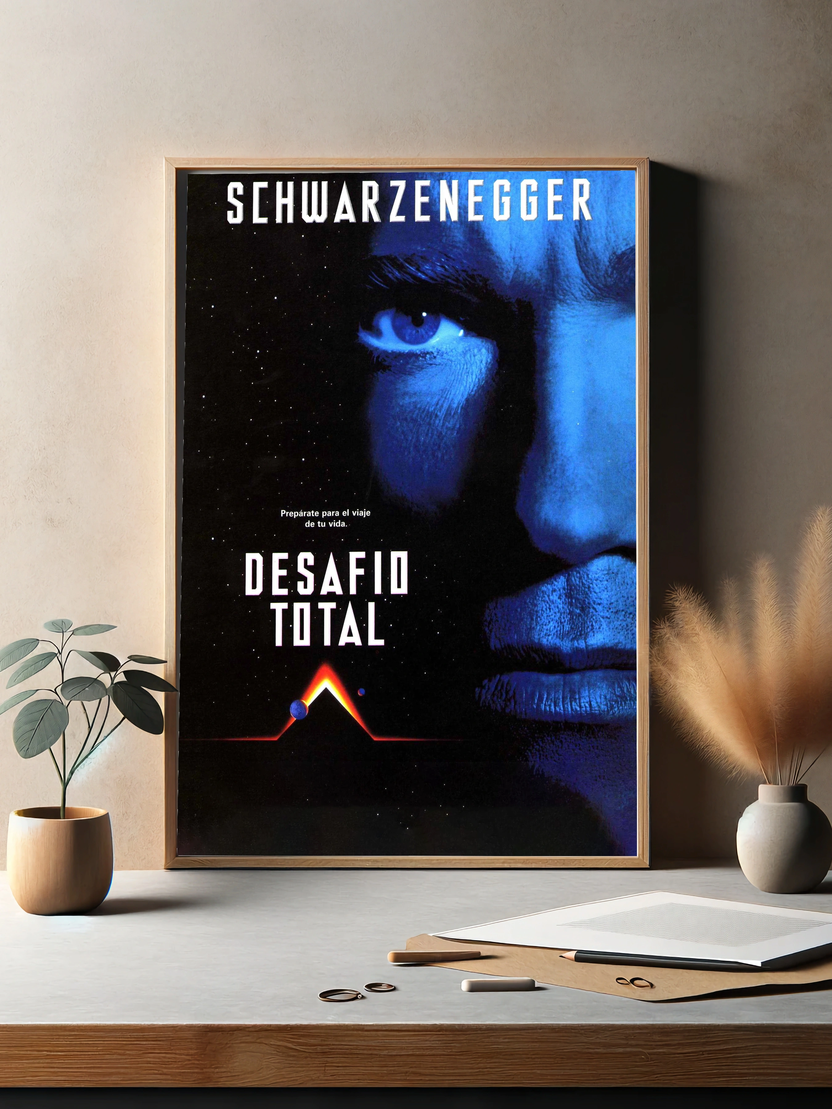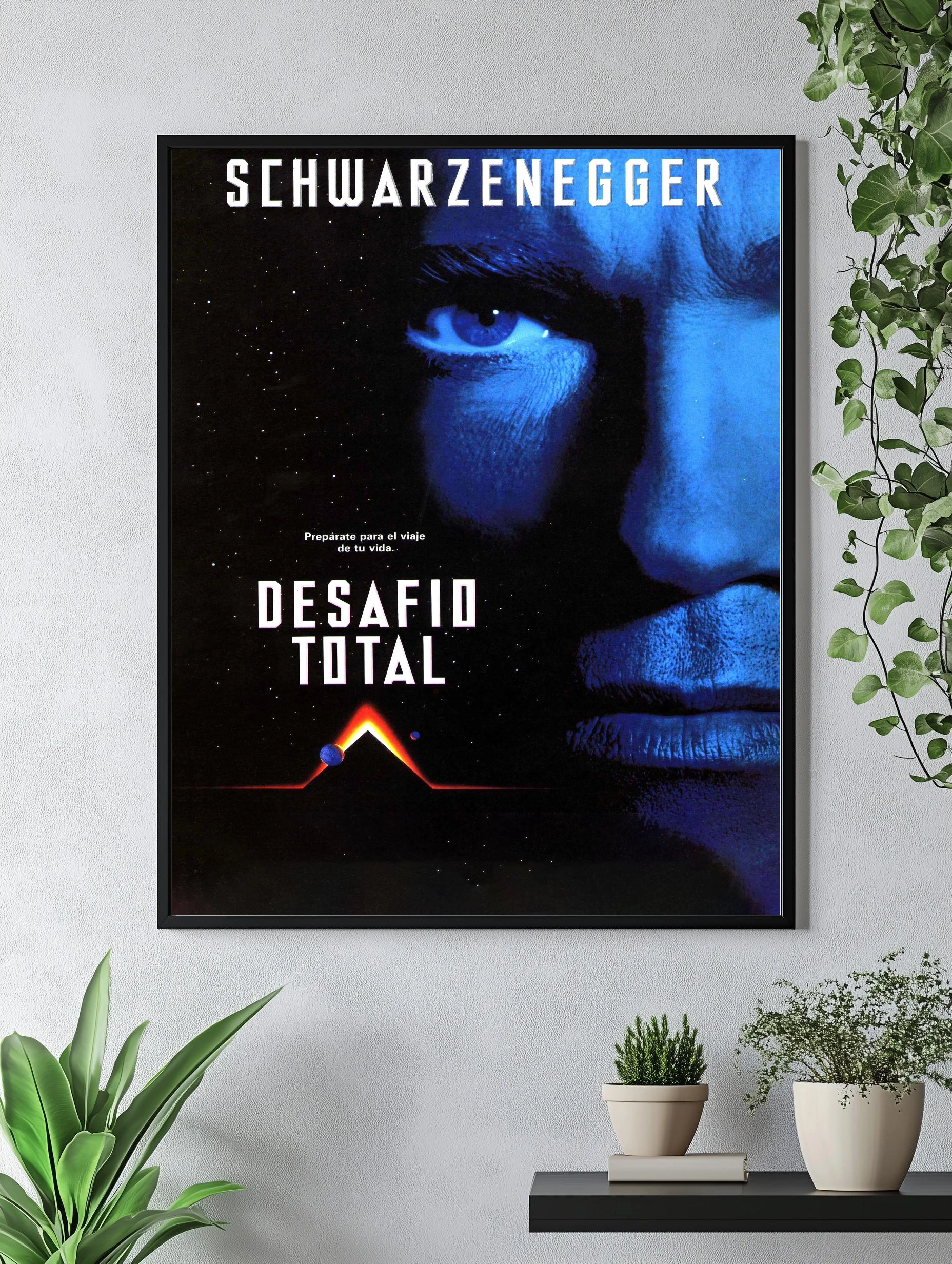 Яркий интерьерный постер с изображением Арнольда Шварценеггера в роли Терминатора. Постер выполнен в темных, космических тонах, с акцентом на его левый глаз, светящийся холодным синим цветом. Атмосфера загадочности и напряжённости подчеркивает футуристический и драматический сюжет фильма.
