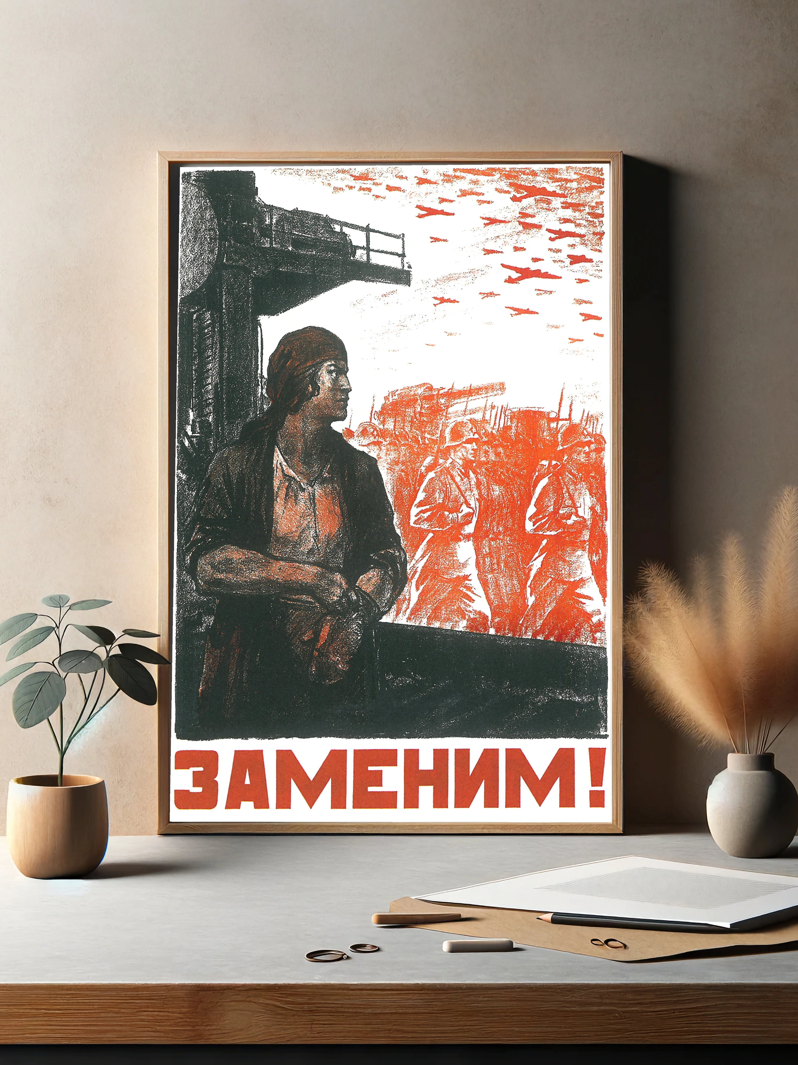Этот интерьерный постер выполнен в стиле советской пропаганды с яркими графическими элементами и сильным патриотическим посылом. Изображён образ женщины, смотрящей на уходящих на фронт солдат и самолёты в небе, что символизирует готовность заменить мужчин в тылу ради победы. Постер идеально впишется в офис или гостиную, подчеркивая историческую стойкость и мужество народа.