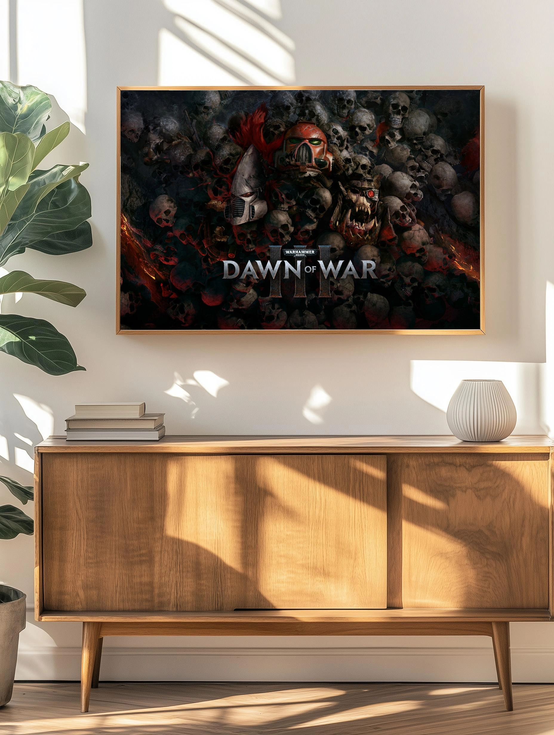 Декоративный плакат с принтом на тему игры Warhammer 40,000: Dawn of War III демонстрирует мрачную атмосферу военного конфликта в фантастической вселенной. Изображение наполнено черепами и воинскими шлемами трёх фракций, создавая эффект глубины и напряжения. Идеально подходит для современного интерьера в стиле фэнтези и геймерской тематики.