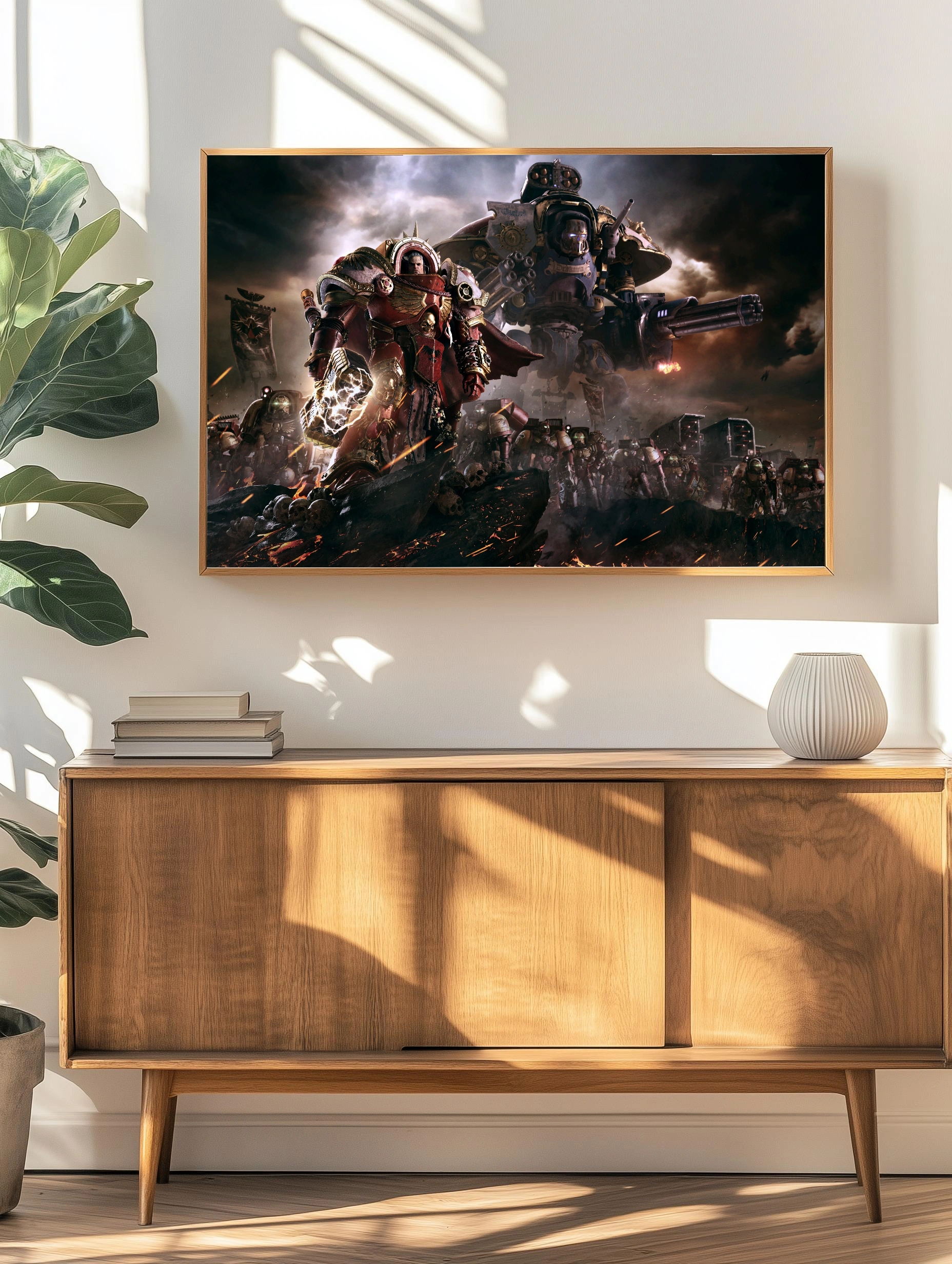 Изображение показывает драматическую сцену с главным героем в массивных красных доспехах, похожих на космического морского пехотинца из вселенной Warhammer 40k. За ним стоит гигантский боевой механический робот с мощным вооружением, а вокруг множество солдат в доспехах. Атмосфера мрачная, темные облака и огненные вспышки создают напряженное настроение. Этот интерьерный арт станет эффектным декоративным плакатом для любителей военной тематики и научной фантастики.