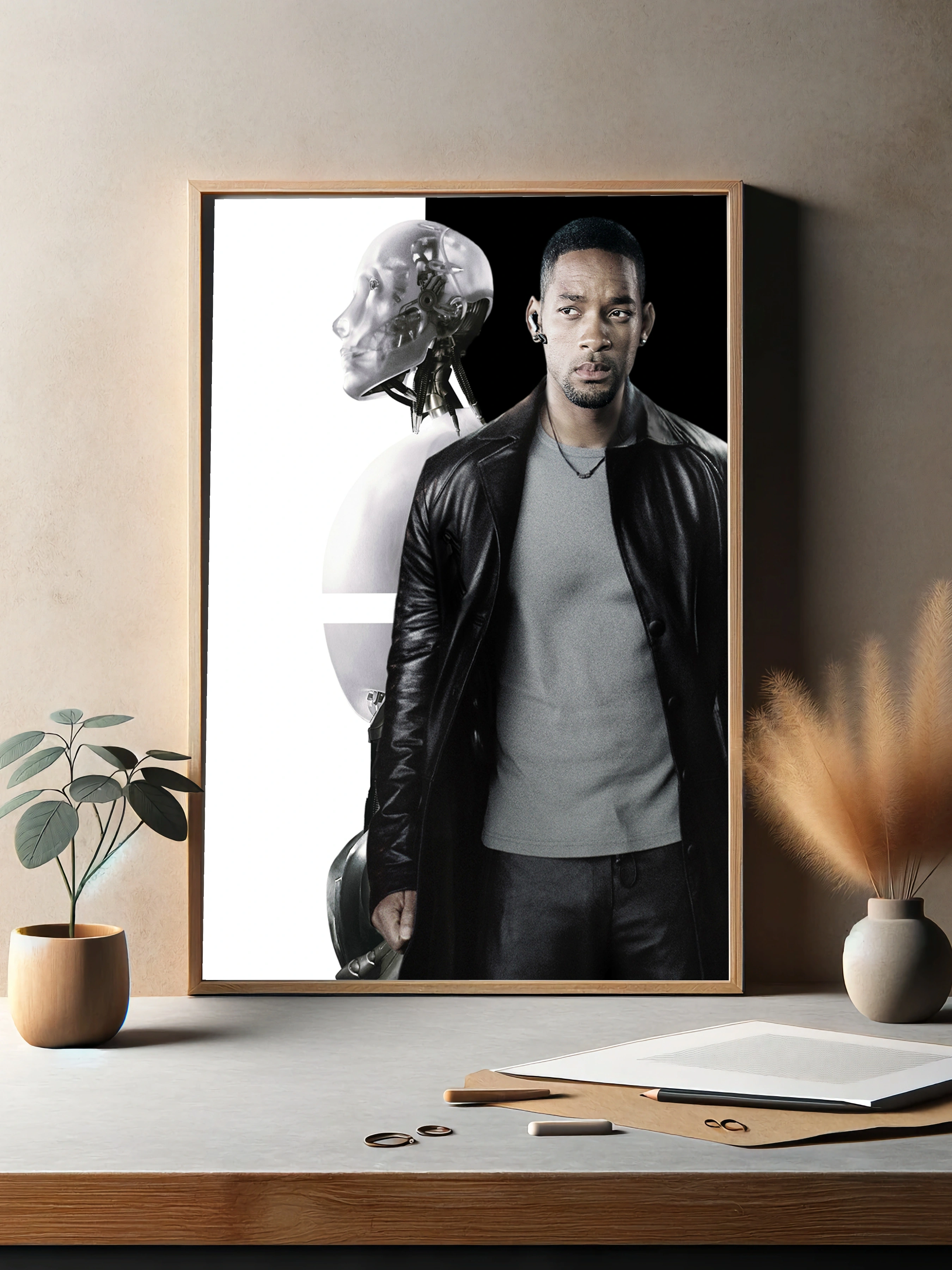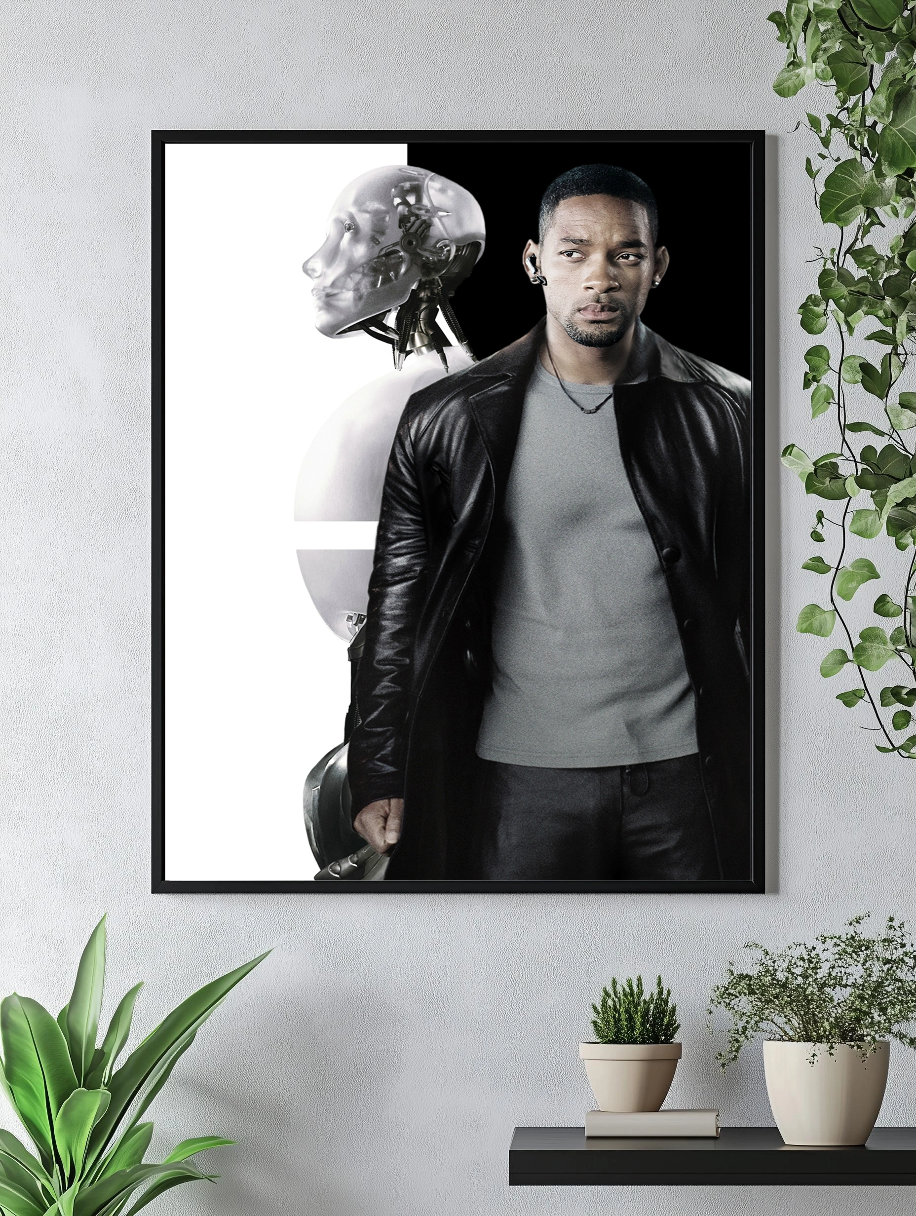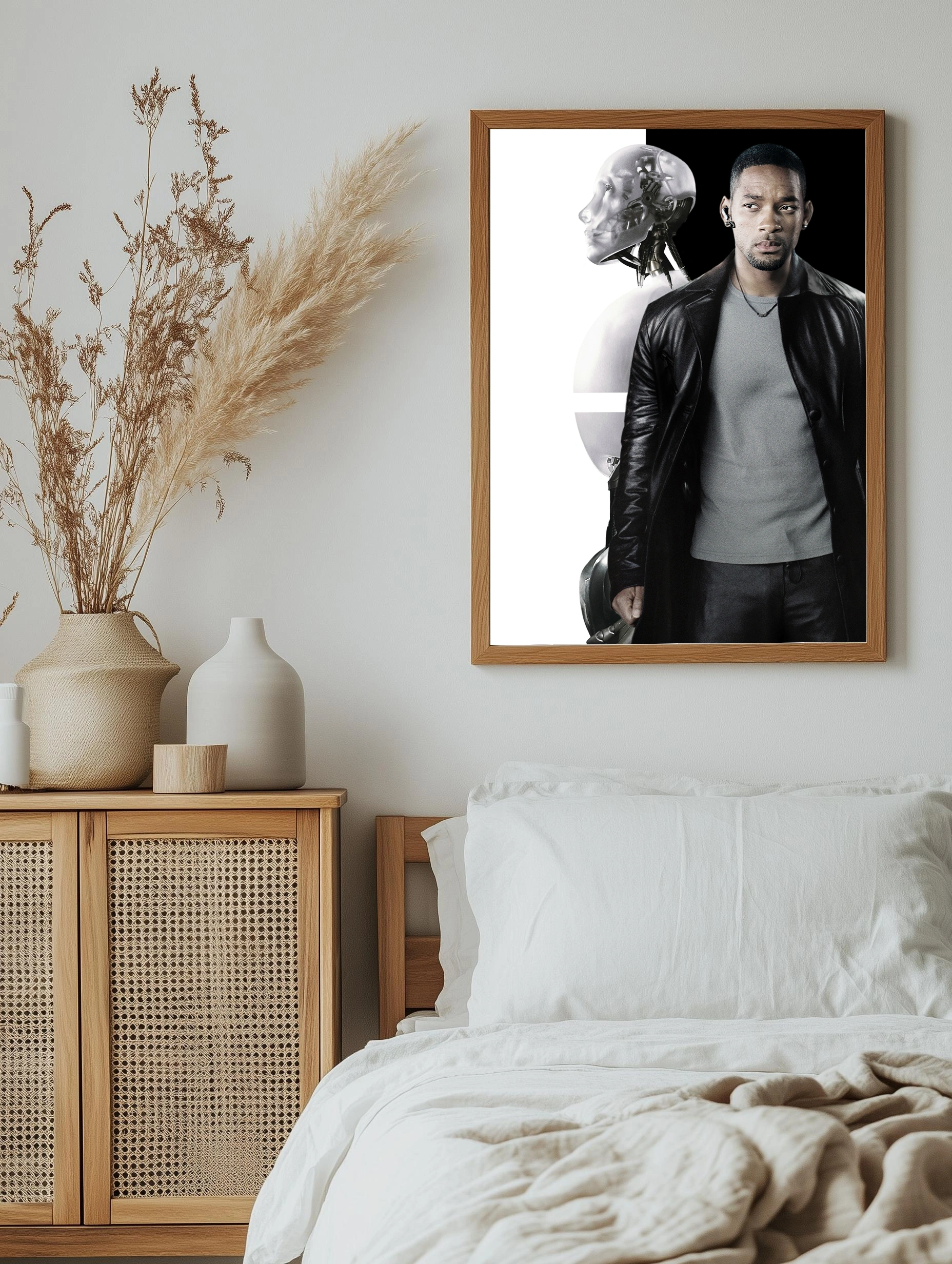Декоративный плакат с изображением реалистичного человека в кожаной куртке и футуристичного робота позади него, символизирующий взаимодействие человека и технологии. Стиль современного искусства для стен, идеально подходящий для интерьера гостиной или офиса. Такая картина для спальни или офиса добавит уникальный акцент и подчеркнёт интерес к современным темам и дизайну.