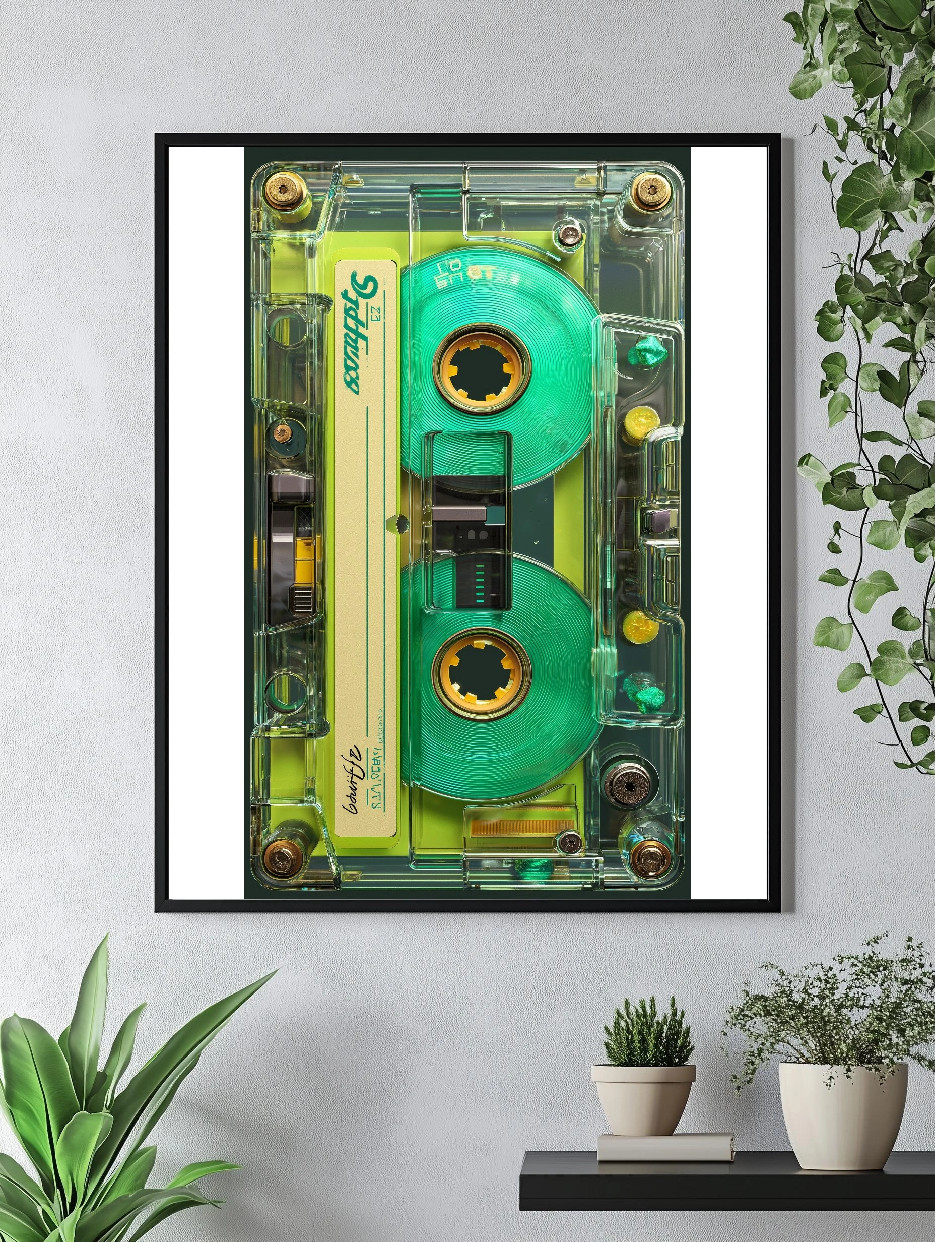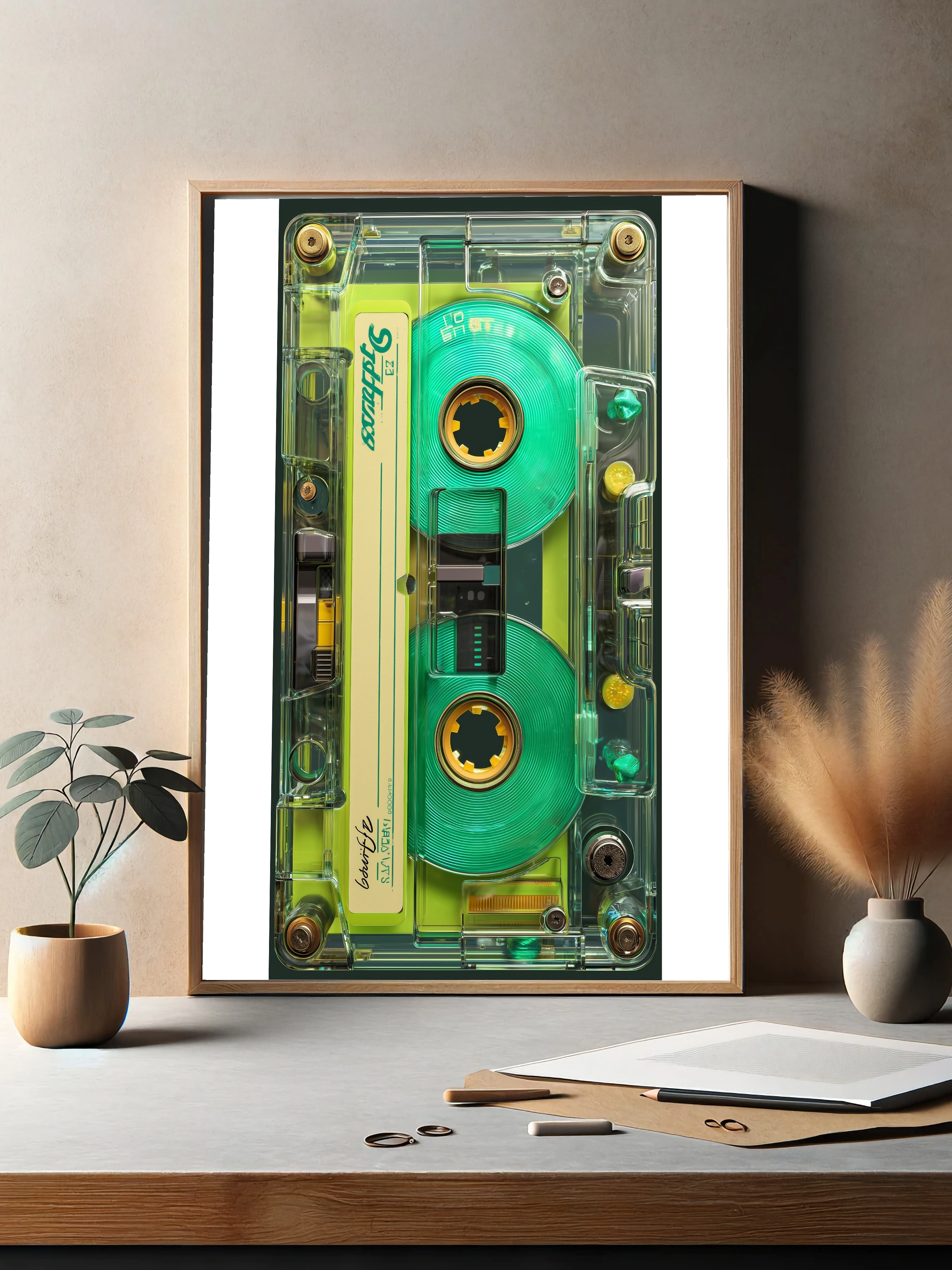 Погрузитесь в атмосферу ностальгии с этим удивительным постером, изображающим яркую кассету в ретро-стиле. Прозрачный корпус с зелеными катушками и золотыми деталями создает уникальный визуальный эффект, который привлекает внимание. На кассете видна надпись в стиле 90-х, добавляющая нотку винтажного шарма. Яркие оттенки зеленого и желтого делают этот постер идеальным акцентом для любого интерьера. Он отлично впишется в гостиную, спальню или офис, создавая атмосферу креативности и вдохновения. Этот постер станет настоящим украшением для молодежи и любителей музыки, которые ценят уникальный стиль и оригинальность.