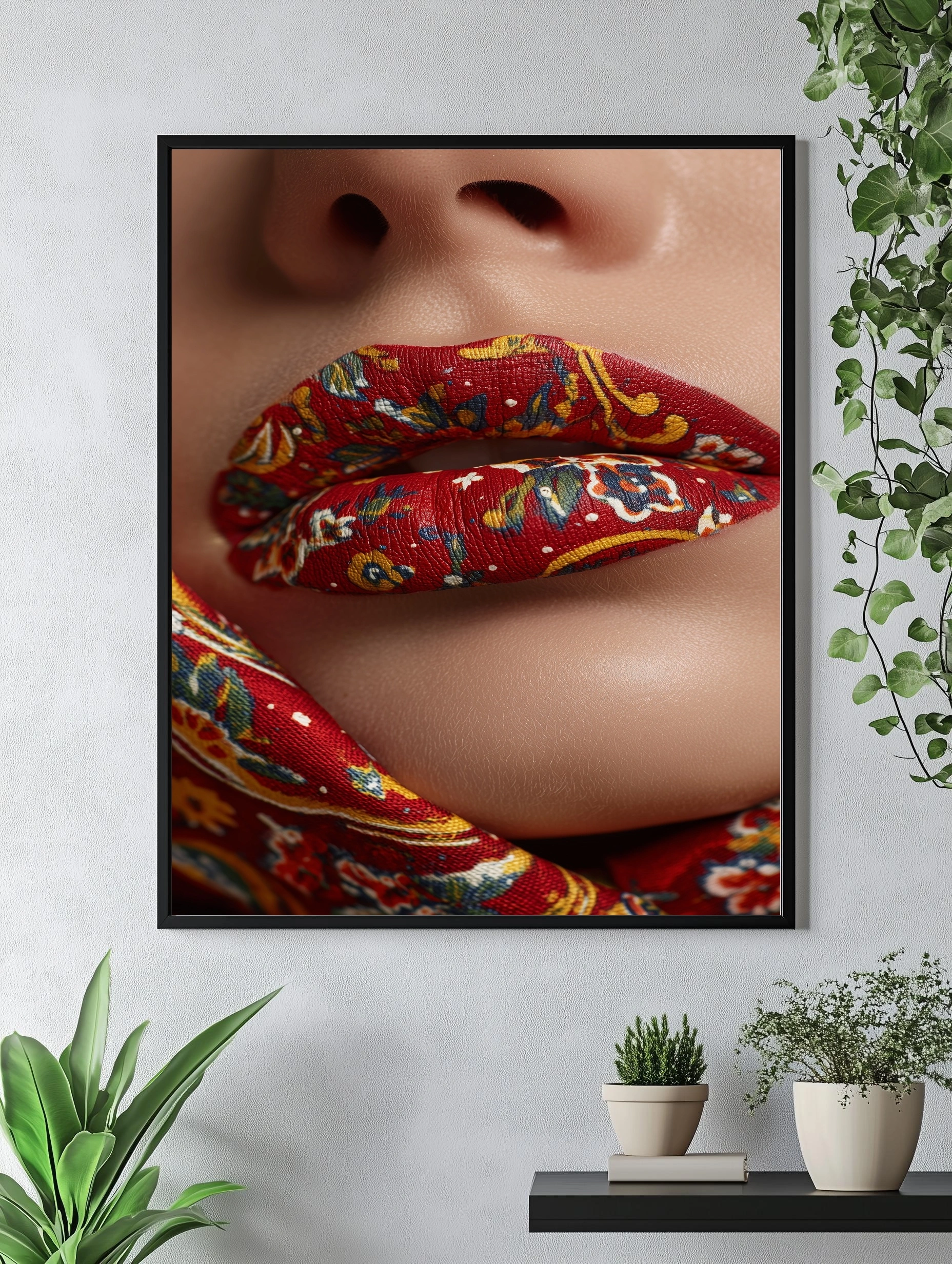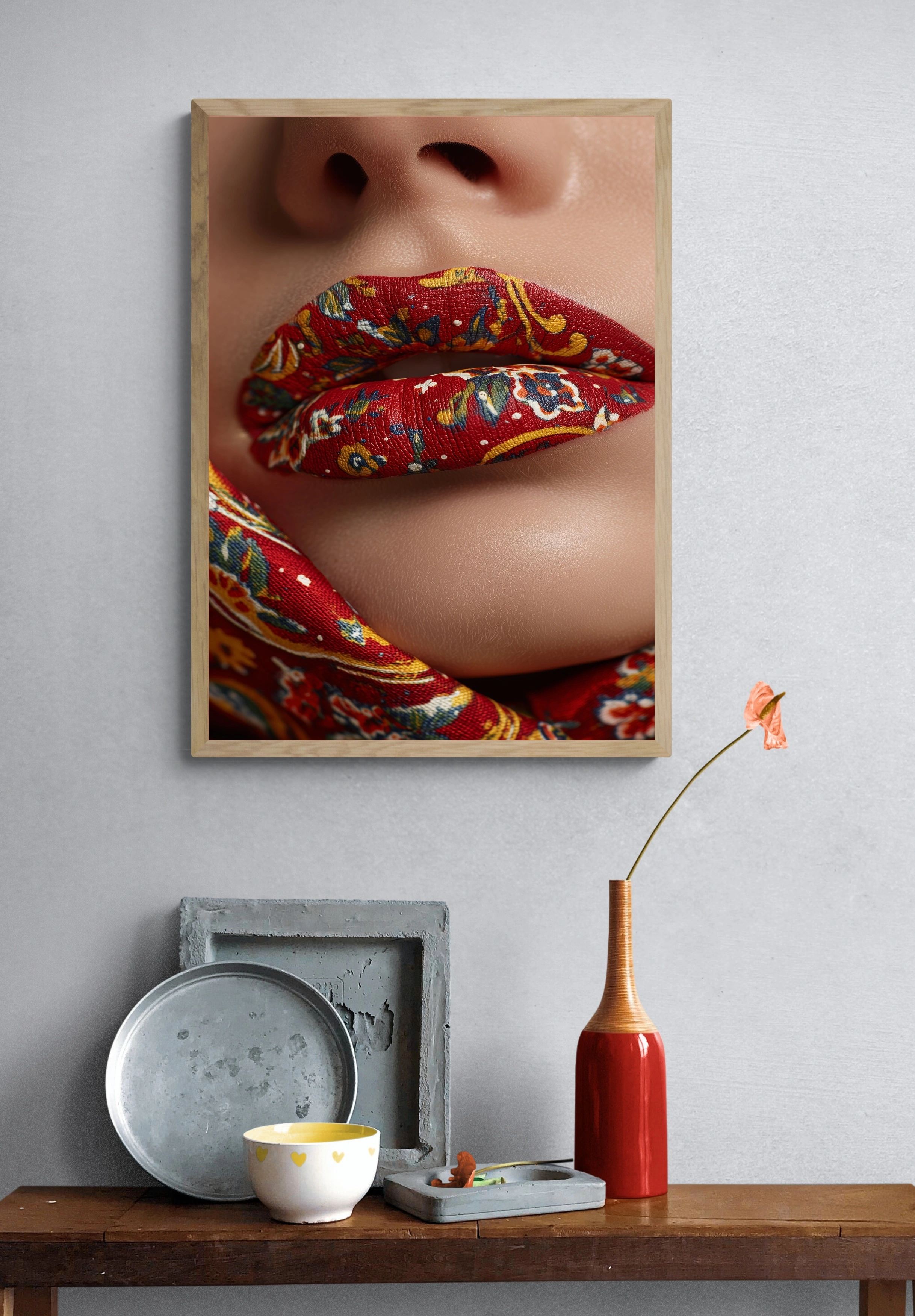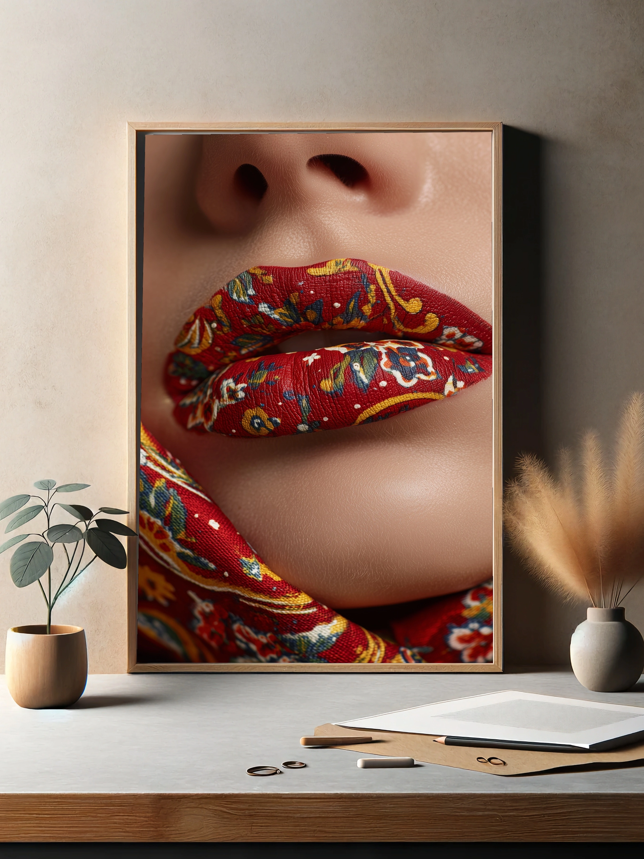 Погрузитесь в мир ярких эмоций с этим потрясающим постером, на котором изображены губы, покрытые насыщенным красным оттенком и изысканным цветочным узором. Каждая деталь, от текстуры губ до ярких акцентов в виде синих и желтых цветов, создает уникальную композицию, которая притягивает взгляд. Фон выполнен в нежных бежевых тонах, что подчеркивает красоту и выразительность губ. Этот постер в стиле фэшн-арт наполнен энергией и креативностью, идеально подходит для оформления современных интерьеров. Он станет отличным акцентом в гостиной, спальне или офисе, добавляя нотку стиля и индивидуальности. Целевая аудитория — молодежь и креативщики, стремящиеся выделиться и подчеркнуть свою уникальность.