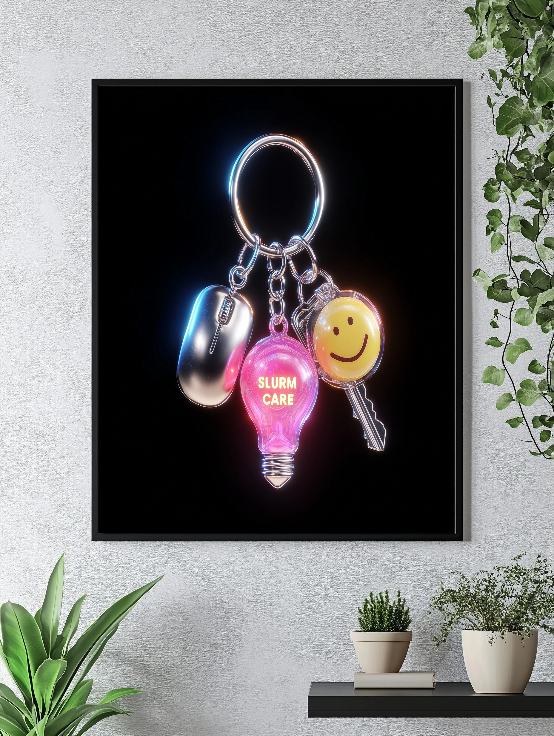 Этот постер представляет собой яркий и креативный брелок, состоящий из нескольких уникальных элементов. Главный акцент — это розовая лампочка с надписью ‘SLURM CARE’, которая излучает позитив и креативность. Рядом расположены металлический брелок в форме компьютерной мыши и ключ с улыбающимся смайлом, что добавляет игривости и современности. Цветовая гамма включает насыщенные оттенки розового, желтого и металлического, создавая контраст на фоне глубокого черного. Стиль постера — современный и минималистичный, он наполняет пространство энергией и радостью. Идеально подойдет для оформления молодежных пространств, креативных офисов или детских комнат. Целевая аудитория — молодежь и креативщики, ищущие вдохновение и позитив в своем окружении.